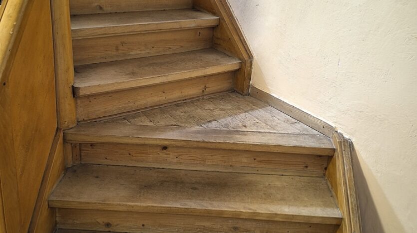 Das Obergeschoss ist durch die Haupteingangstür über die gut erhaltene Holztreppe zu erreichen. Hier sind bereits ein offener Wohnraum, eine Küche und drei Schlafzimmer sowie ein Bad ausgebaut. Im Dachgeschoss sind noch zwei ungenutzte Mansardenzimmer als Ausbaureserve vorhanden und weitere ausbaufähige Nutzfläche. Im Nebengebäude besteht vom 1. Obergeschoss aus ebenfalls noch Ausbaupotential, das bisher nicht erschlossen wurde.