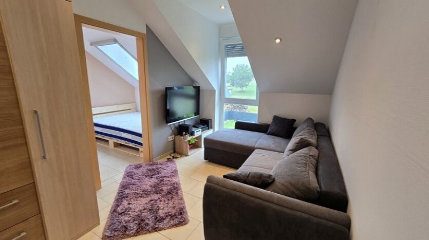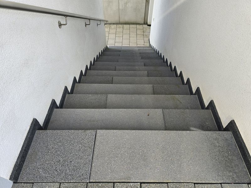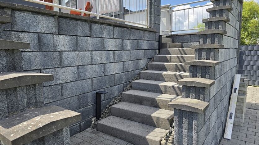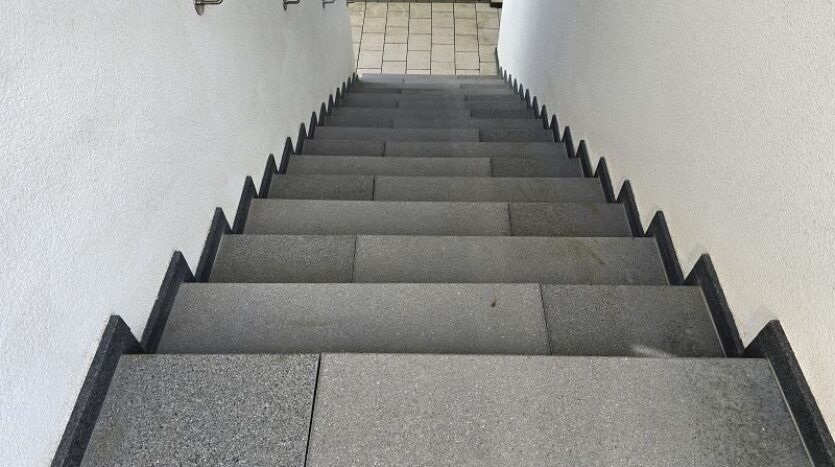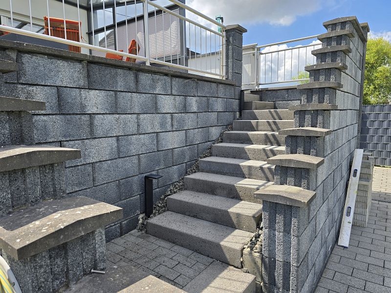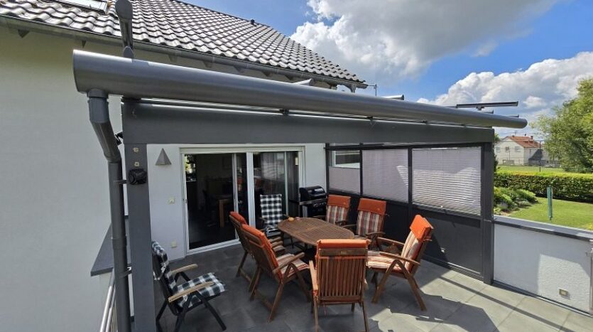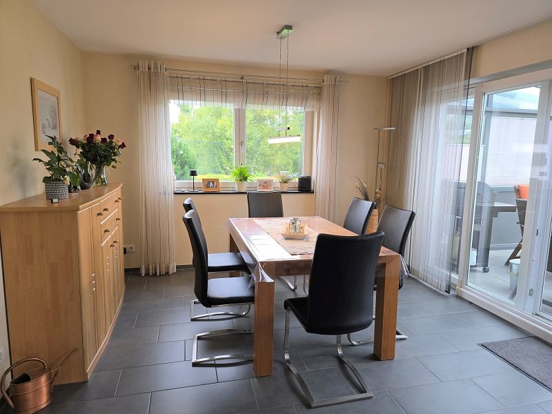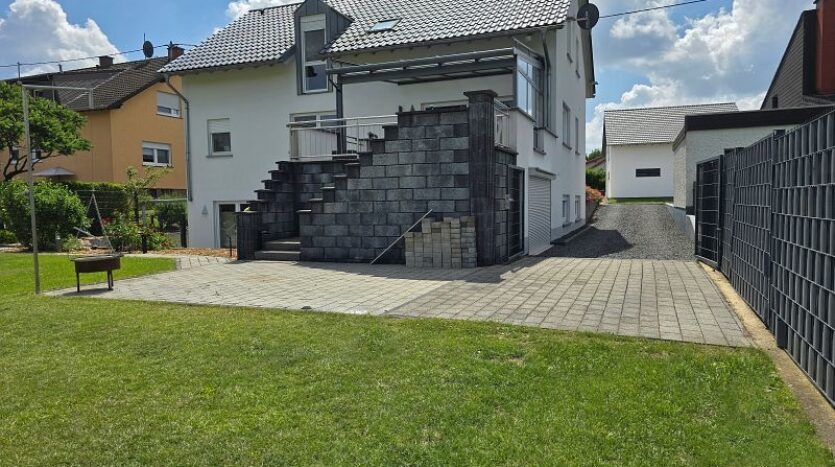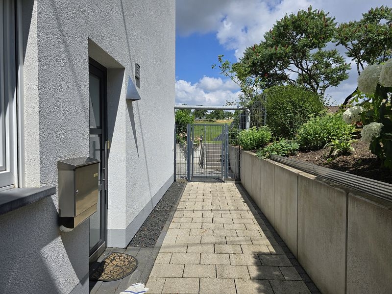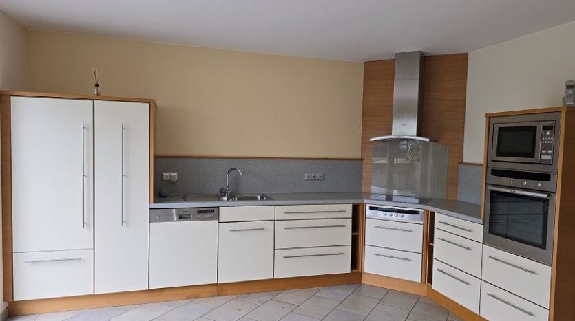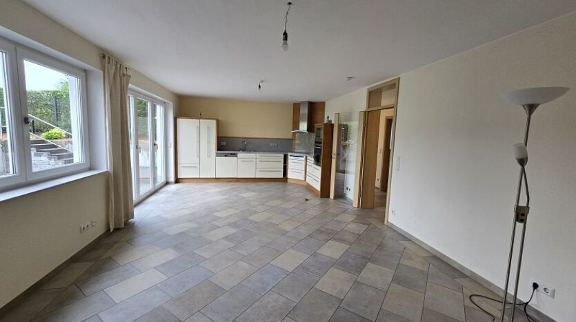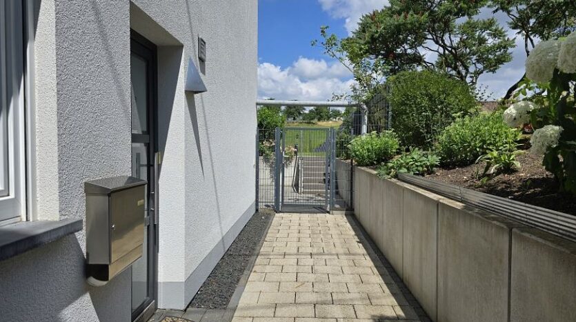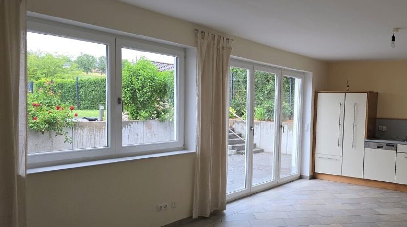Zwischen Wohnhaus und Garage führt eine Treppe zur ca. 82 m² großen Einliegerwohnung. Die Wohnung verfügt über zwei Schlafzimmer, ein Tageslichtbad mit Dusche und Badewanne, ein Hauswirtschafts- und Stauraum und einen sehr geräumigen Wohn- und Essbereich mit offener Küche inklusive Einbauküche. Von hier aus gelangt man stufenlos auf die große Außenterrasse.