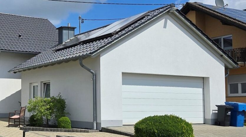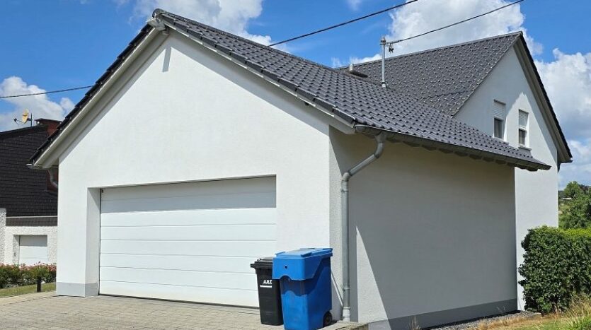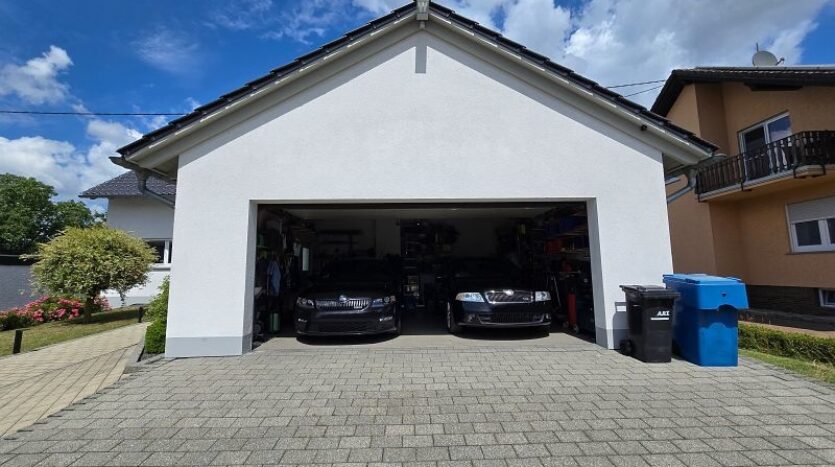 Die vollständig unterkellerte Doppelgarage mit elektrischem Sektionaltor bietet Platz für zwei große Autos inklusive sämtlichem Zubehör. Weitere Außenstellplätze stehen auf dem gepflasterten Hof und in der Einfahrt bereit. Im Kellergeschoss der Garage ist gut zugänglich die gesamte Haustechnik inklusive Heizung untergebracht.