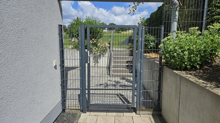 Links am Wohnhaus befindet sich eine verschließbare Zufahrt zum Gartengrundstück hinter dem Haus.