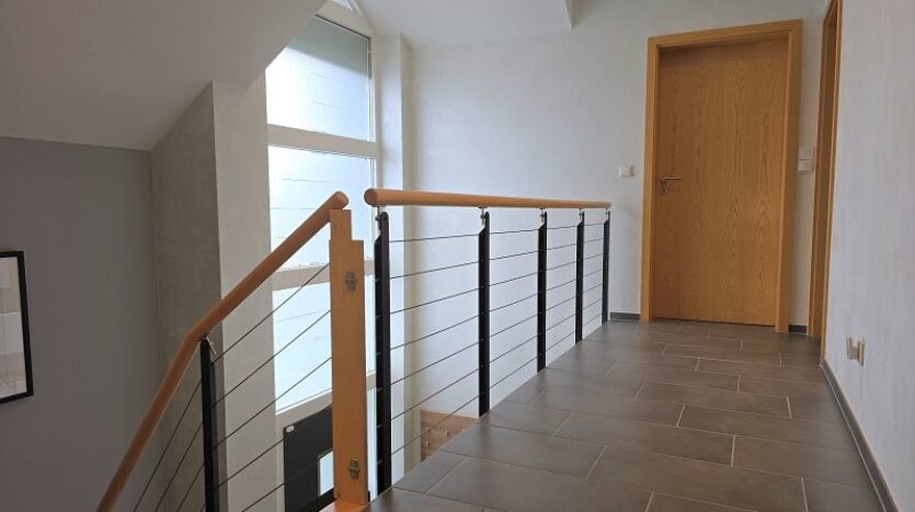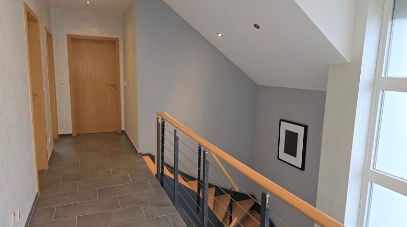 Eine moderne und offene Treppe führt in das Obergeschoss. Durch die offene und moderne Bauweise erreicht man über die lichtdurchflutete Galerie alle Räume dieser Wohnebene. Hier stehen drei Schlafzimmer unterschietlicher Größe, ein Hauswirtschaftsraum und ein Tageslichtbad mit großer begehbarer Dusche und einer sehr geschmackvoll integrierten freistehenden Badewanne bereit.