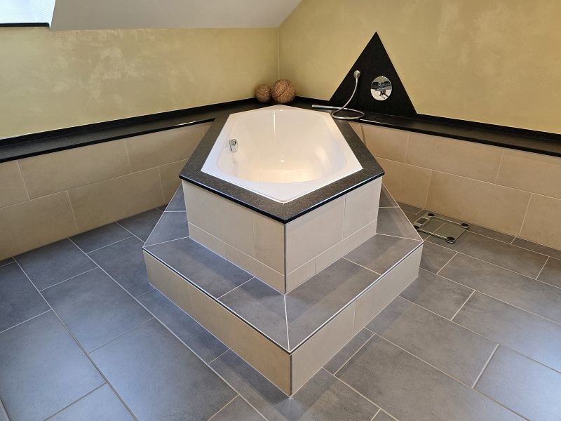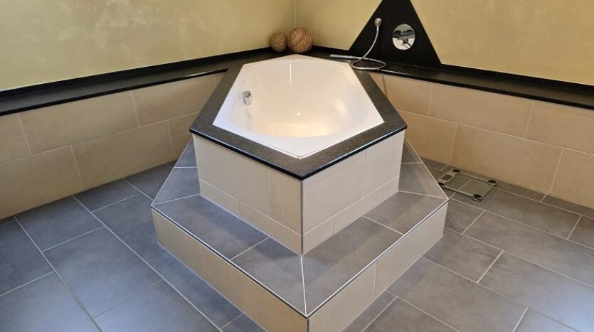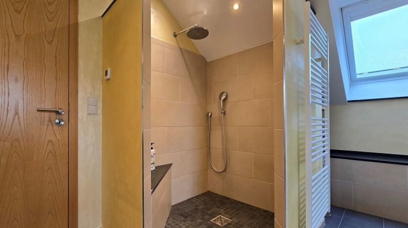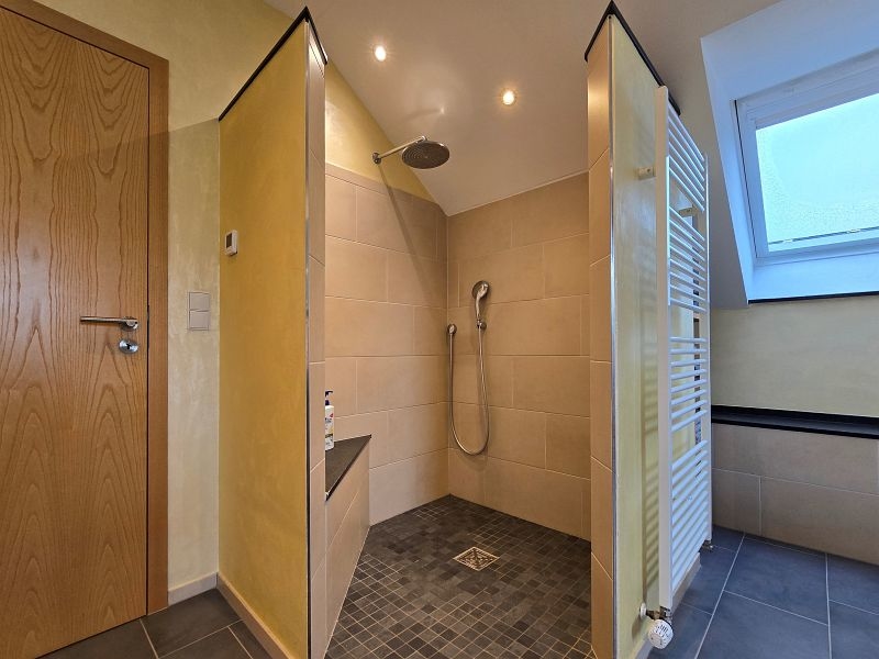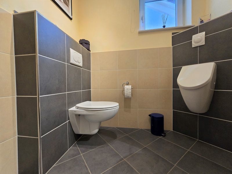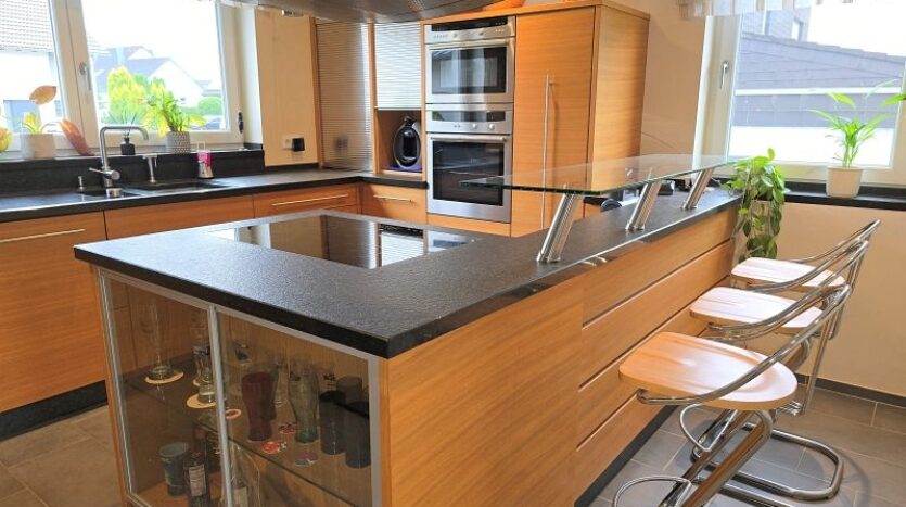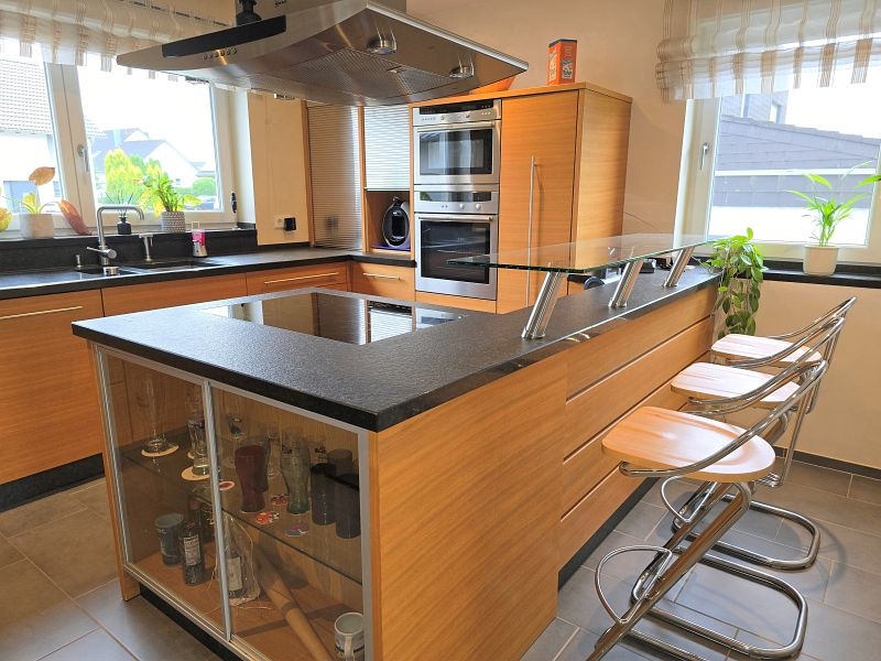 Im Erdgeschoss befinden sich die Diele, der großzügige Wohn- und Essgereich mit direktem Zugang zur hochwertig überdachten Außenterrasse mit elektrischer Beschattung, die große Küche inklusive hervorragend ausgestatteter massiver Einbauküche inkl. Granit Arbeitsplatte, ein Schlaf- oder Gästezimmer, ein Gästebad mit Dusche und ein großer Vorratsraum.