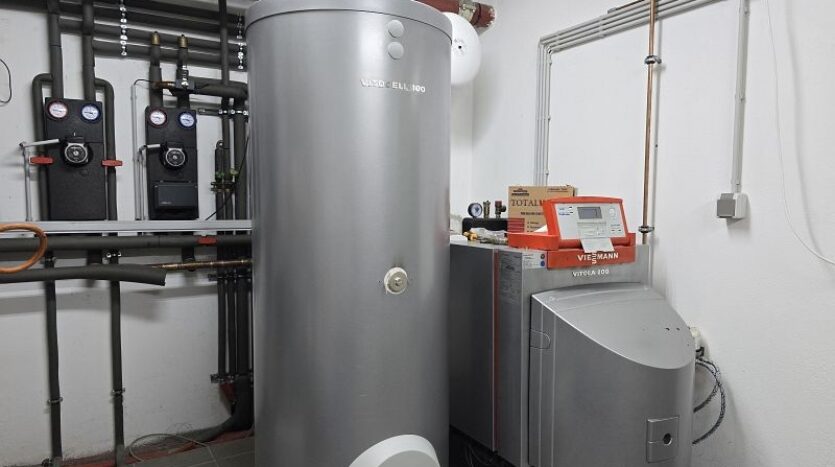 Beheizt wird das Gebäude über eine Öl-Zentralheizung in Kombination mit Fußbodenheizung. Das Warmwasser wird erzeugt über eine Solaranlage.