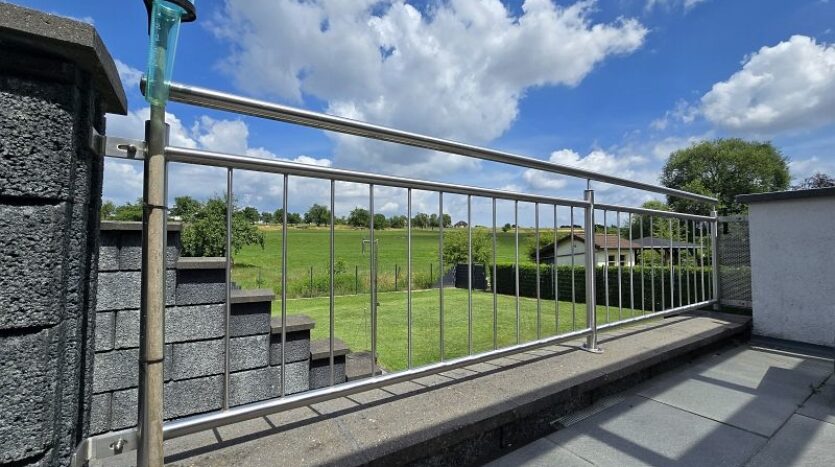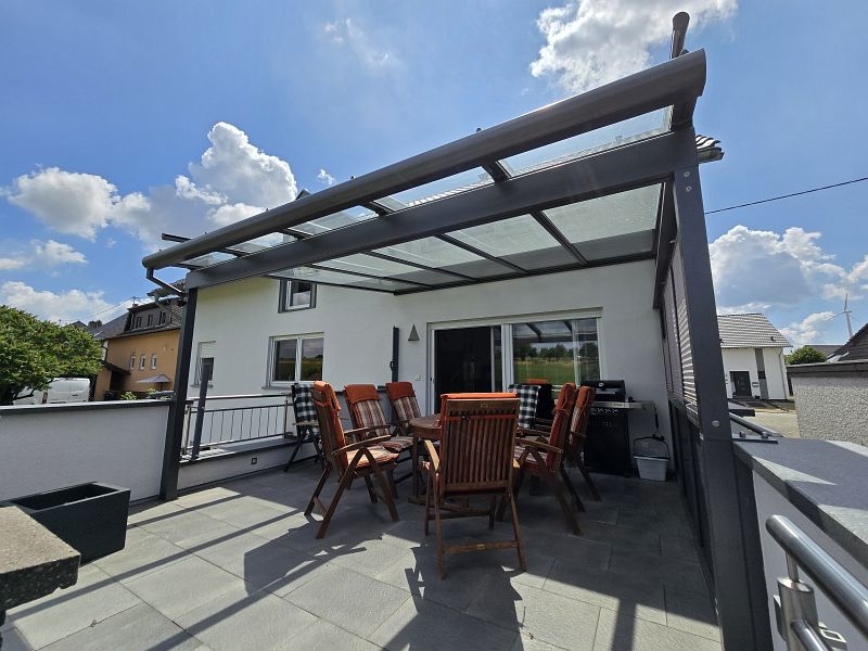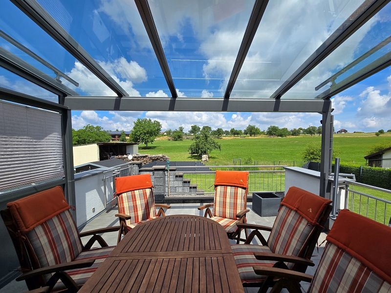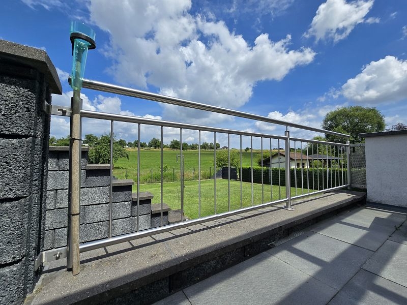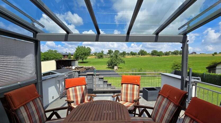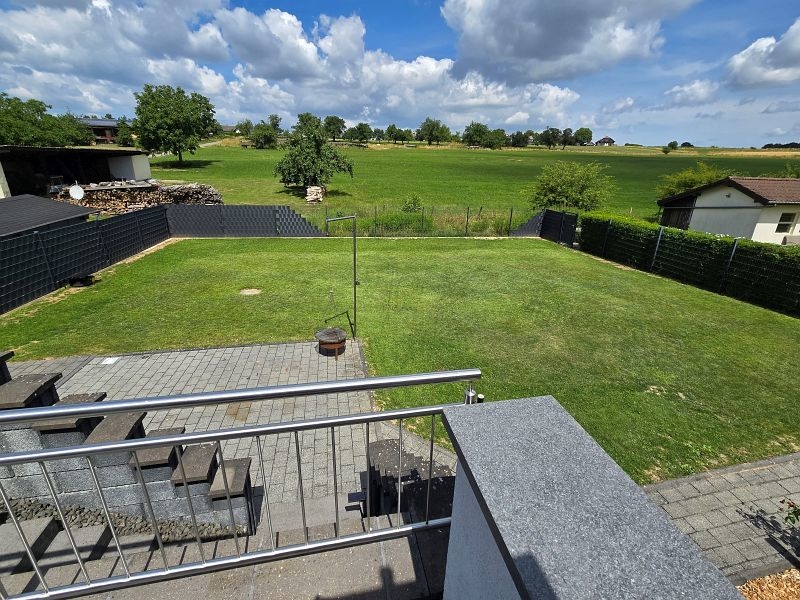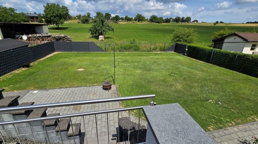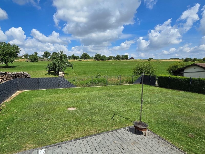 Aufgrund der Ortsrandlage genießt man von der überdachten Außenterrasse einen wunderschönen Ausblick auf die umliegenden Wiesen. Ruhe pur!!!