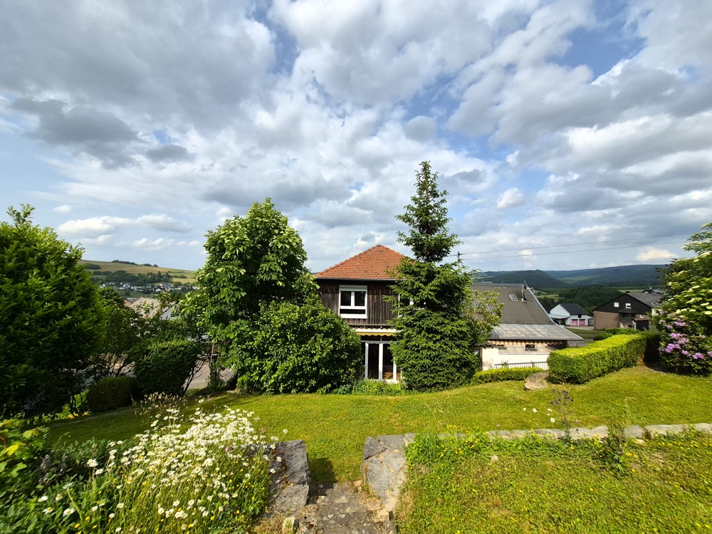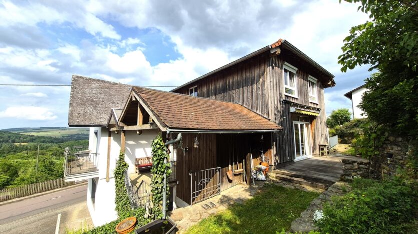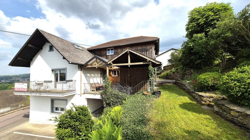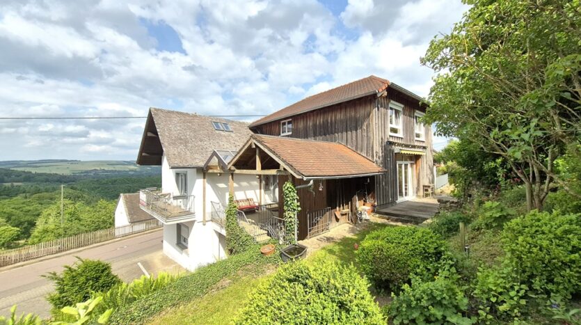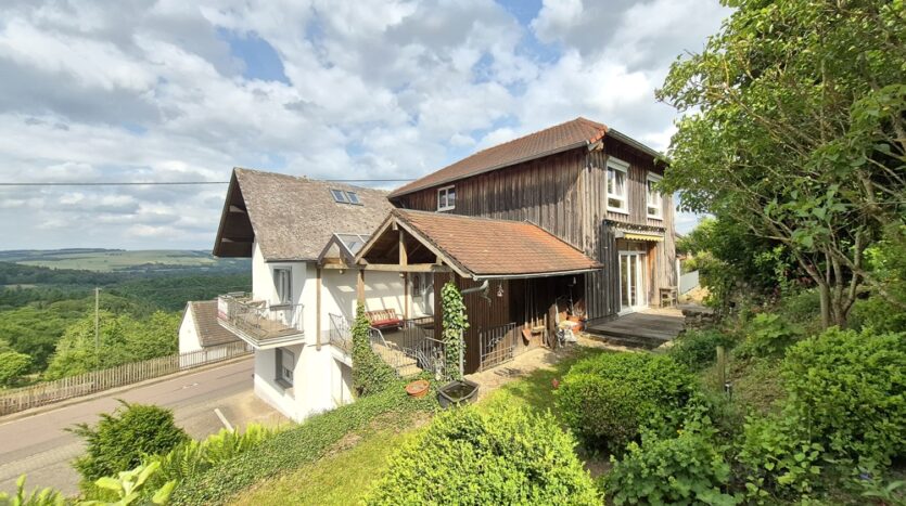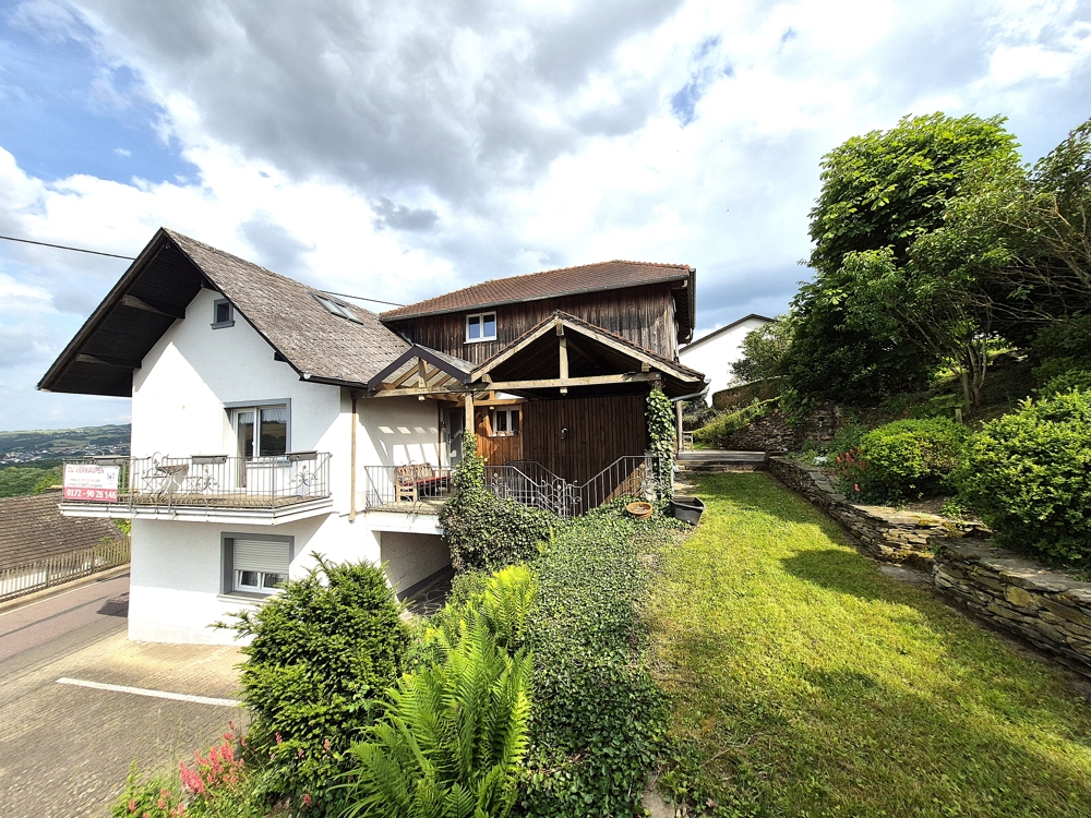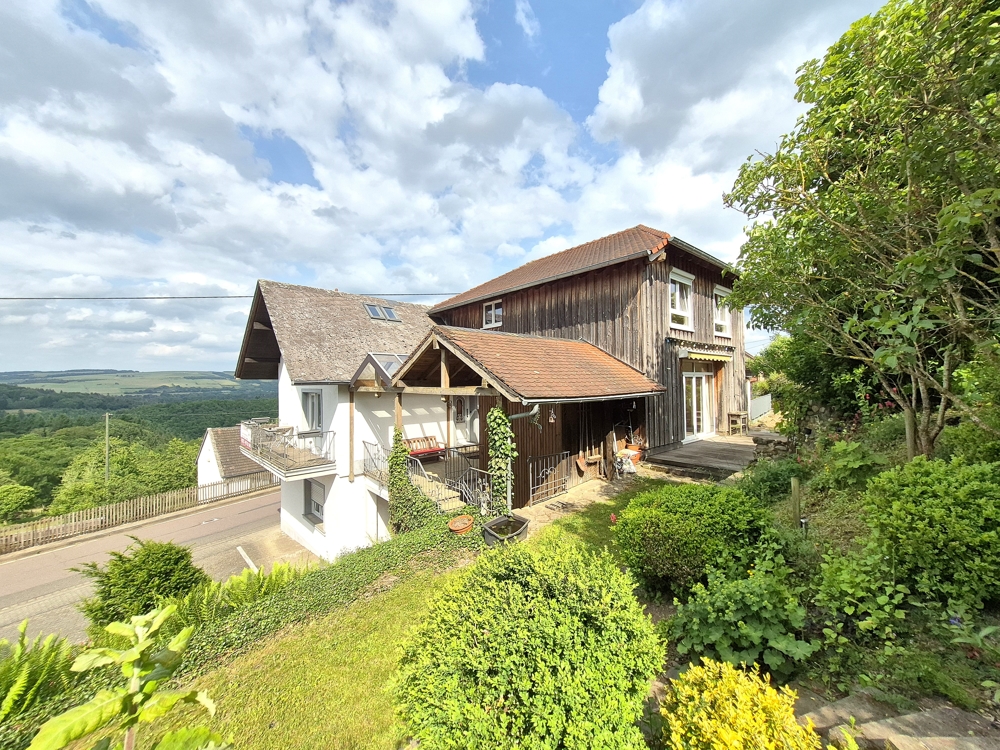 Gebouw met drie wooneenheden, garages, tuin, boomgaard/weide en een prachtig panoramisch uitzicht te koop in Ollmuth.