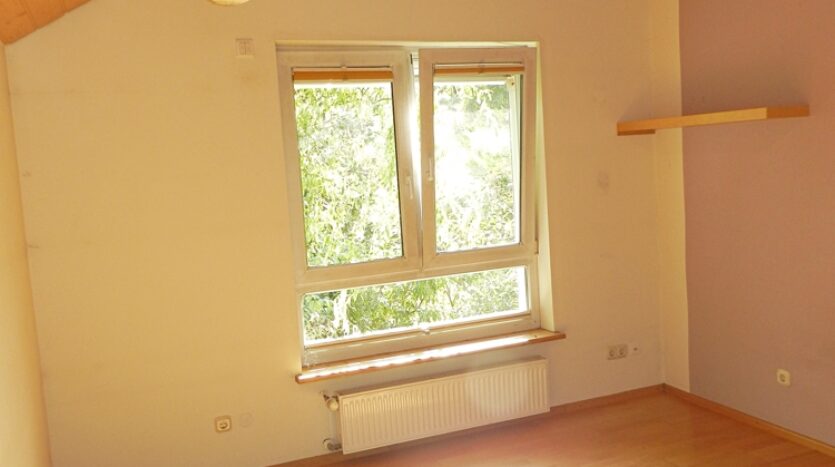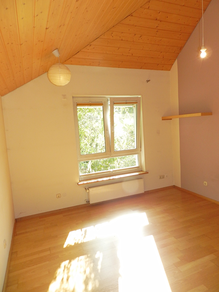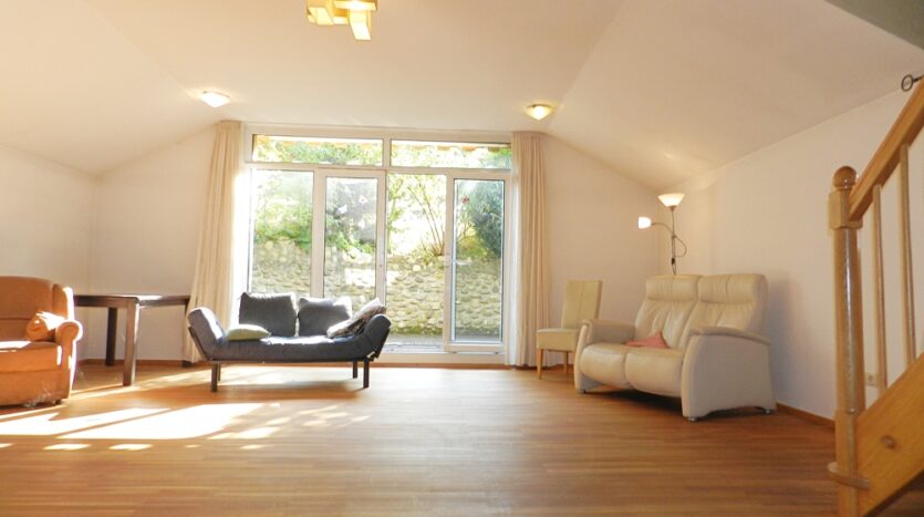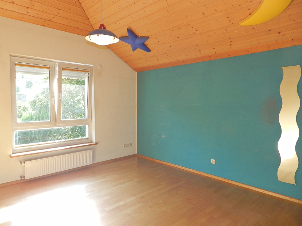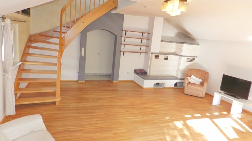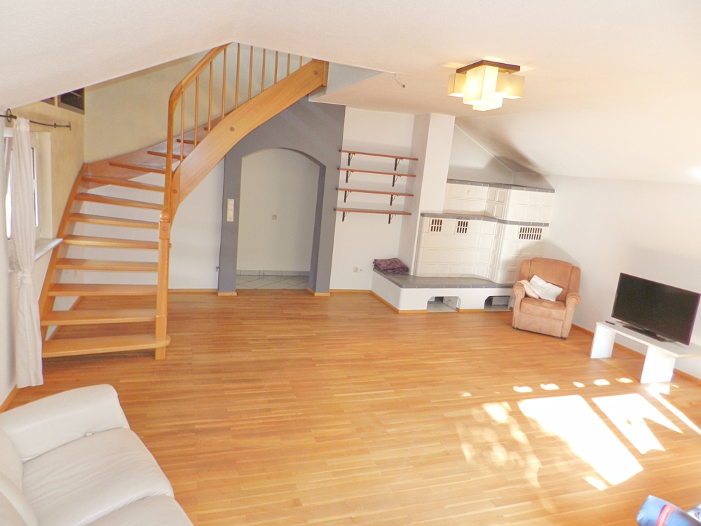 Das großzügige Wohnzimmer mit Echtholzdielen, wasserführendem Kachelofen und Zugang zur Terrasse ist das Highlight dieser Wohnung. Eine geschwungene Holztreppe führt aus dem Wohnzimmer in das 2. OG. Hier erwarten Sie 4 Schlaf-/Kinderzimmer sowie ein Dusch-Bad.