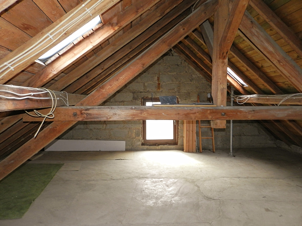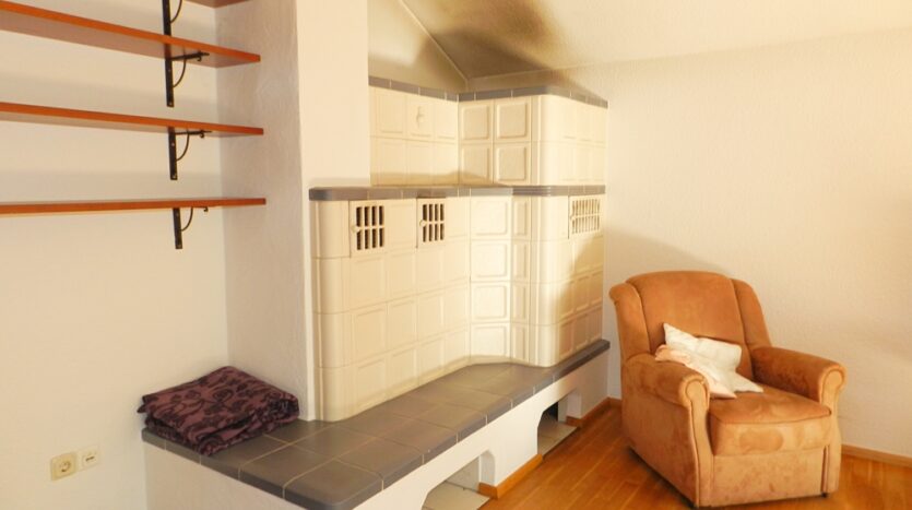 Alle Heizkörper in den Wohnräumen dieser Einheit werden über den Kachelofen gespeist. Vor der Haustüre befindet sich dazu ein mit Glas überdachter Freisitz mit ganzjährig trockenem Zugang zum Holzlagerraum. Als weitere Nutzfläche steht ein Teil des nicht ausgebauten Speichers zur Verfügung.