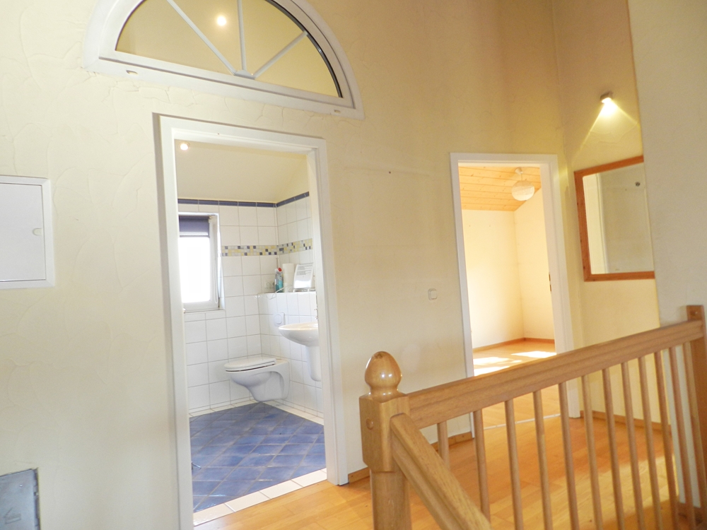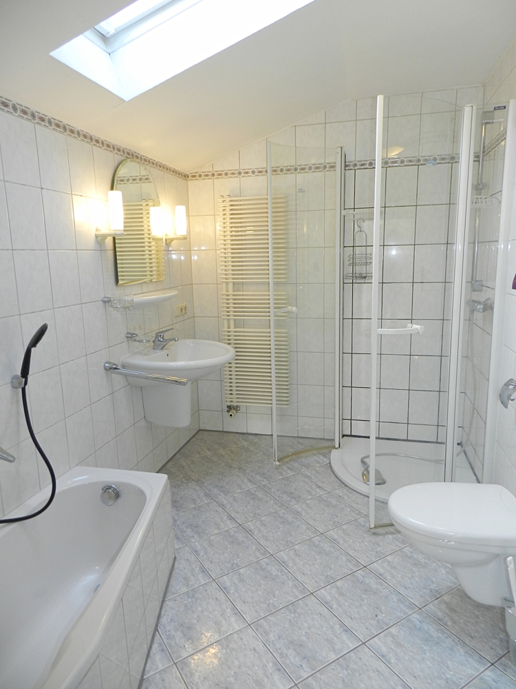 Im ersten Obergeschoss sind drei Schlafzimmer, ein helles, renoviertes Badezimmer mit Wanne und Dusche, ein großer Balkon mit Markise und Überdachung. Als Nutzflächen stehen dieser Wohneinheit ein begehbarer Dachboden und Kellerräume zur Verfügung. In einem dieser Keller steht die Öl-Zentralheizung, die Wohneinheit 1 und 3 mit Warmwasser und Heizung versorgt (4 Doppelwandige-Öltanks à 1000l).
