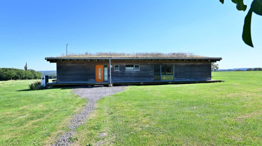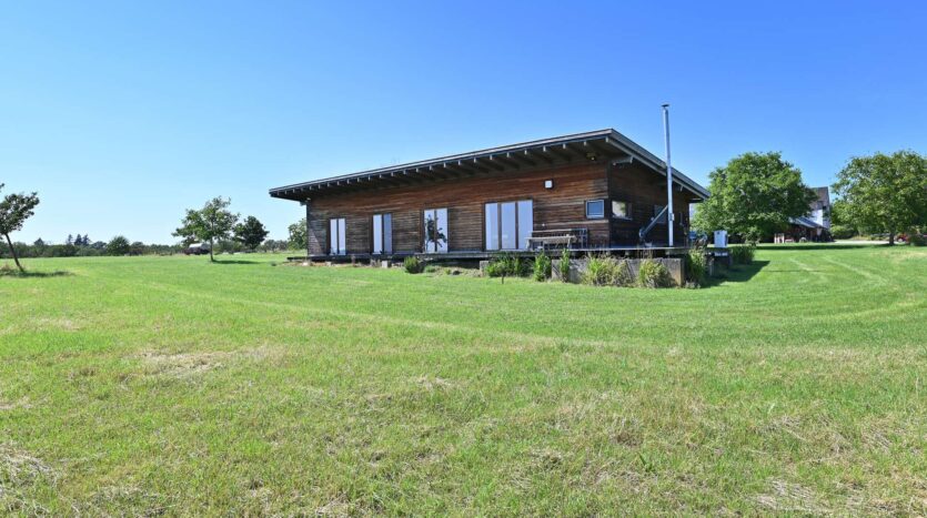 Wer dem hektischen Stadtleben entkommen und sich endlich eine echte Auszeit gönnen möchte, findet in diesem besonderen Zuhause genau das, was er sucht: Ruhe, Ursprünglichkeit und pure Lebensqualität. Dieses charmante Bio-Holzhaus aus dem Jahr 2007 wurde aus unbehandelter Douglasie aus dem Sauerland gefertigt – ein Naturprodukt, das nicht nur durch seine Nachhaltigkeit überzeugt, sondern auch keinerlei Pflegebedarf an der Fassade mit sich bringt. Es altert in Würde und fügt sich harmonisch in die umliegende Landschaft ein.