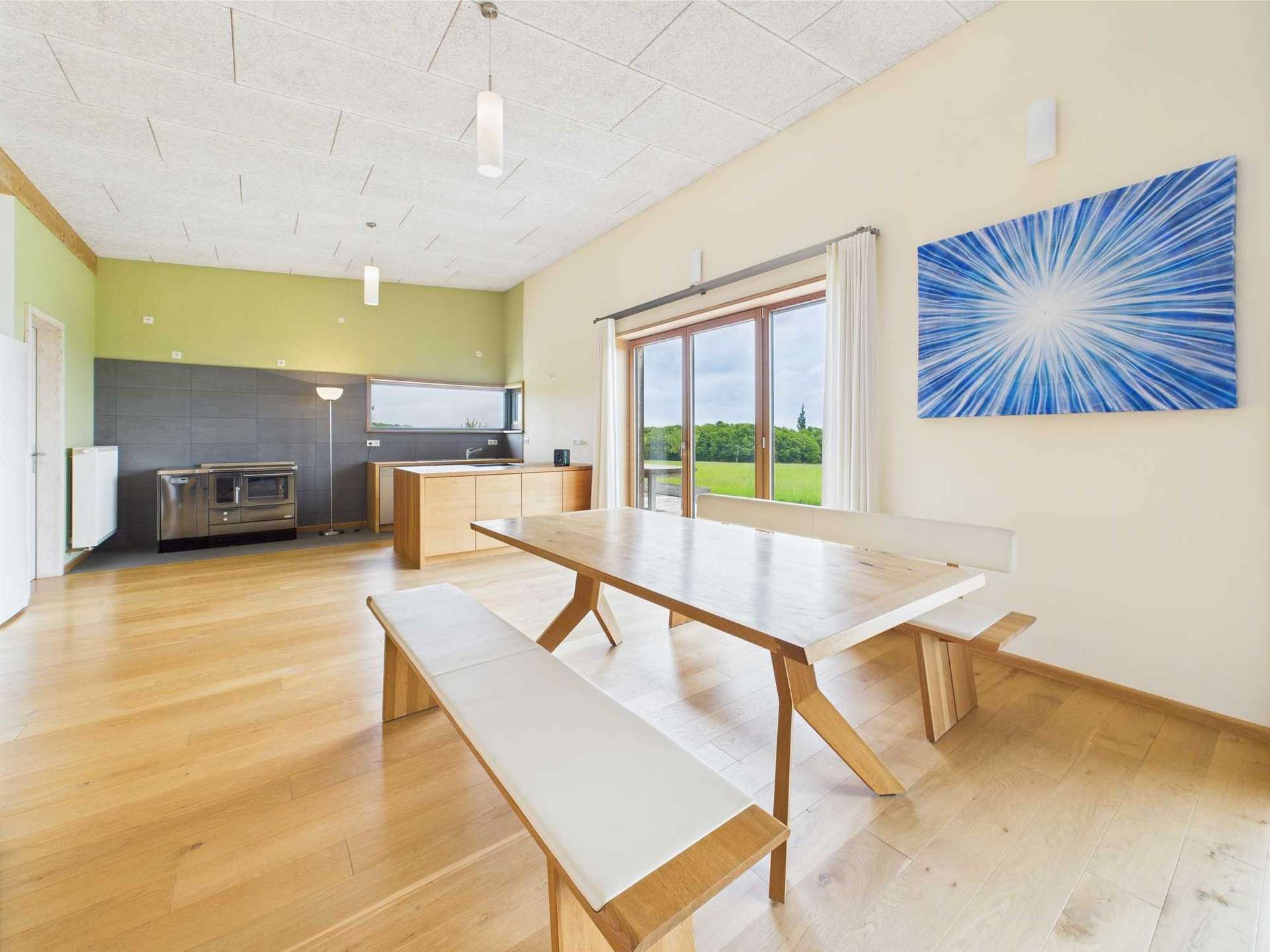 Im Inneren des Hauses empfängt Sie eine einladende Diele, von der aus Sie in den weitläufigen und lichtdurchfluteten Wohn-, Ess- und Küchenbereich gelangen. Durch große Fensterfronten genießen Sie zu jeder Tageszeit den Blick ins Grüne – ein Wohnzimmer, das zur Ruhe einlädt und gleichzeitig die Natur ins Haus holt. Hinter dem Haus lädt eine Terrasse zum Verweilen ein – mit etwas Glück lassen sich hier sogar Rehe beobachten. Mehr Verbindung zur Natur geht kaum.