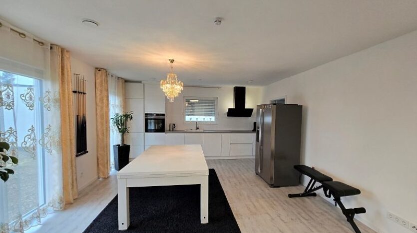 Der Wohn- und Essbereich verfügt über 4 große bodentiefe Fenster/Türen die den gesamten Wohnraum mit viel Tageslicht durchfluten. Vom Wohn- und Essbereich aus gelangen Sie direkt auf die Außenterrasse und in den Garten. Von hier aus genießen Sie einen unverbaubaren Blick über weite Teile des Ortskerns.