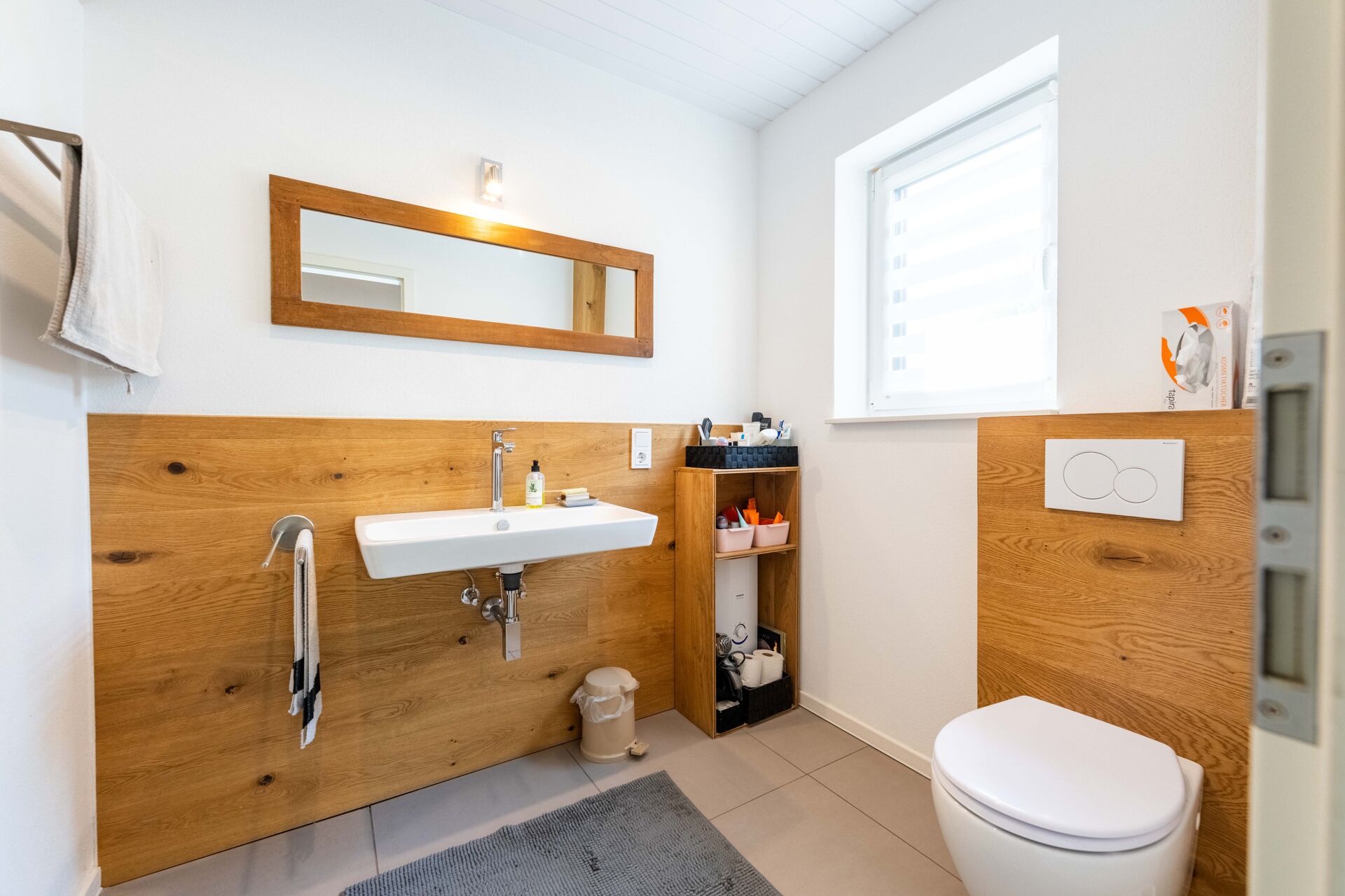 Bodentiefe, dreifachverglaste Kunststofffenster sorgen für lichtdurchflutete Räume und eine optimale Energieeffizienz. Die Beheizung erfolgt über eine umweltfreundliche Luft-/Wasser-Wärmepumpe. Hochwertige Bodenbeläge unterstreichen das gehobene Ambiente des Hauses.