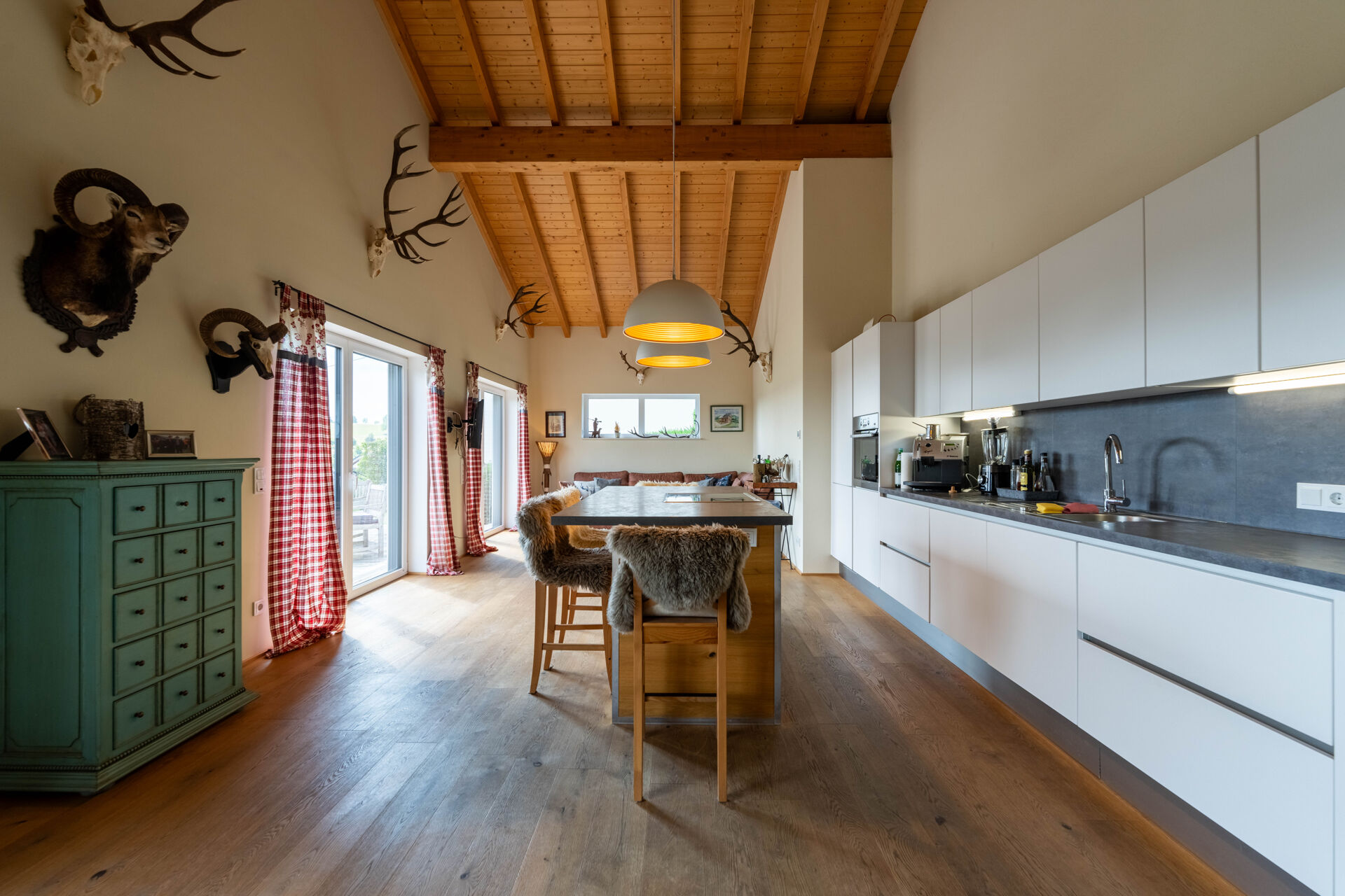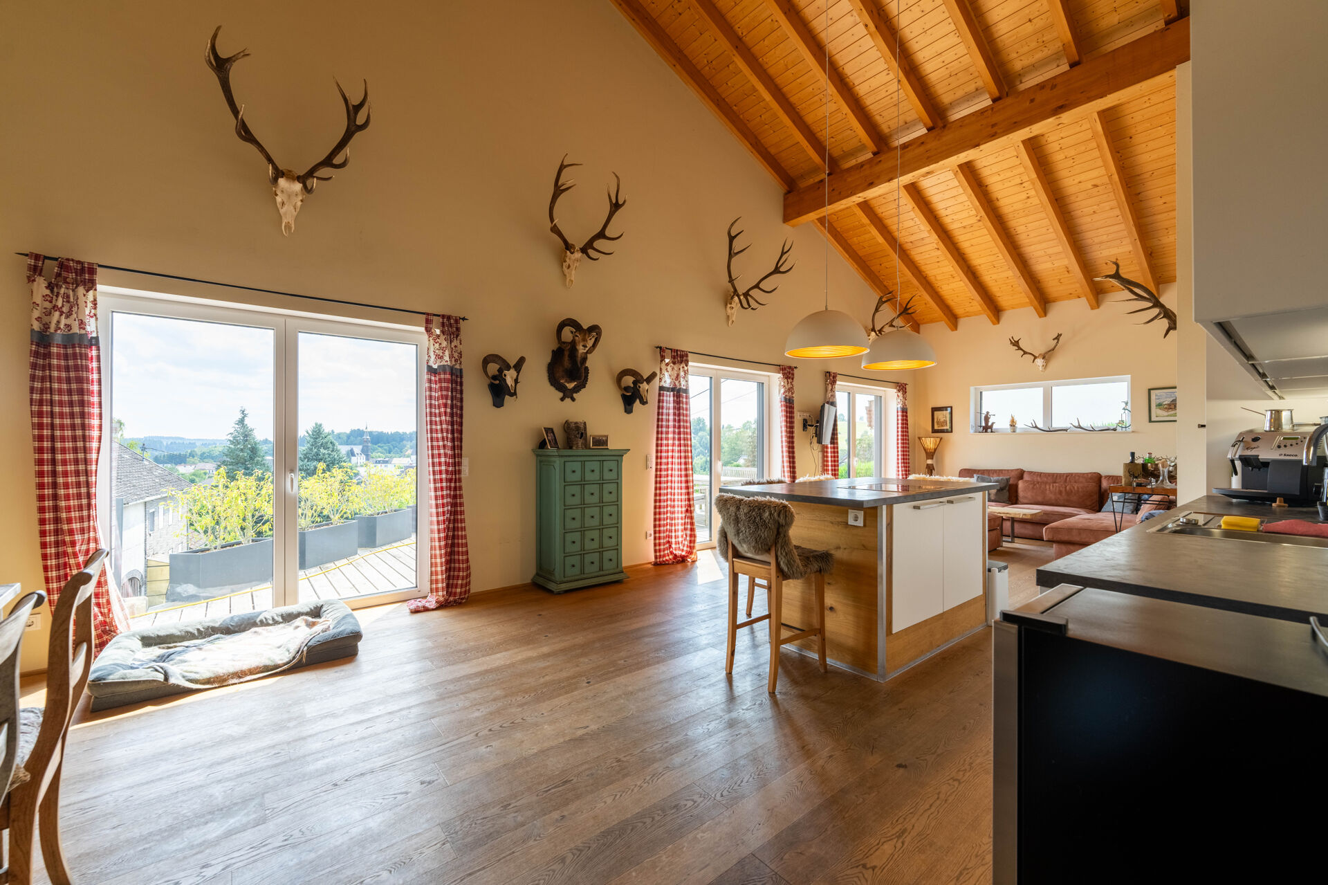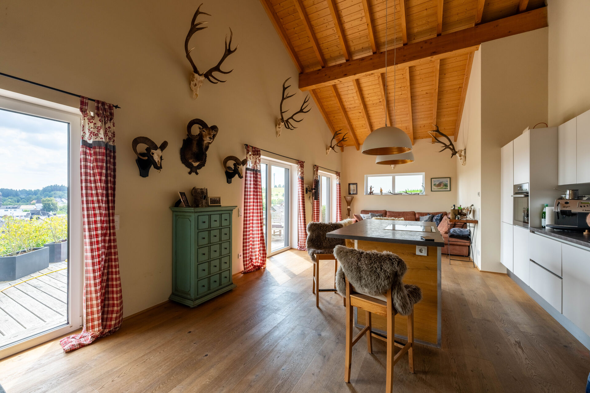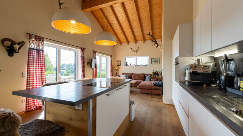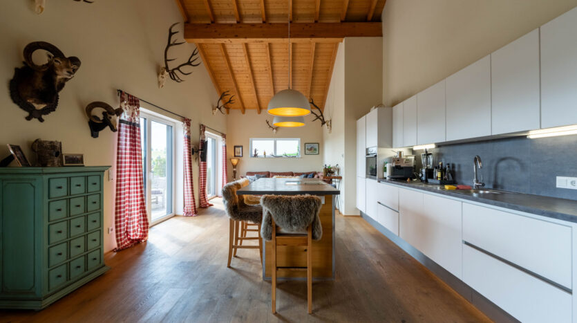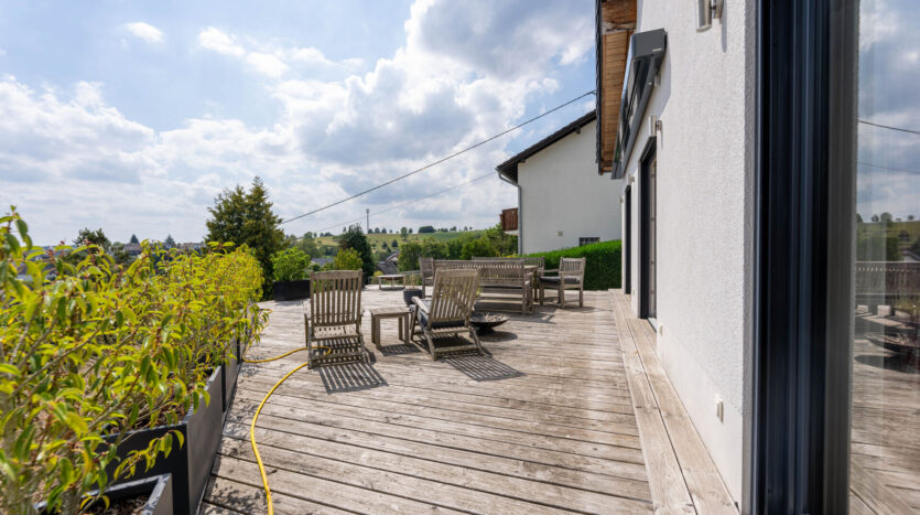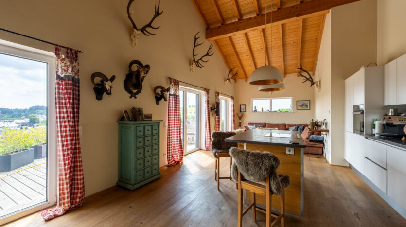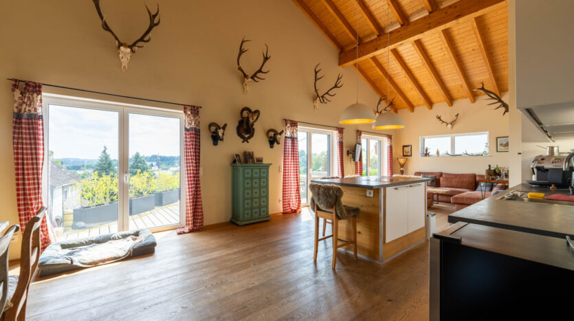 Der großzügige Wohn- und Essbereich öffnet sich zur großzügigen Terrasse, von der aus Sie die herrliche Aussicht genießen können. Die zusätzliche Empore bietet vielfältige Nutzungsmöglichkeiten – ob als Arbeitsbereich, Galerie oder Rückzugsort.