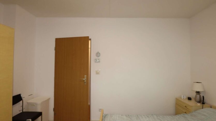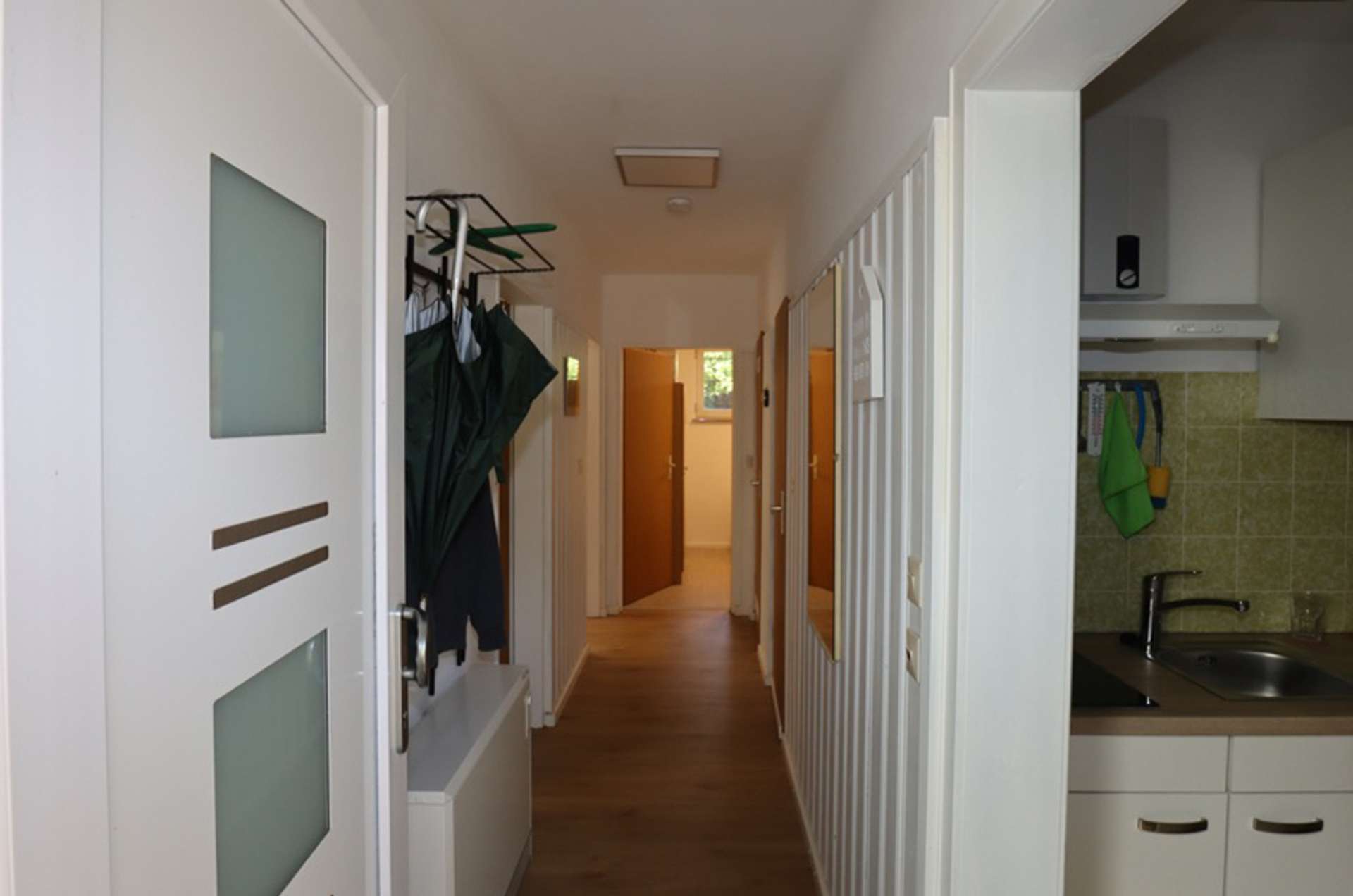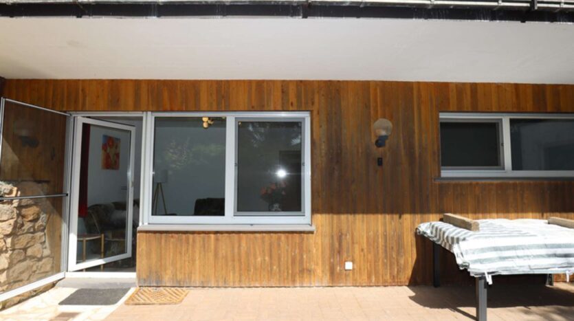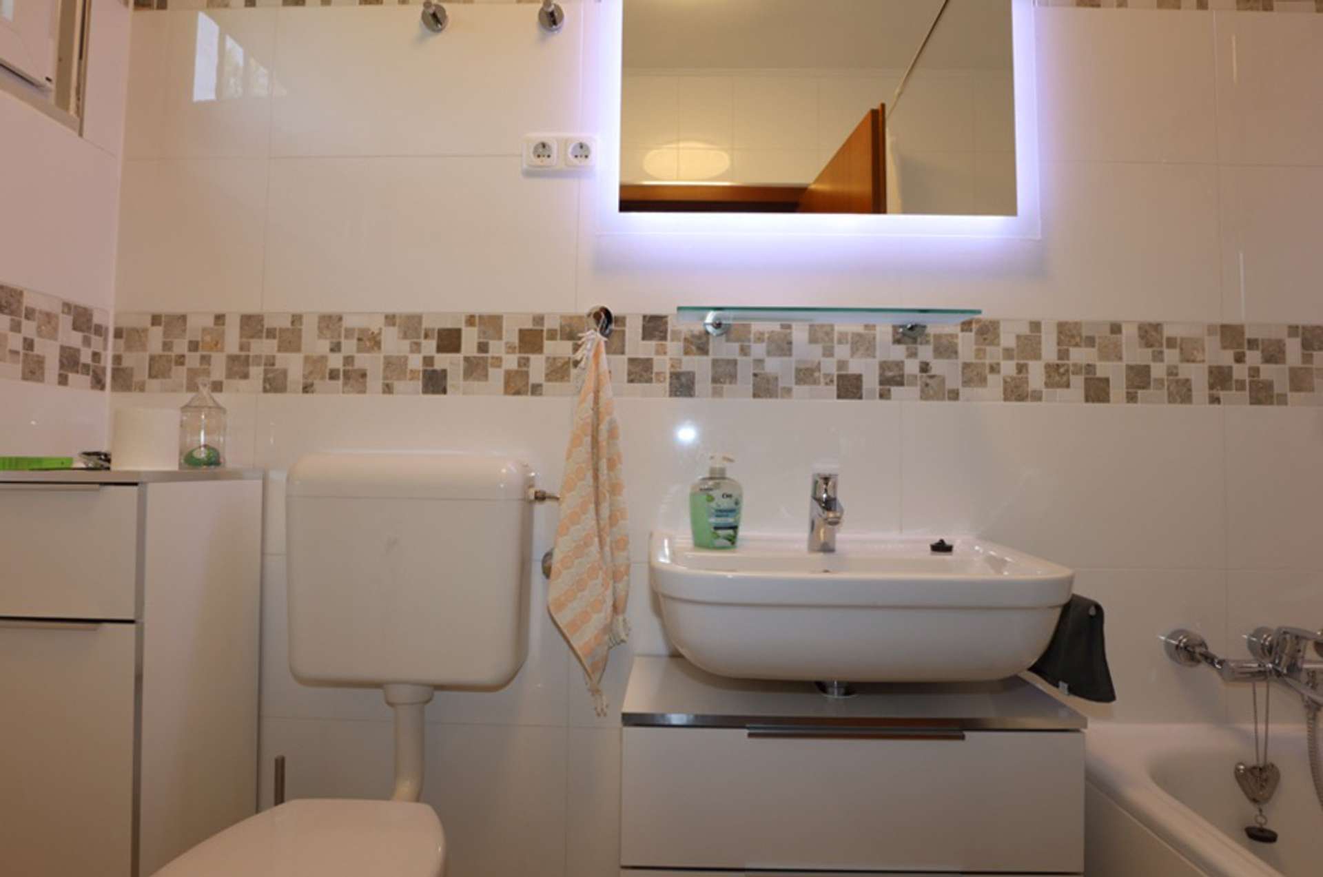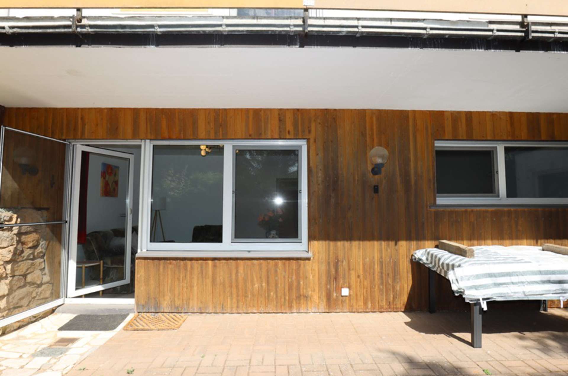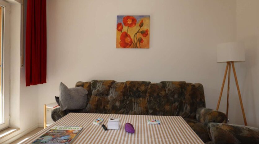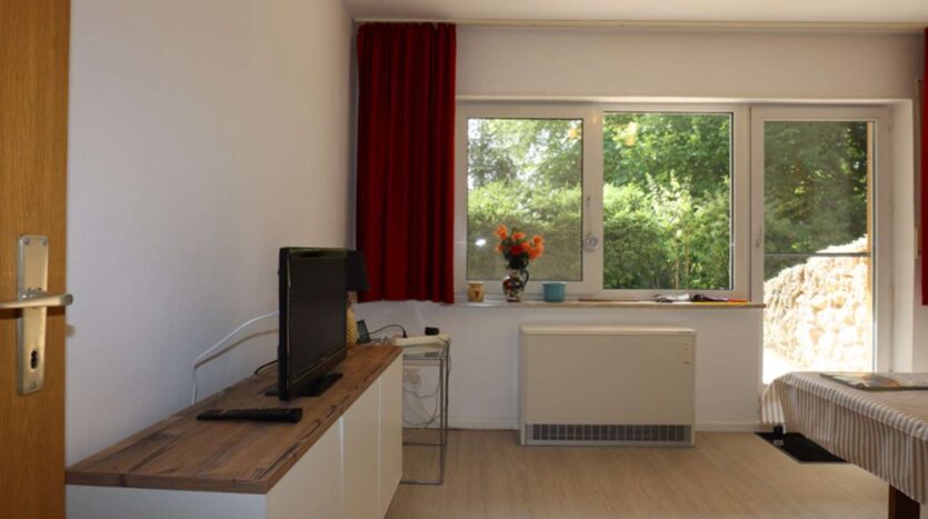 Die Einliegerwohnung ist über einen Nebeneingang erreichbar und wurde in großen Teilen, in der jüngsten Vergangenheit renoviert. Die Größe dieser Wohnung beträgt ca. 57 m2, die sich auf zwei Schlafzimmer, ein Wohnzimmer mit Zugang zur Terrasse, Küche, Bad und einen Abstellraum verteilen. Auch hier wurde das Bad 2017 saniert und zudem eine neue Küchenzeile eingebaut und Laminat in den Wohnräumen verlegt. Die Nachtspeicheröfen wurden 2019 erneuert. Die vor der Wohnung liegende Terrasse ist links durch eine Mauer geschützt und bietet so einen schönen Platz für das Leben draußen.