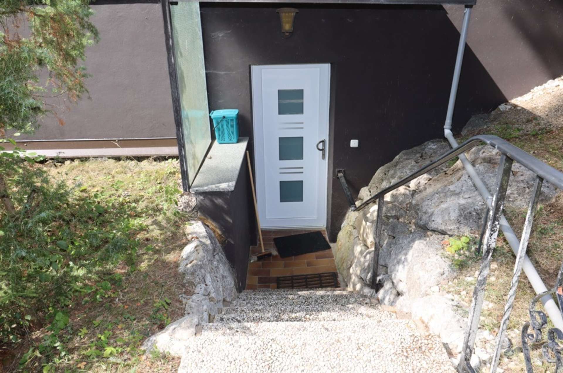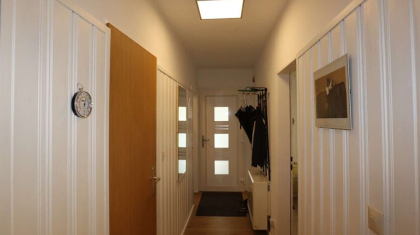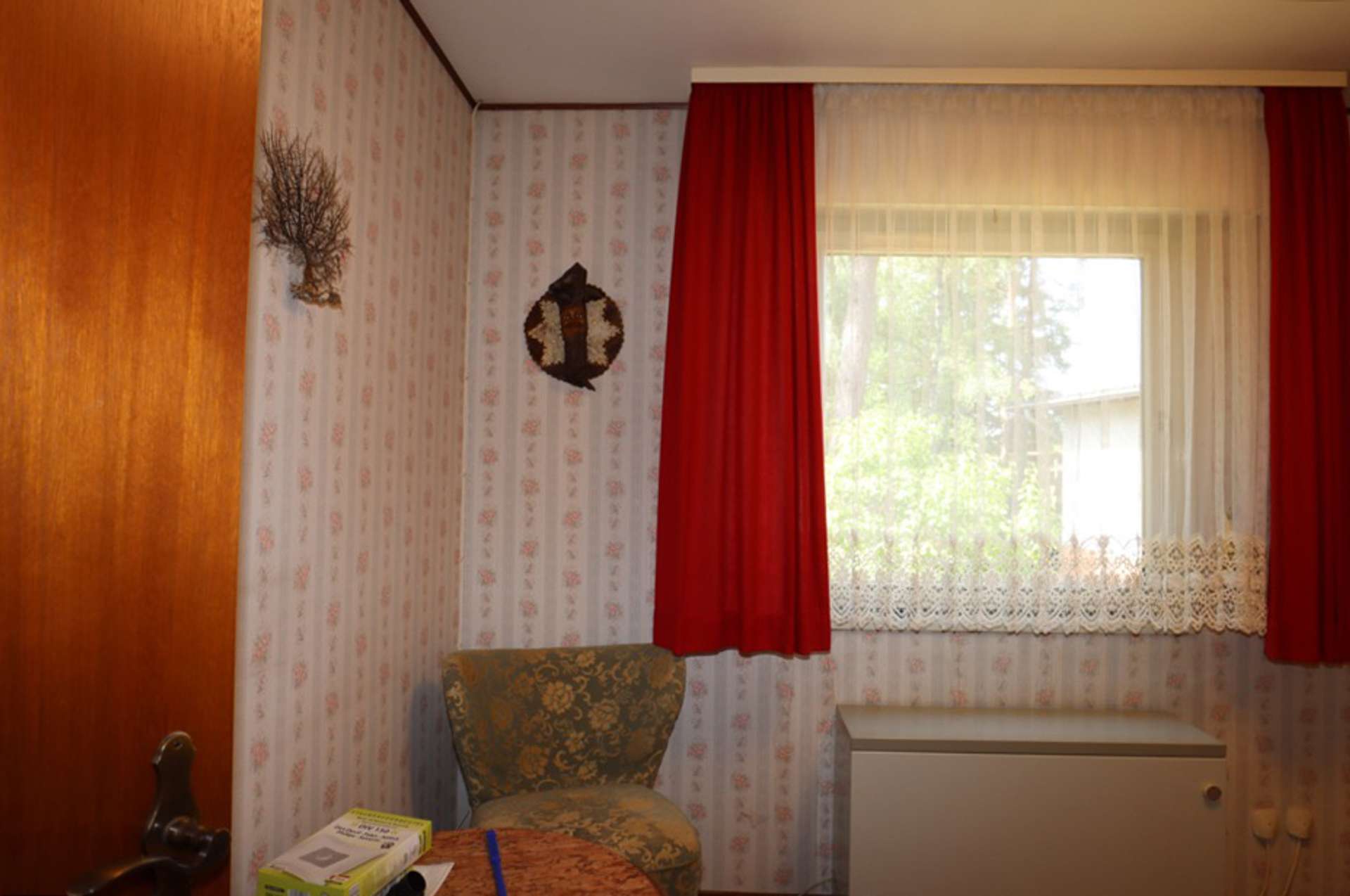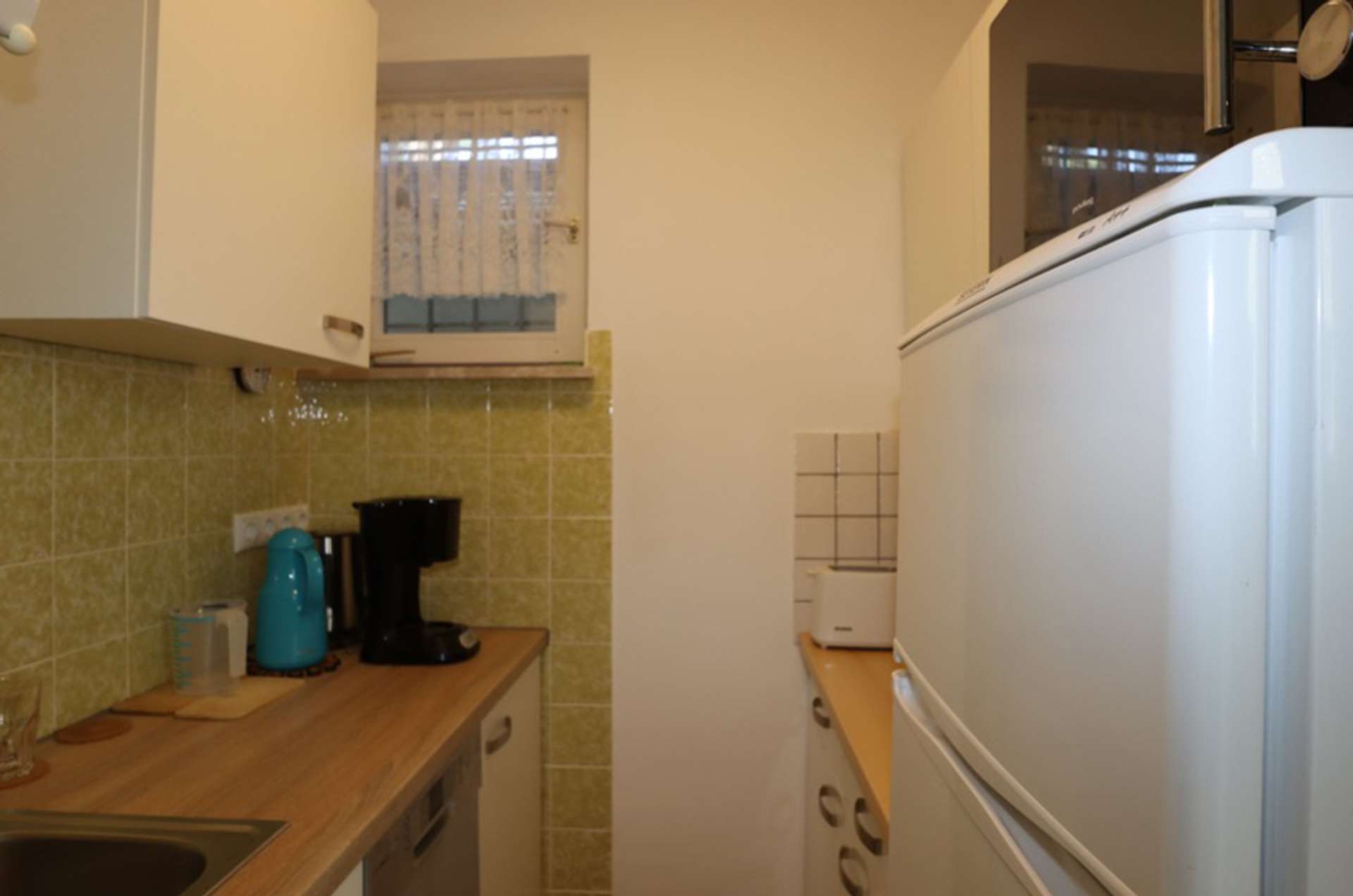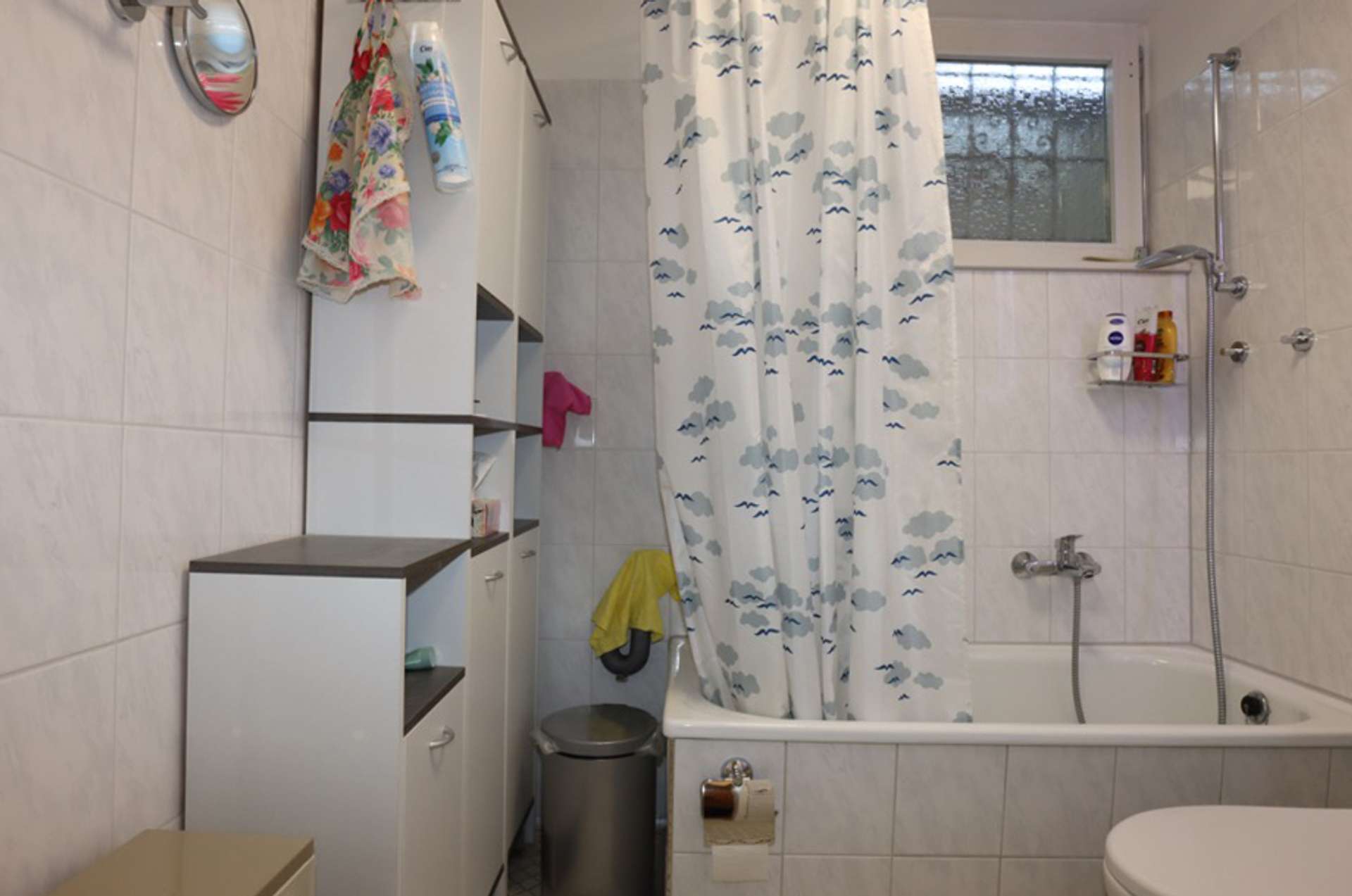 Die Einliegerwohnung ist über einen Nebeneingang erreichbar und wurde in großen Teilen, in der jüngsten Vergangenheit renoviert. Die Größe dieser Wohnung beträgt ca. 57 m2, die sich auf zwei Schlafzimmer, ein Wohnzimmer mit Zugang zur Terrasse, Küche, Bad und einen Abstellraum verteilen. Auch hier wurde das Bad 2017 saniert und zudem eine neue Küchenzeile eingebaut und Laminat in den Wohnräumen verlegt. Die Nachtspeicheröfen wurden 2019 erneuert. Die vor der Wohnung liegende Terrasse ist links durch eine Mauer geschützt und bietet so einen schönen Platz für das Leben draußen.