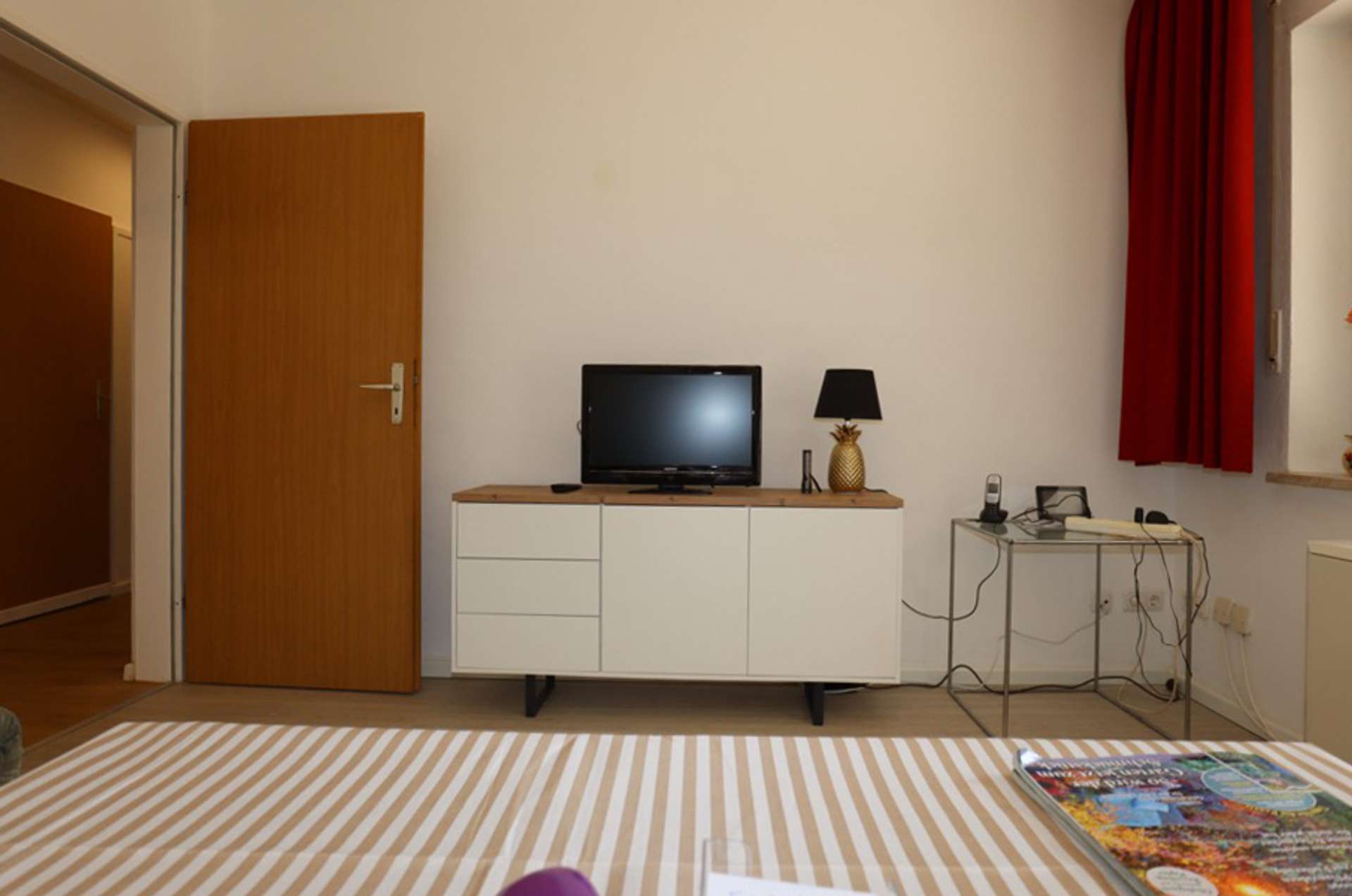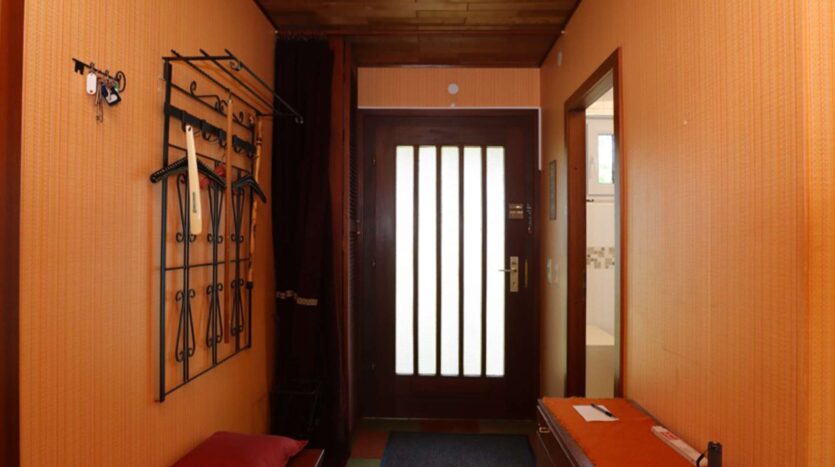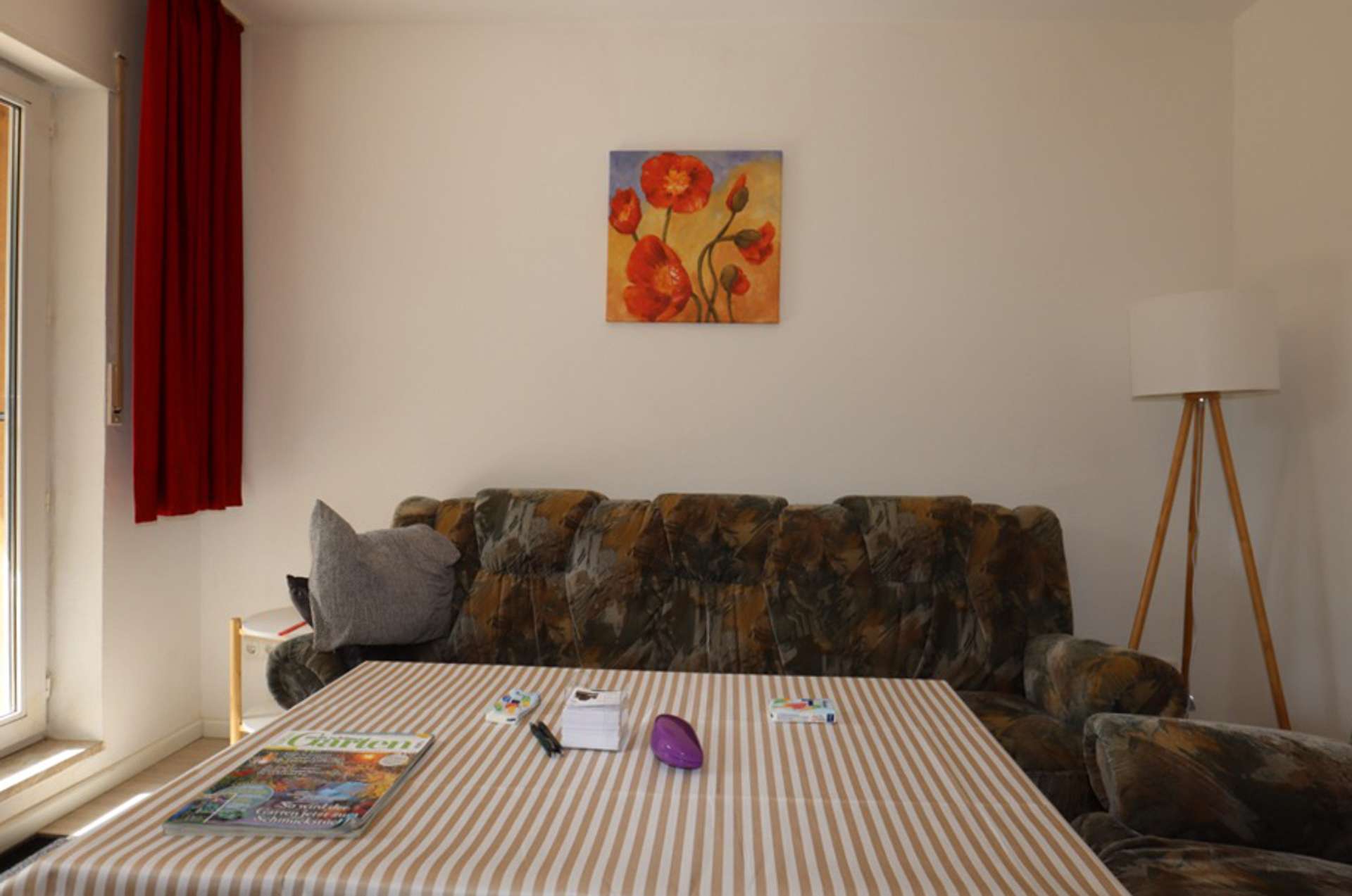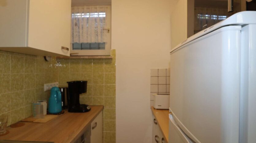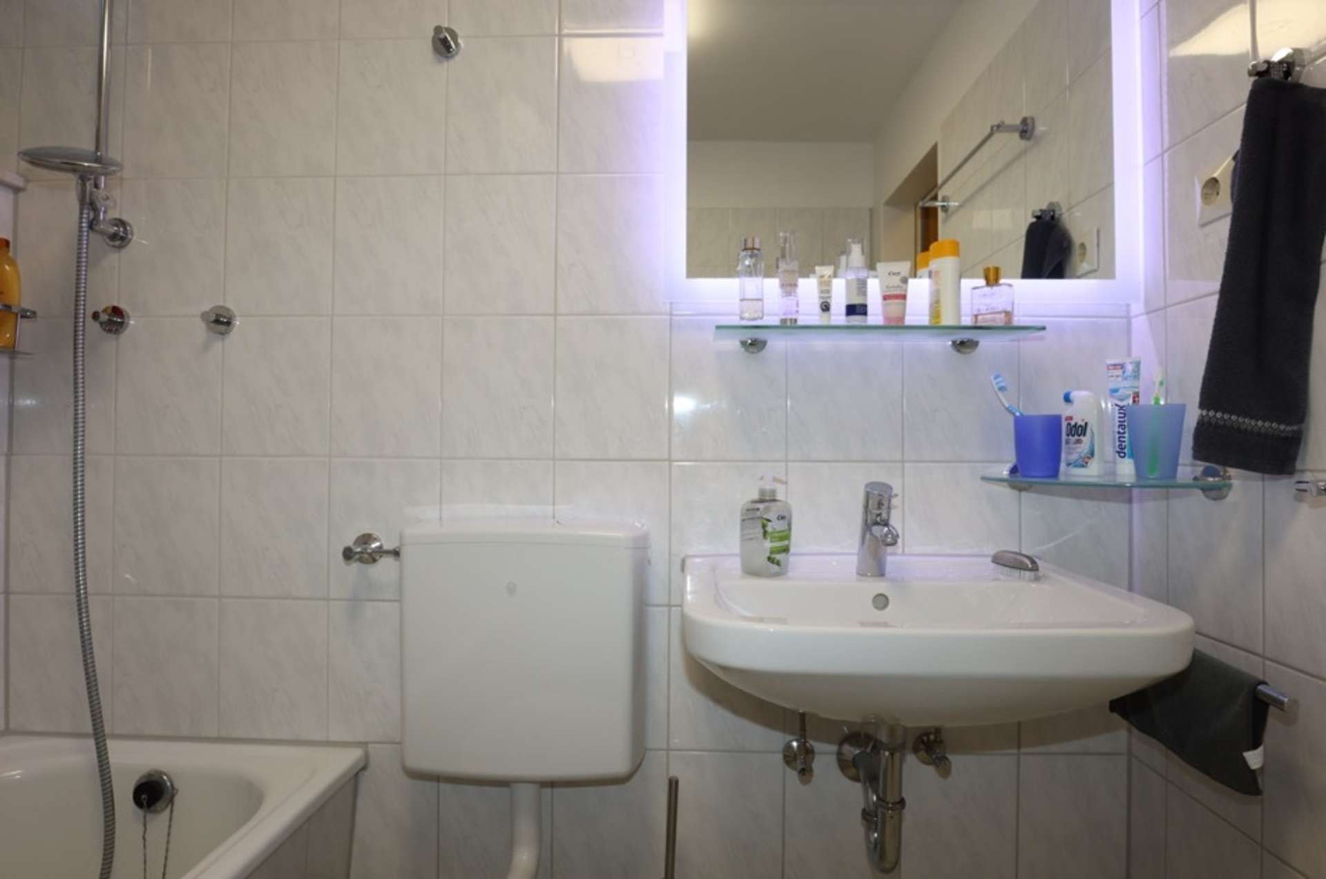 Die Einliegerwohnung ist über einen Nebeneingang erreichbar und wurde in großen Teilen, in der jüngsten Vergangenheit renoviert. Die Größe dieser Wohnung beträgt ca. 57 m2, die sich auf zwei Schlafzimmer, ein Wohnzimmer mit Zugang zur Terrasse, Küche, Bad und einen Abstellraum verteilen. Auch hier wurde das Bad 2017 saniert und zudem eine neue Küchenzeile eingebaut und Laminat in den Wohnräumen verlegt. Die Nachtspeicheröfen wurden 2019 erneuert. Die vor der Wohnung liegende Terrasse ist links durch eine Mauer geschützt und bietet so einen schönen Platz für das Leben draußen.