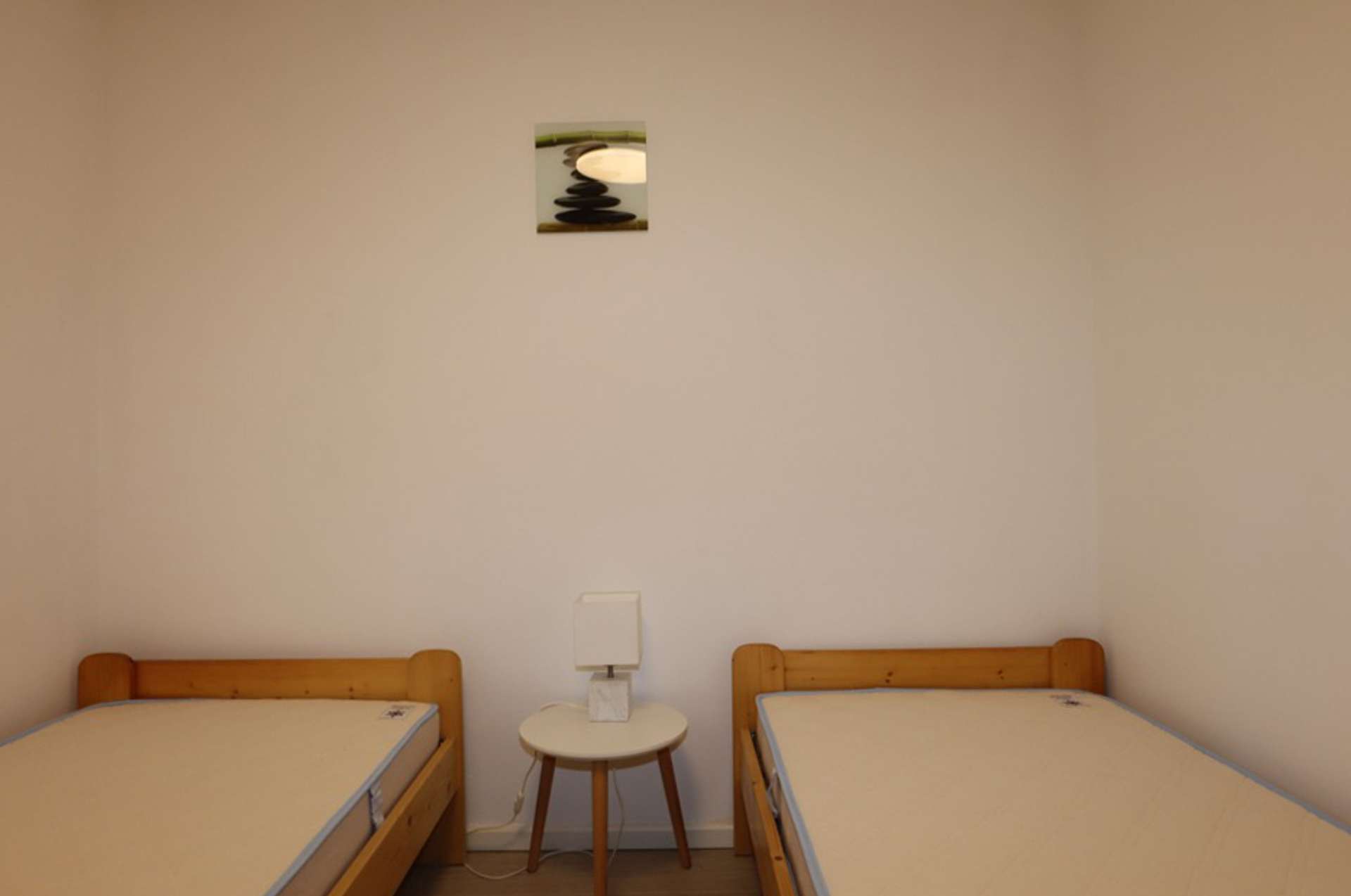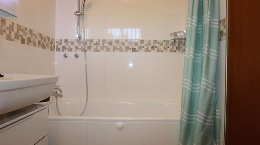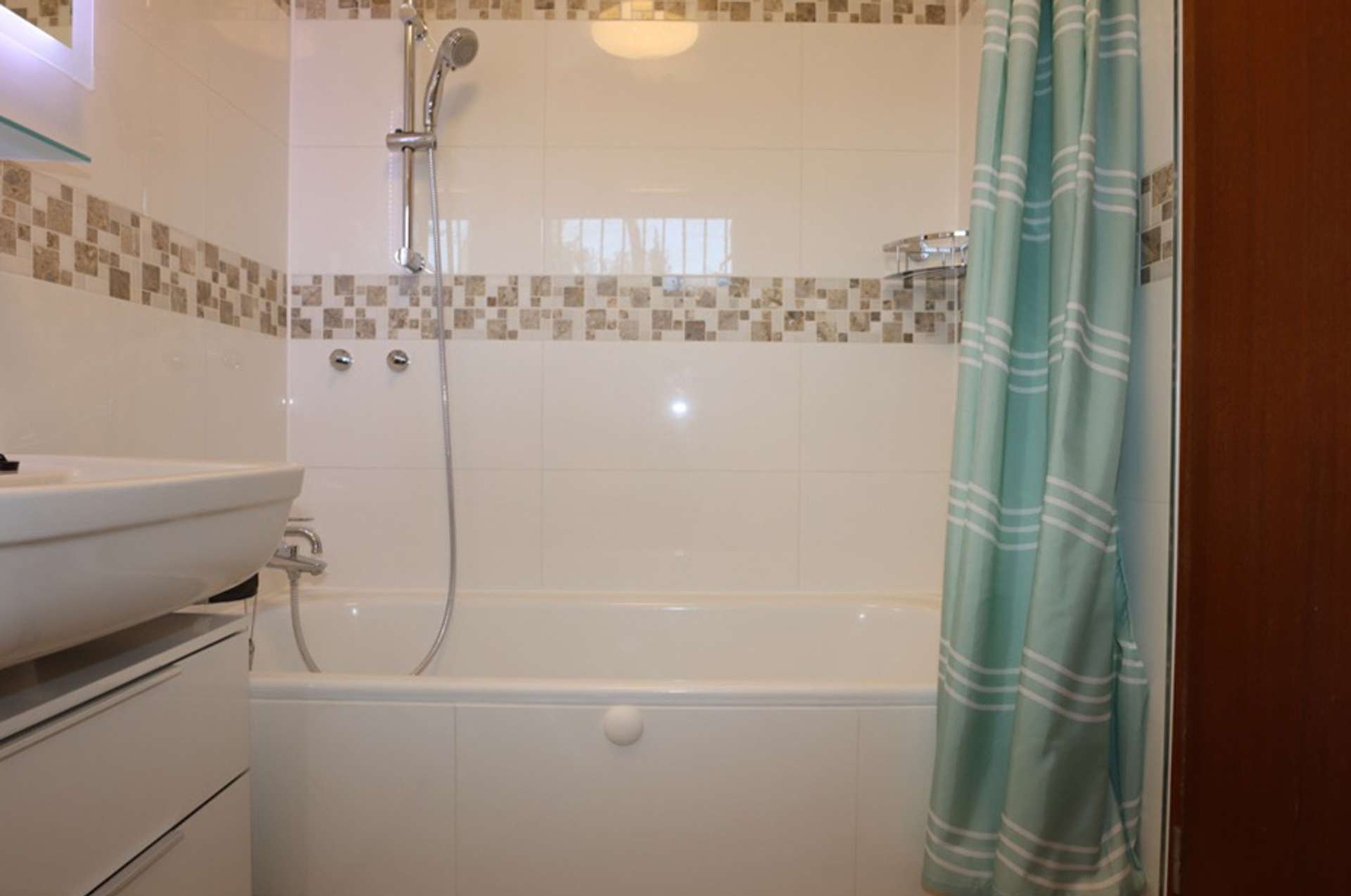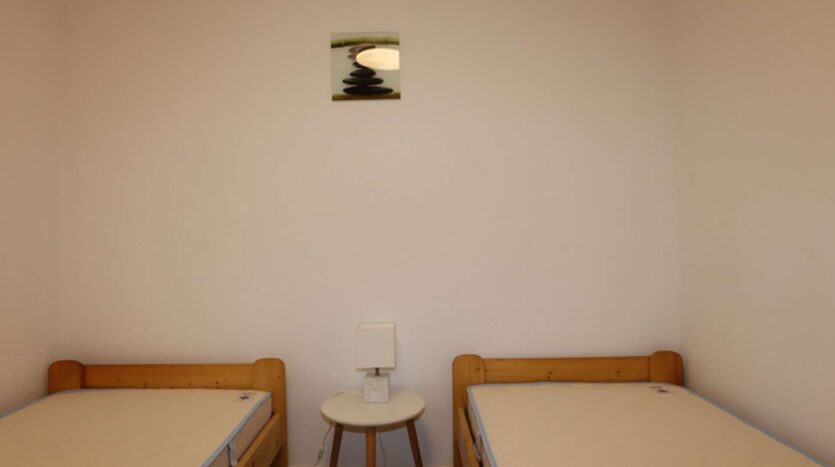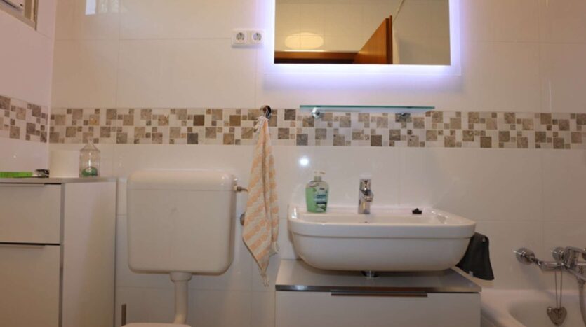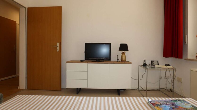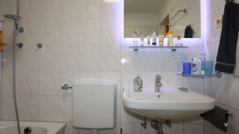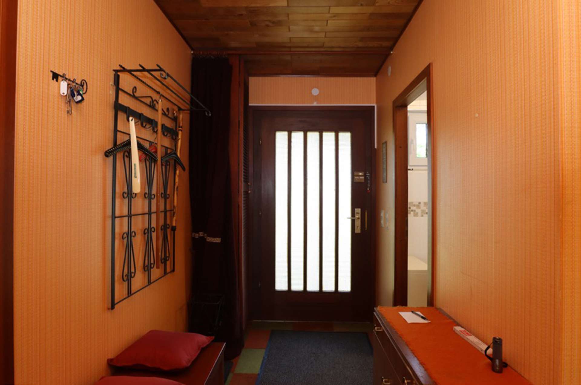 Die Einliegerwohnung ist über einen Nebeneingang erreichbar und wurde in großen Teilen, in der jüngsten Vergangenheit renoviert. Die Größe dieser Wohnung beträgt ca. 57 m2, die sich auf zwei Schlafzimmer, ein Wohnzimmer mit Zugang zur Terrasse, Küche, Bad und einen Abstellraum verteilen. Auch hier wurde das Bad 2017 saniert und zudem eine neue Küchenzeile eingebaut und Laminat in den Wohnräumen verlegt. Die Nachtspeicheröfen wurden 2019 erneuert. Die vor der Wohnung liegende Terrasse ist links durch eine Mauer geschützt und bietet so einen schönen Platz für das Leben draußen.
