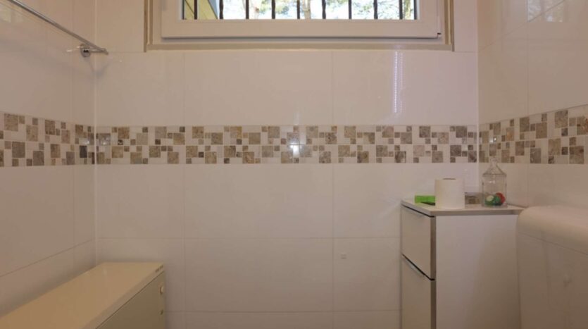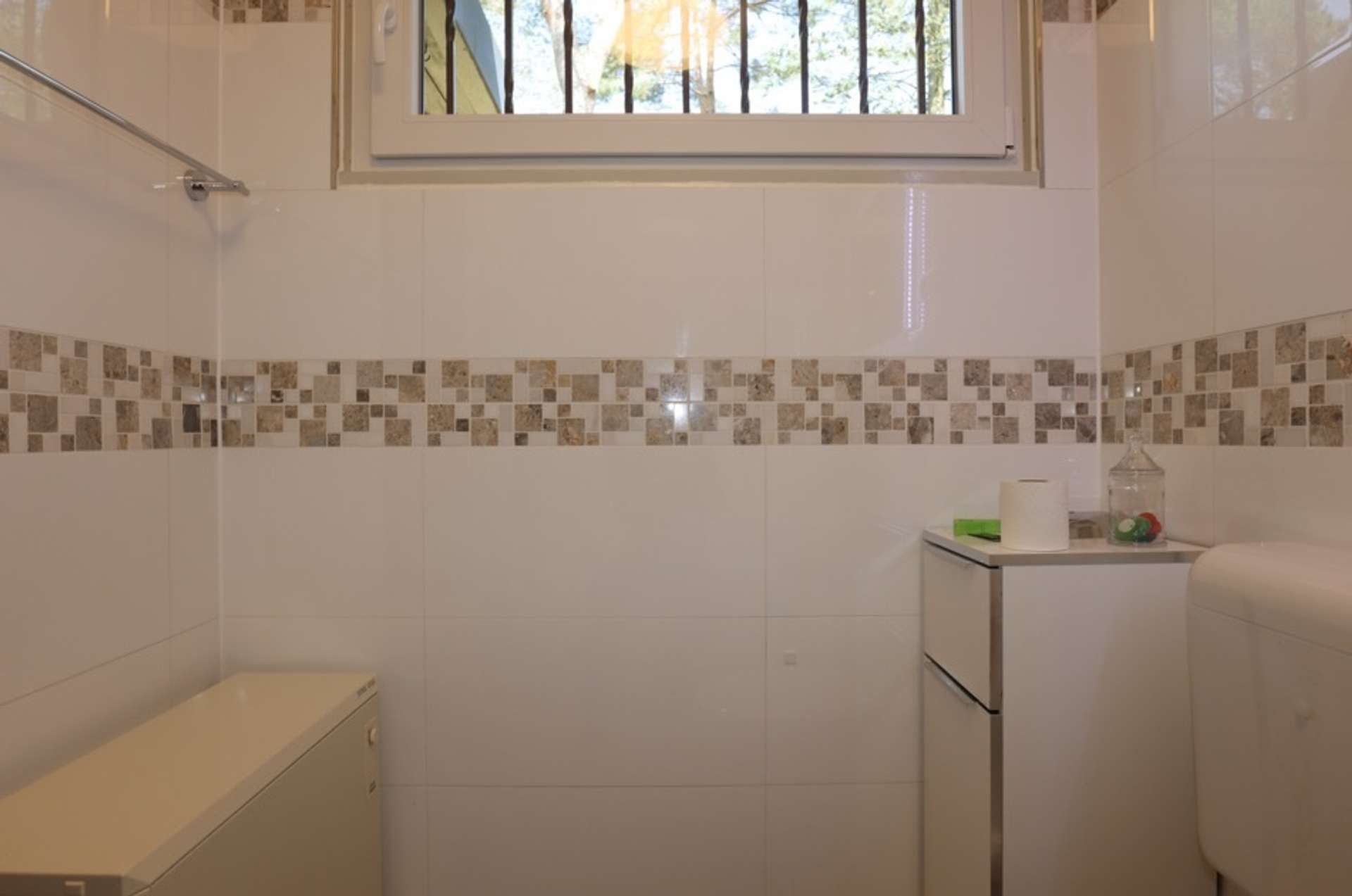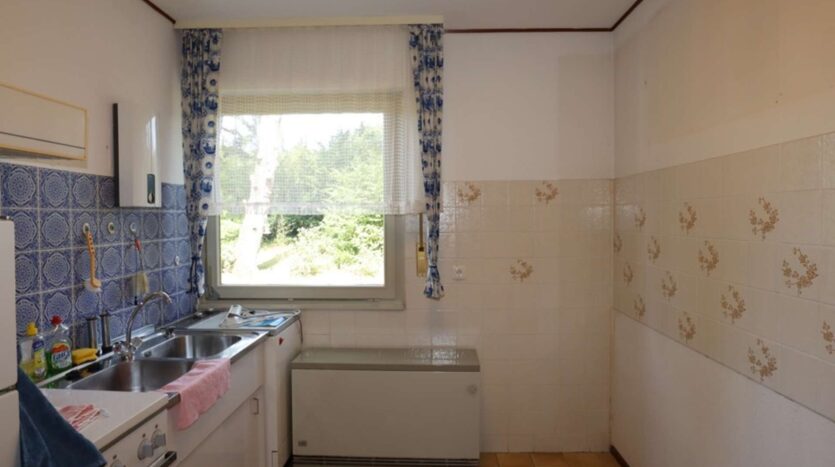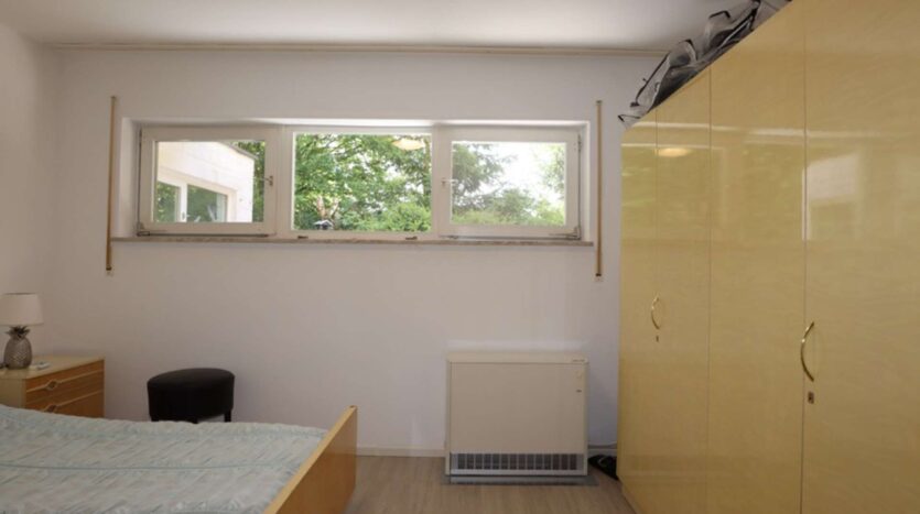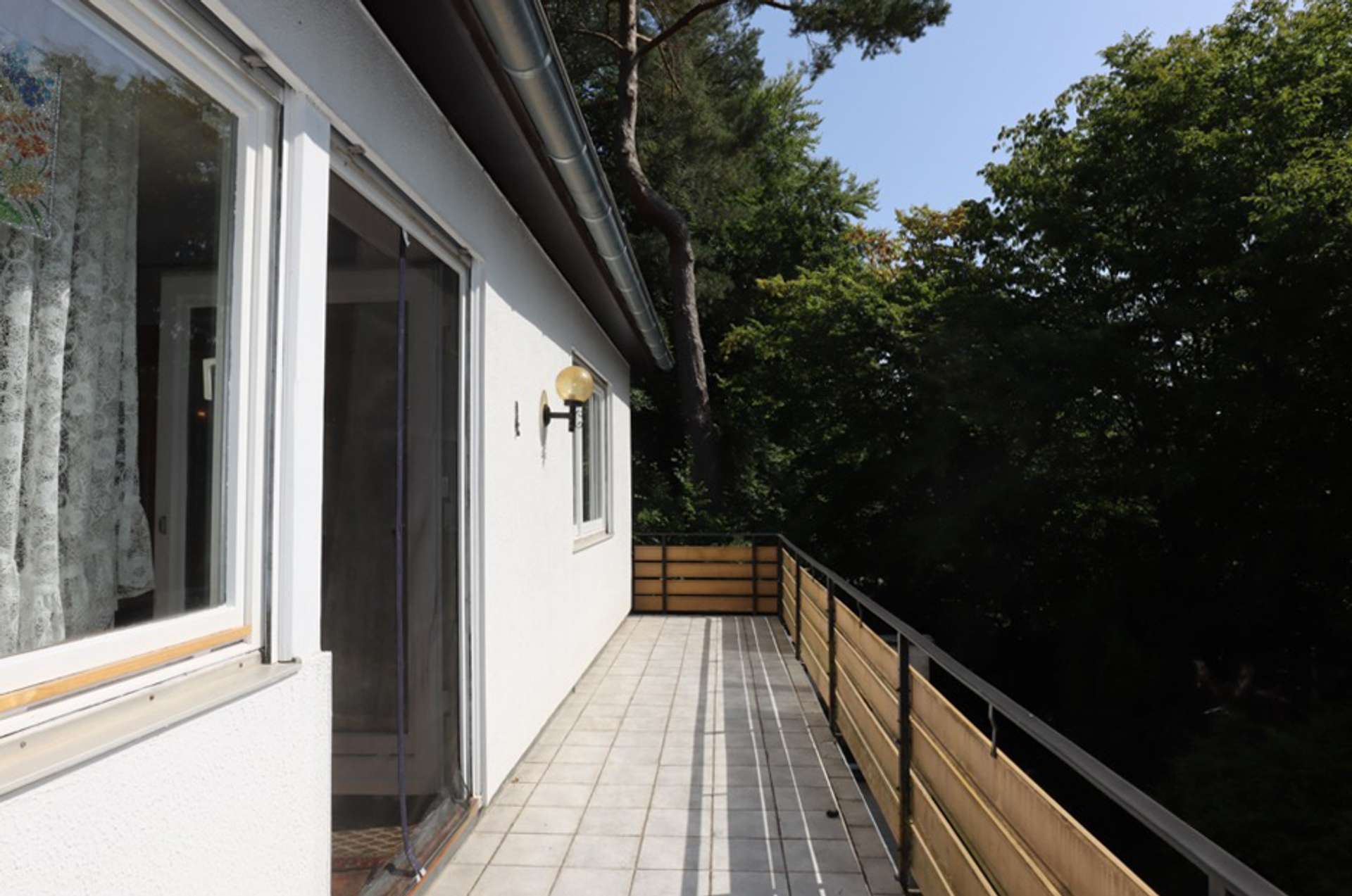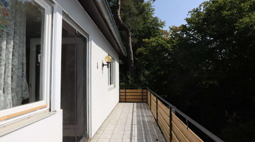 Das Erdgeschoss bietet mit einer Wohnfläche von 65 m2 Platz für zwei Schlafzimmer, ein Wohnzimmer mit Balkon, Küche, Flur und Bad. Das Bad wurde 2019 saniert. Der Balkon verläuft über die gesamte Hausseite und bildet einen wunderbaren Platz für den morgendlichen Kaffee, das Mittagessen oder das gemütliche Abendessen bei Vogelgezwitscher und dem Rauschen der Bäume.