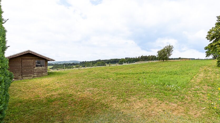 – Groot, vlak gazon achter de woning met een houten tuinhuisje
