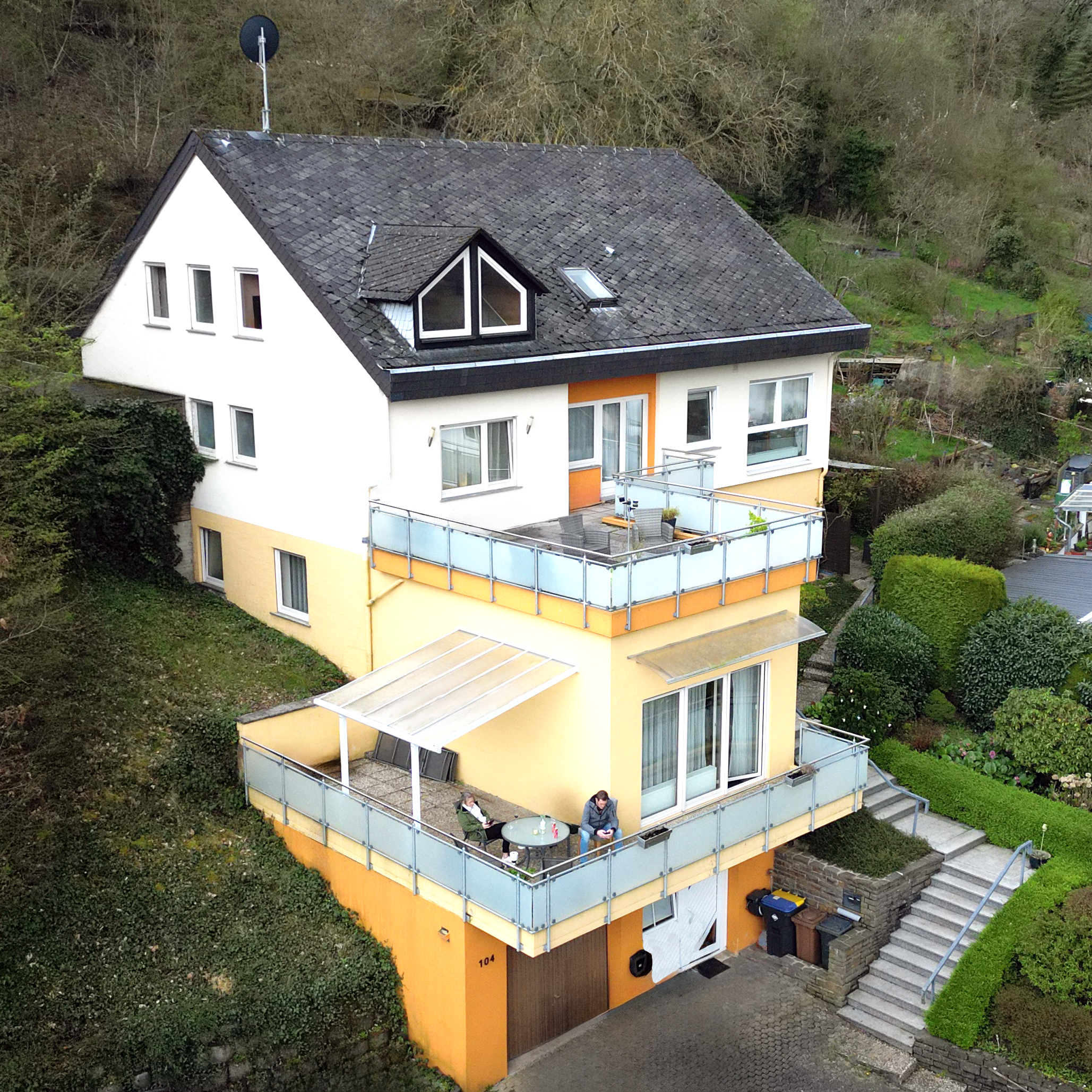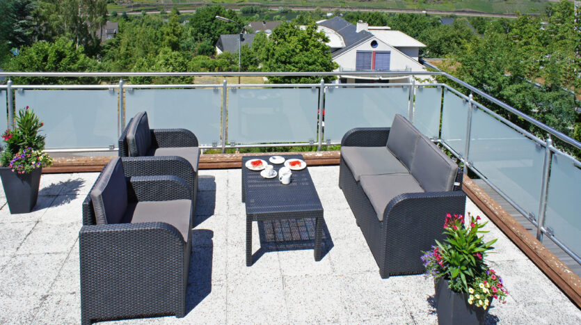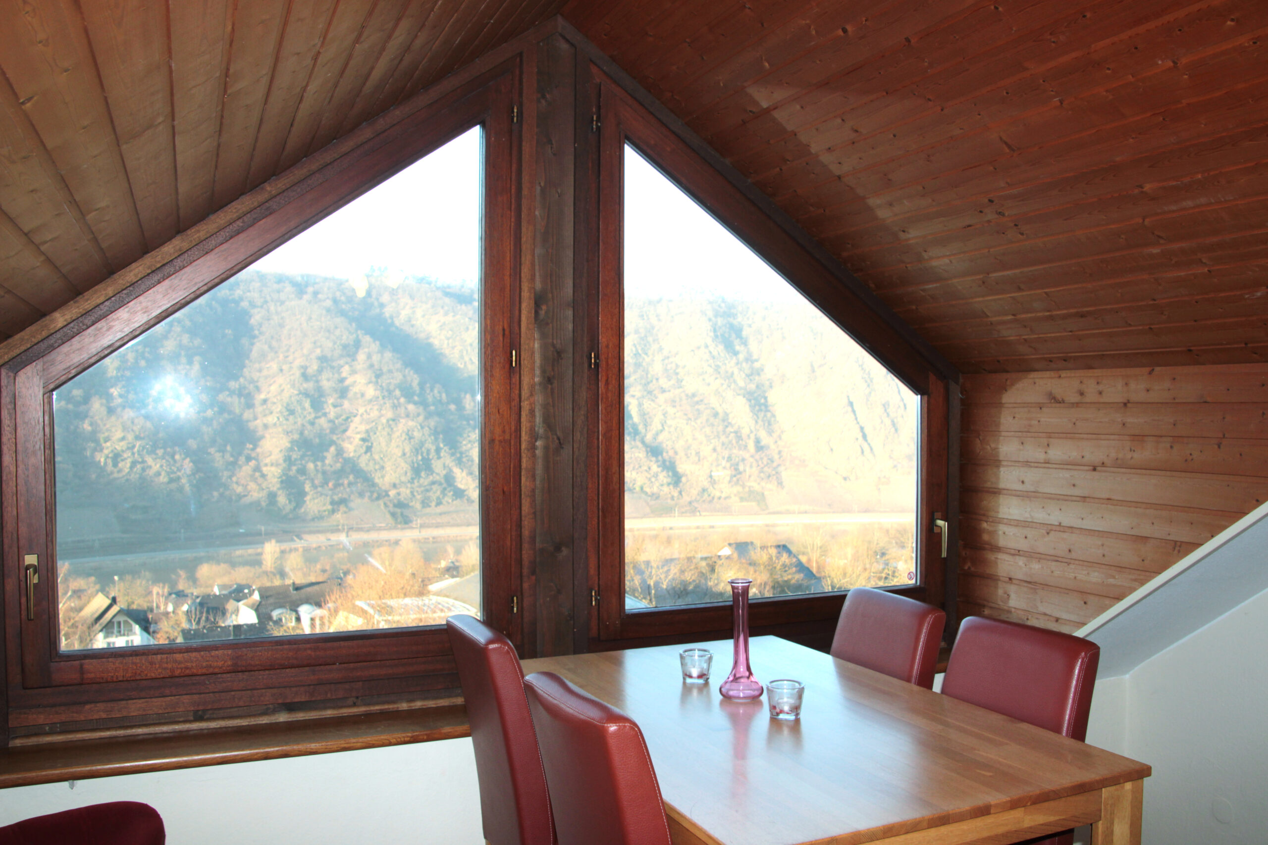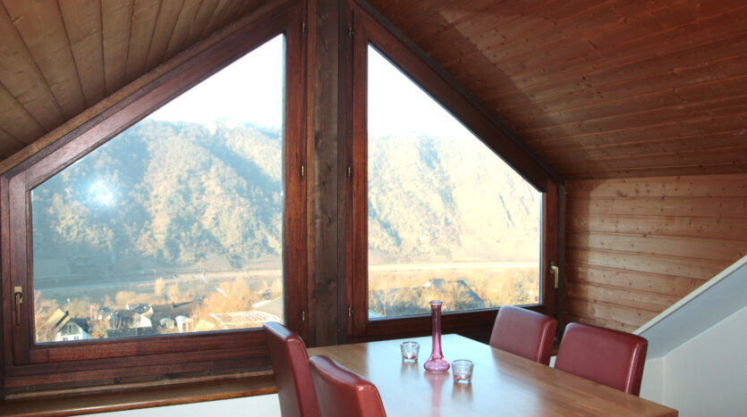 Het sfeervolle vakantiehuis van drie verdiepingen wordt gekenmerkt door zijn ruime terrassen met uitzicht op de Moezel, al vanaf de buitenkant.