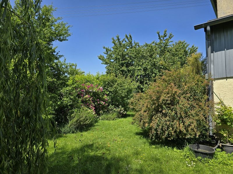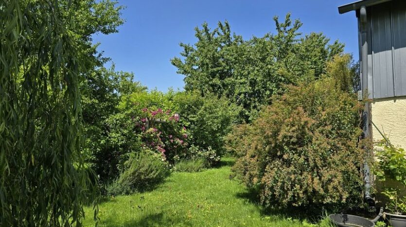 Links wurde das Wohnhaus durch einen großen Anbau mit Trapezblecheindeckung erweitert. Die gesamte Fläche wird als Lagerfläche genutzt. Hinter diesem Anbau befindet sich eine Terrasse mit einem kleinen Wintergarten. Von hier aus gelangt man auch in den Garten und auf das gesamte Grundstück. Das Anwesen ist mit zahlreichen Bäumen, Hecken, Sträuchern und Gräsern angelegt und bietet viel Privatsphäre.