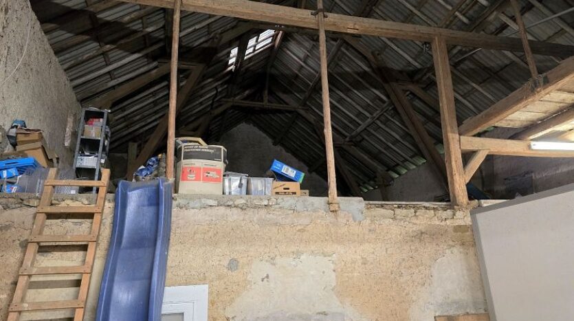 Rechts, in het verlengde van de woning, ligt het voormalige boerenerf met een stal, schuur en garage. Het ruime gebouw biedt uitstekende ruimte voor werk, ontspanning, opslag, auto’s, campers, boten, werkplaatsen en nog veel meer. De stalhoogte is circa 2,30 m. De schuurhoogte tot aan de nok is circa 8,90 m.