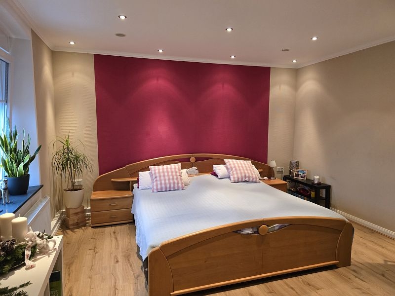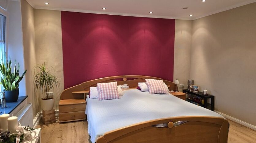 Über eine gut begehbare Holztreppe gelangt man in das erste Obergeschoss. Hier stehen 3. Schlafzimmer unterschiedlicher Größe und ein hübsch renoviertes Tageslichtbad mit Dusche, Badewanne, Doppelwaschtisch und Handtuchwärmer. Für die perfekte Ausleuchtung sorgt die moderne Ambientebeleuchtung in der Decke.