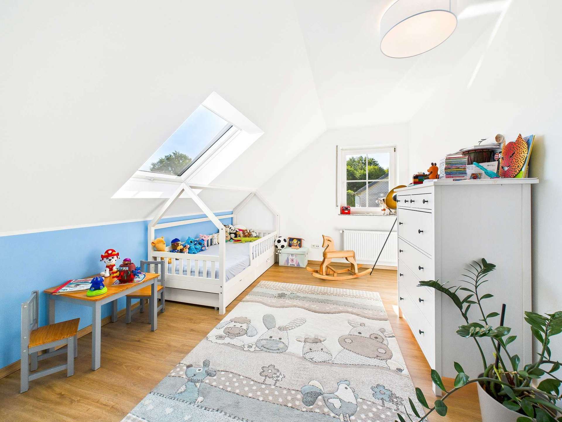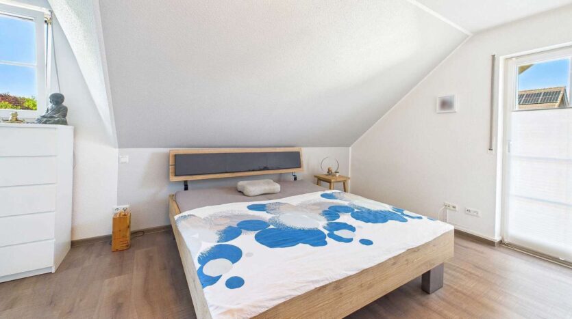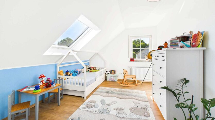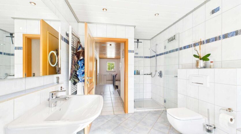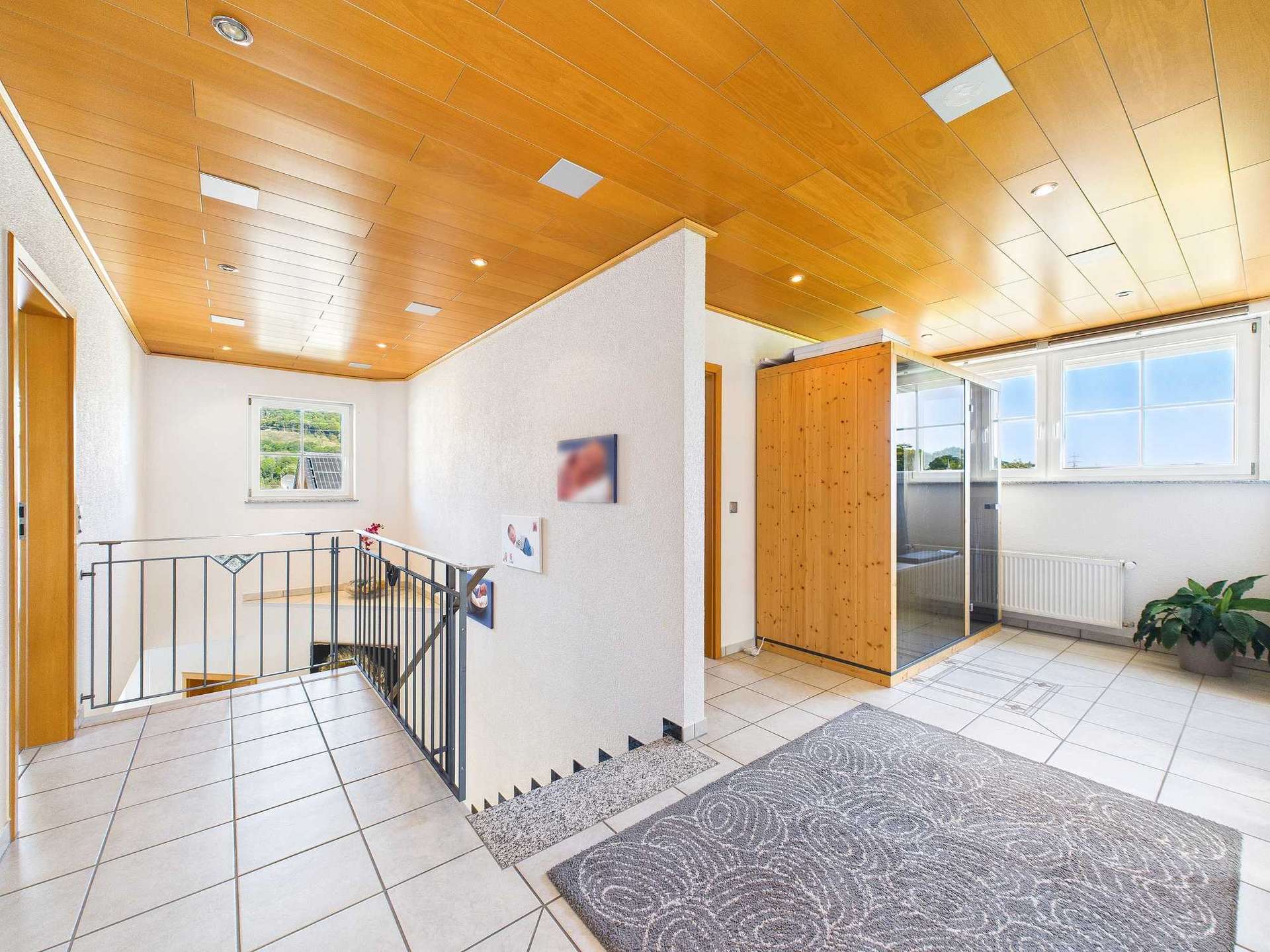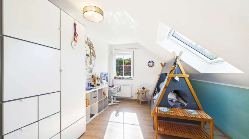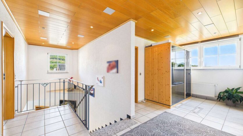 Das Obergeschoss ist klar auf Familienleben ausgelegt: Vier Schlafzimmer stehen hier zur Verfügung, zwei davon mit direktem Zugang zu einem Balkon. Das Badezimmer ist sowohl mit einer Wanne als auch mit einer Dusche ausgestattet. Als kleines Extra befindet sich im Flurbereich noch eine moderne Infrarotkabine, die zusätzlichen Komfort für die Bewohner schafft. Über dem Haus befindet sich der Speicher, dessen oberste Geschossdecke selbstverständlich gedämmt ist.