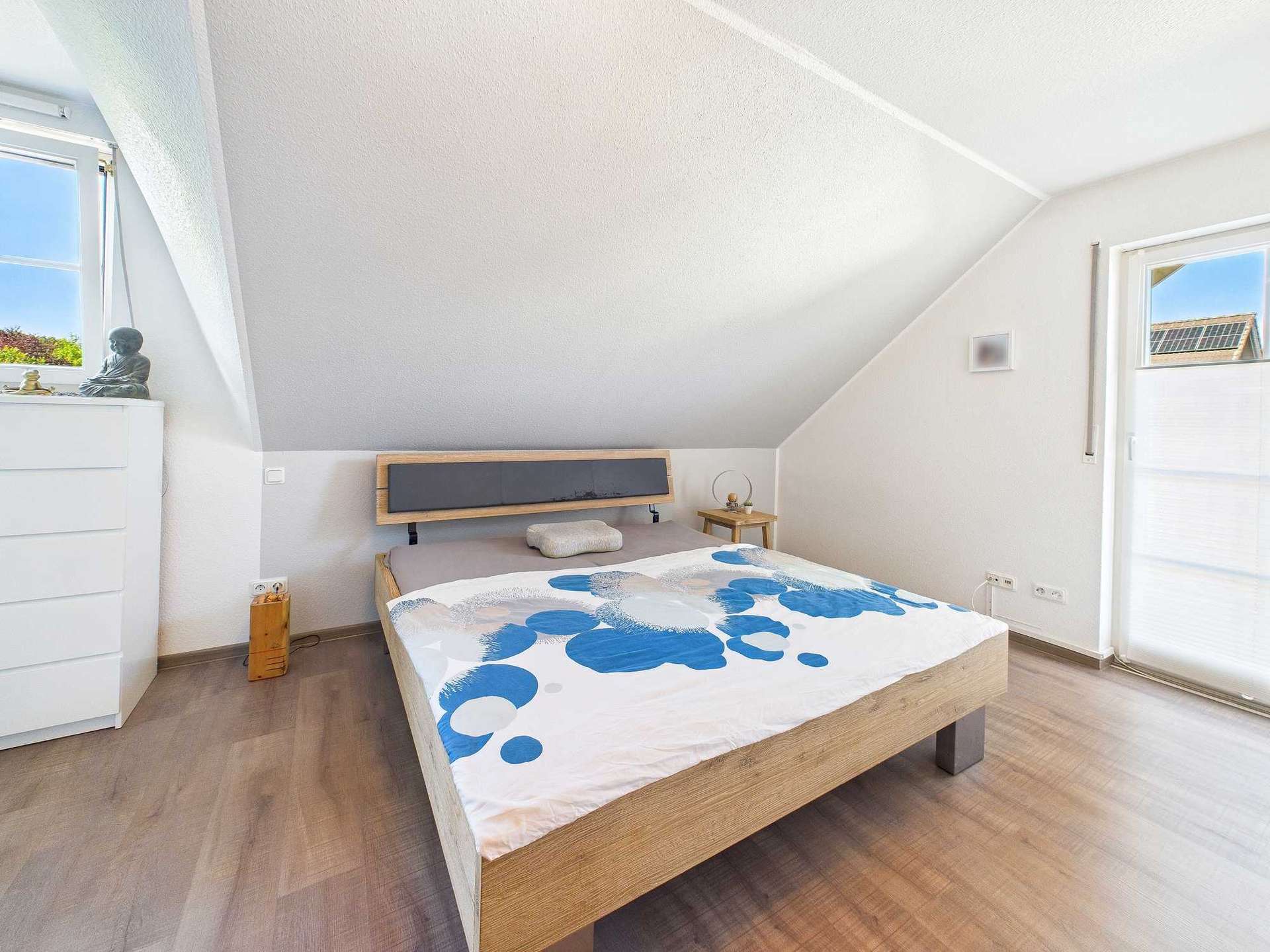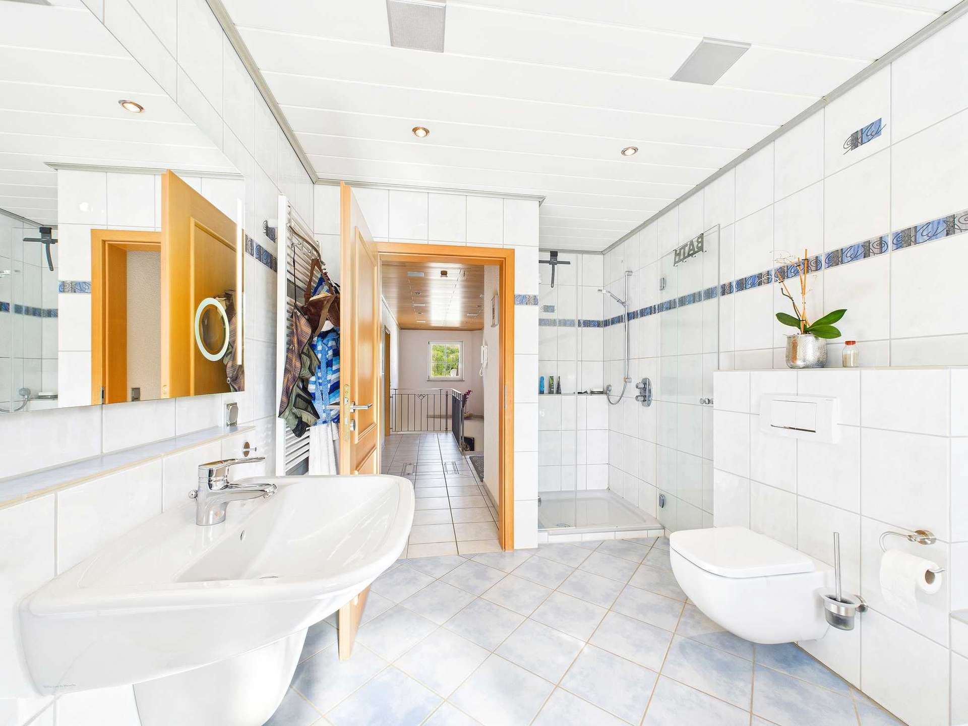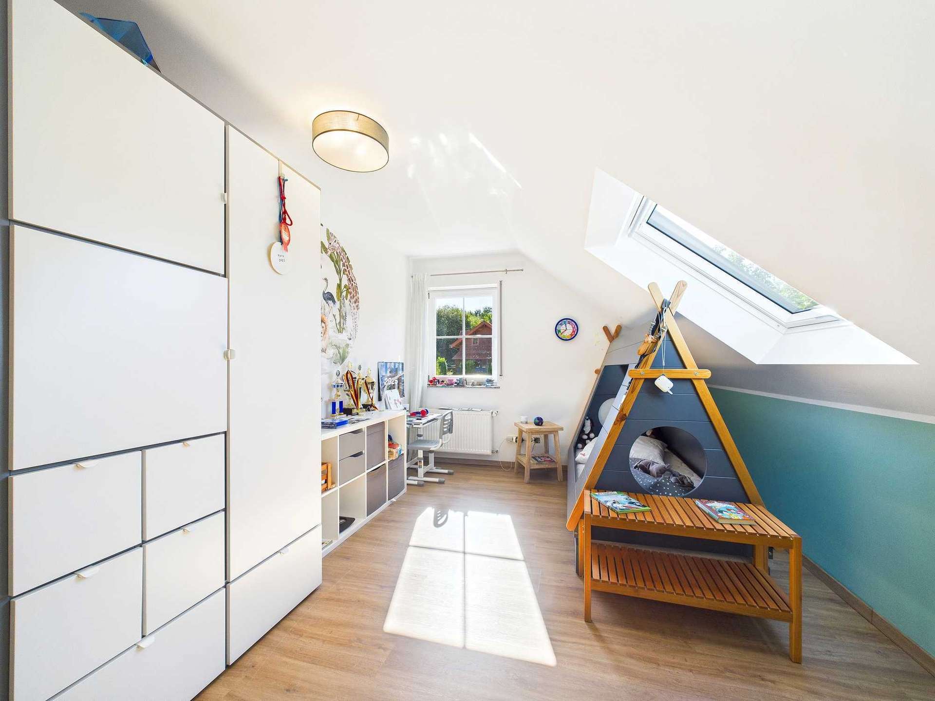 Das Obergeschoss ist klar auf Familienleben ausgelegt: Vier Schlafzimmer stehen hier zur Verfügung, zwei davon mit direktem Zugang zu einem Balkon. Das Badezimmer ist sowohl mit einer Wanne als auch mit einer Dusche ausgestattet. Als kleines Extra befindet sich im Flurbereich noch eine moderne Infrarotkabine, die zusätzlichen Komfort für die Bewohner schafft. Über dem Haus befindet sich der Speicher, dessen oberste Geschossdecke selbstverständlich gedämmt ist.