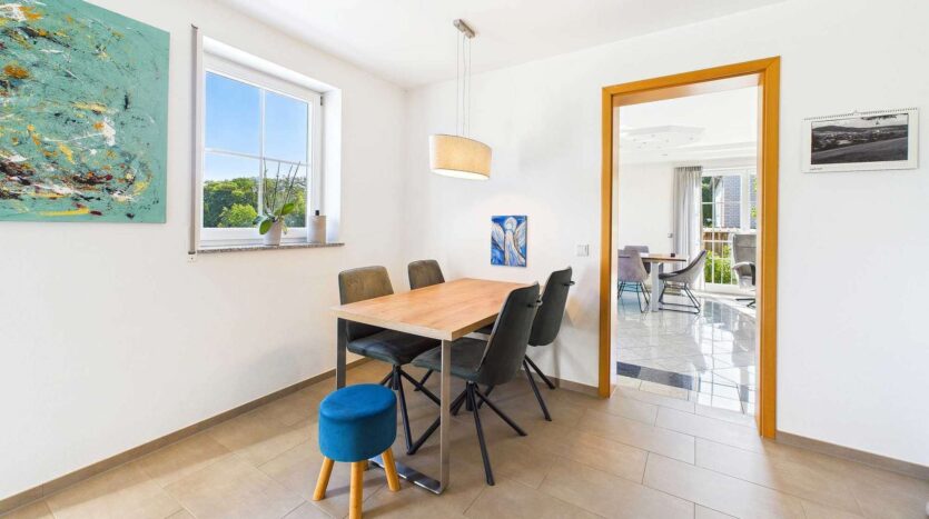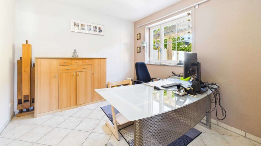 Mit einer Wohnfläche von ca. 190 m² in der Hauptwohnung bietet das Haus ausreichend Platz für eine größere Familie, für Mehrgenerationenwohnen oder auch für die Kombination von Wohnen und Arbeiten. Im Erdgeschoss erwartet Sie ein großzügiges Wohn- und Esszimmer, das durch seine Helligkeit und Offenheit besticht. Die angrenzende Küche ist ebenfalls sehr großzügig bemessen, verfügt über einen praktischen Abstellraum und bietet Zugang zu einem Balkon – ideal für kurze Wege zwischen Innen- und Außenbereich. Ein zusätzliches Büro, das ebenso als Gäste- oder Hobbyzimmer genutzt werden kann, sowie ein Gäste-WC komplettieren diese Ebene.