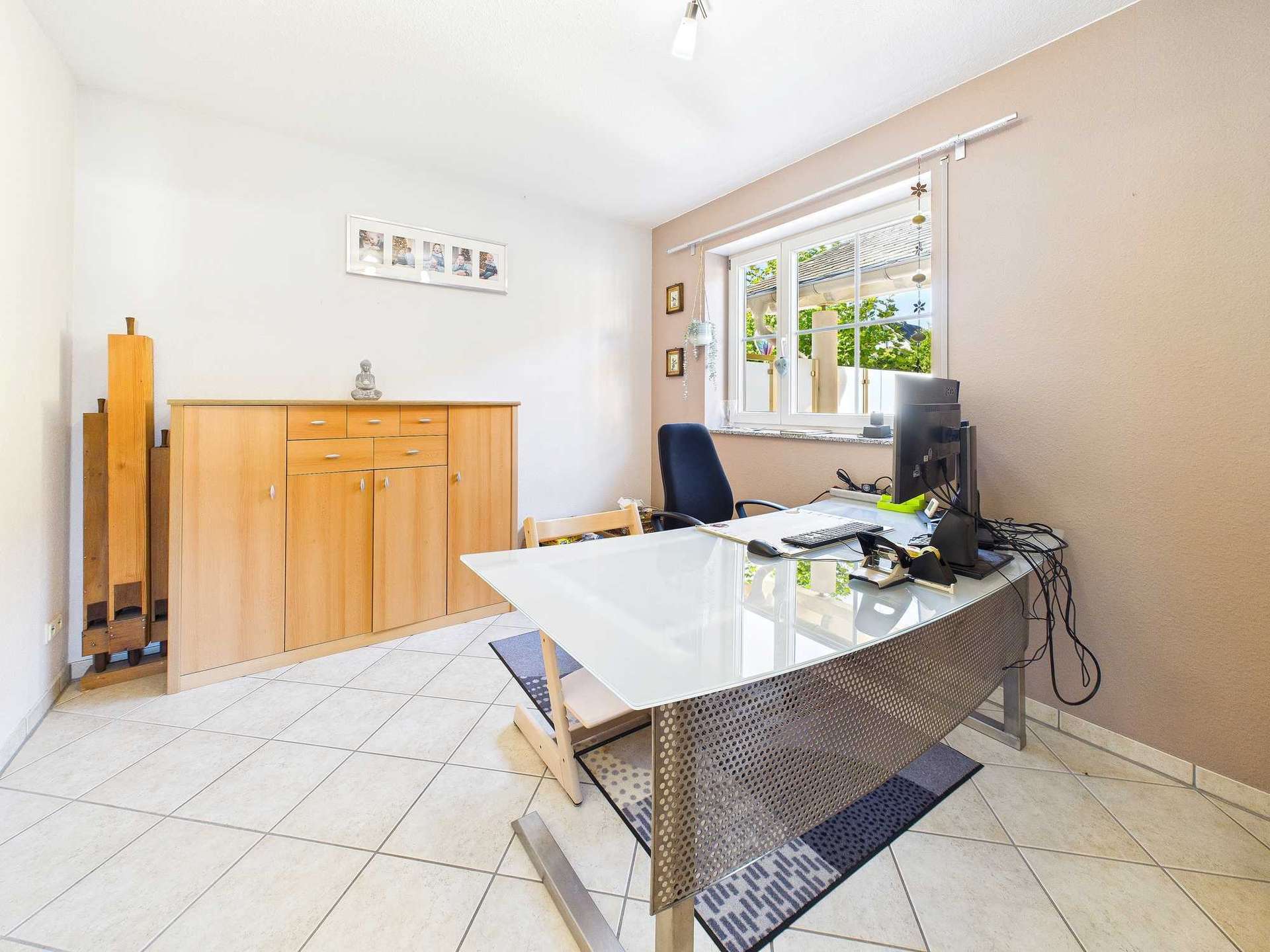 Ergänzt wird das Raumangebot durch die unterkellerte Garage, ein Carport sowie zwei weitere Außenstellplätze. Der Nebeneingang führt in den Kellergeschossbereich, wo zur Hauptwohnung zusätzliche Abstell- und Funktionsräume gehören. Neben dem Hauswirtschaftsraum mit Dusche und Waschmaschinenanschluss befindet sich hier auch ein beheizter Hobbyraum mit separatem Außenzugang. Dieser Raum eignet sich ideal als Büro, um Kunden zu empfangen, ohne die privaten Wohnräume betreten zu müssen. Sämtliche Anschlüsse für eine Küche sind vorhanden, sodass der Raum alternativ auch als eigenständige Wohneinheit genutzt oder über einen Durchbruch an die Einliegerwohnung angeschlossen werden könnte.