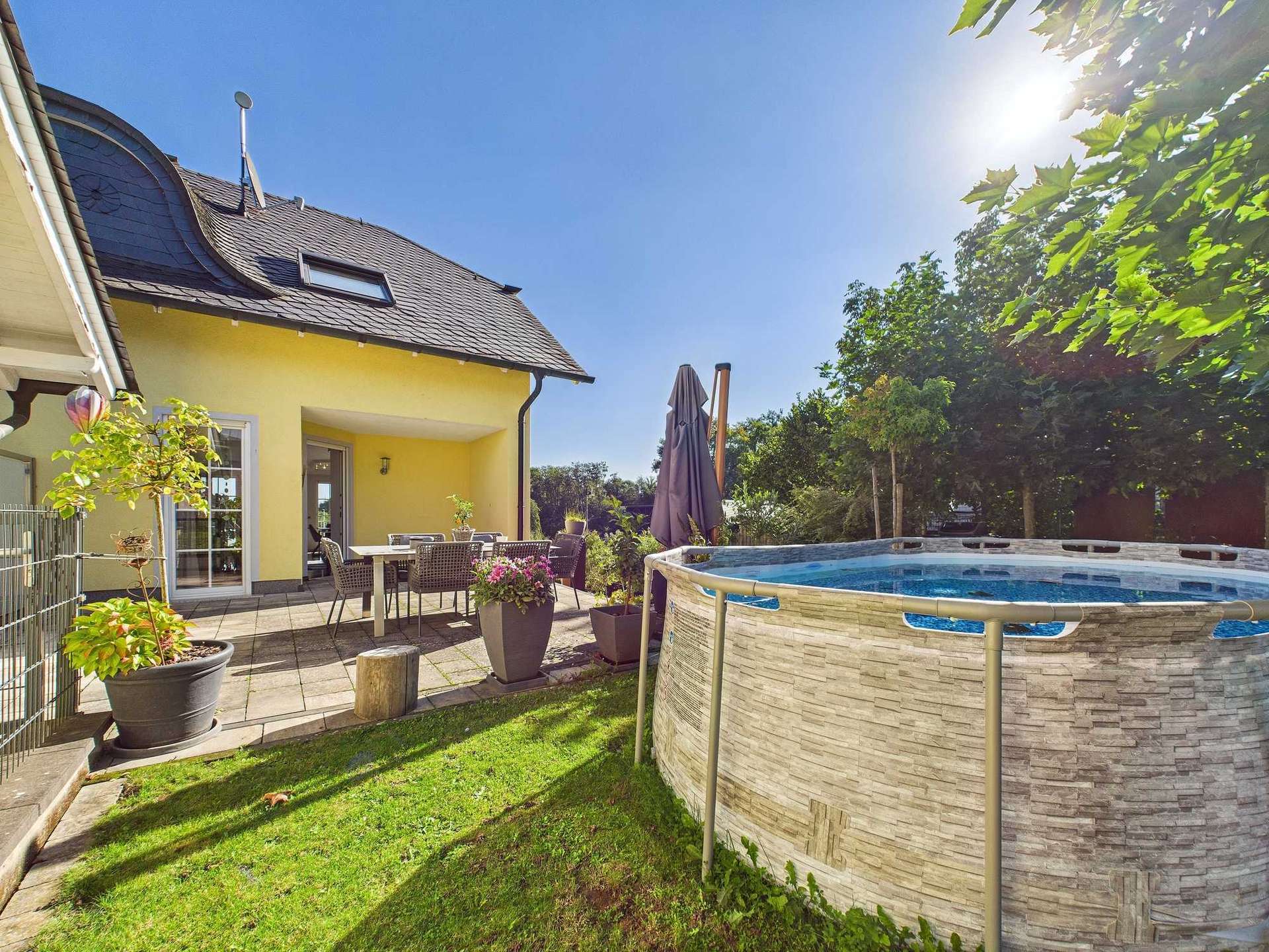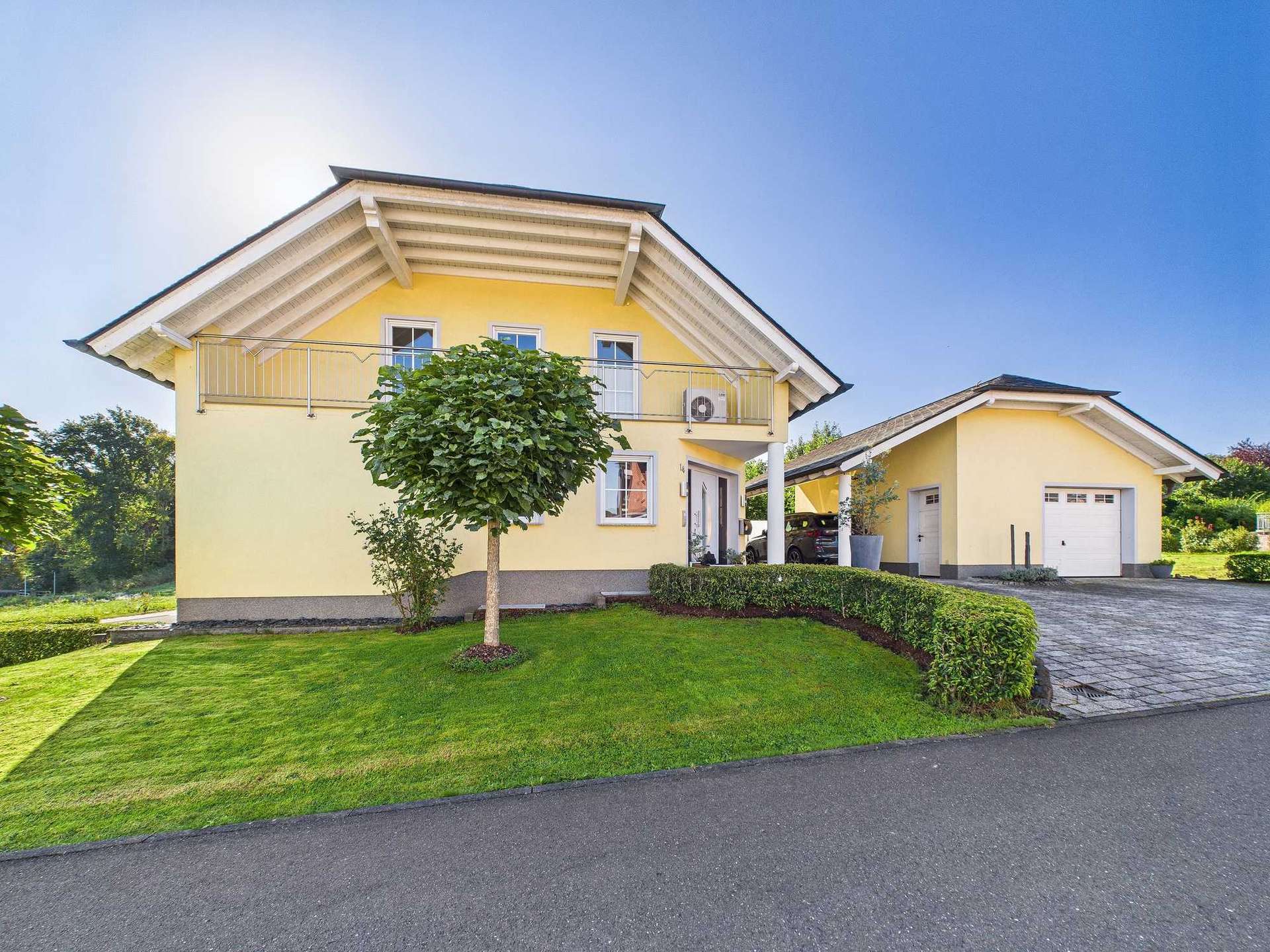 Dieses im Jahr 2001 massiv erbaute Wohnhaus überzeugt auf den ersten Blick durch seine hochwertige Bauausführung und die durchdachte Architektur. Errichtet mit einem wärmedämmenden Stein, bietet es nicht nur eine langlebige Substanz, sondern auch ein behagliches Wohnklima. Das großzügige Eckgrundstück mit rund 770 m² liegt zentral im Ort aber mit Ortsrandcharakter und eröffnet einen unverbaubaren Blick in die Umgebung – ein Standort, der Wohnen und Wohlfühlen auf besondere Weise vereint.