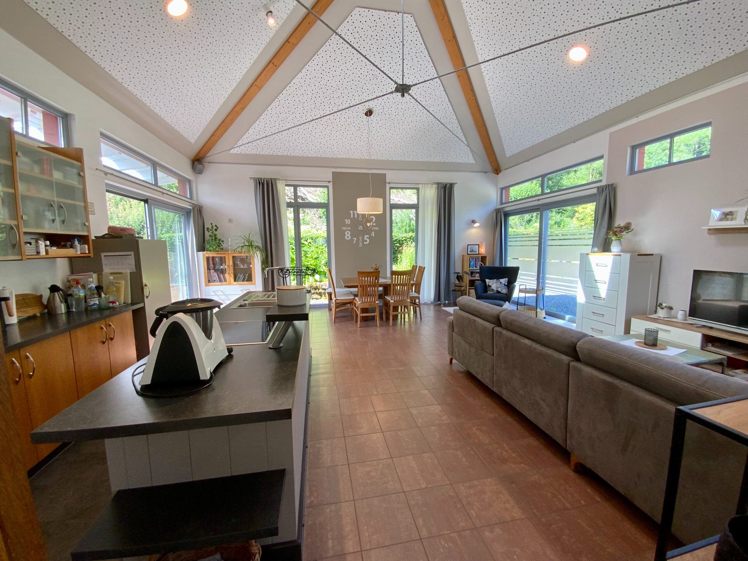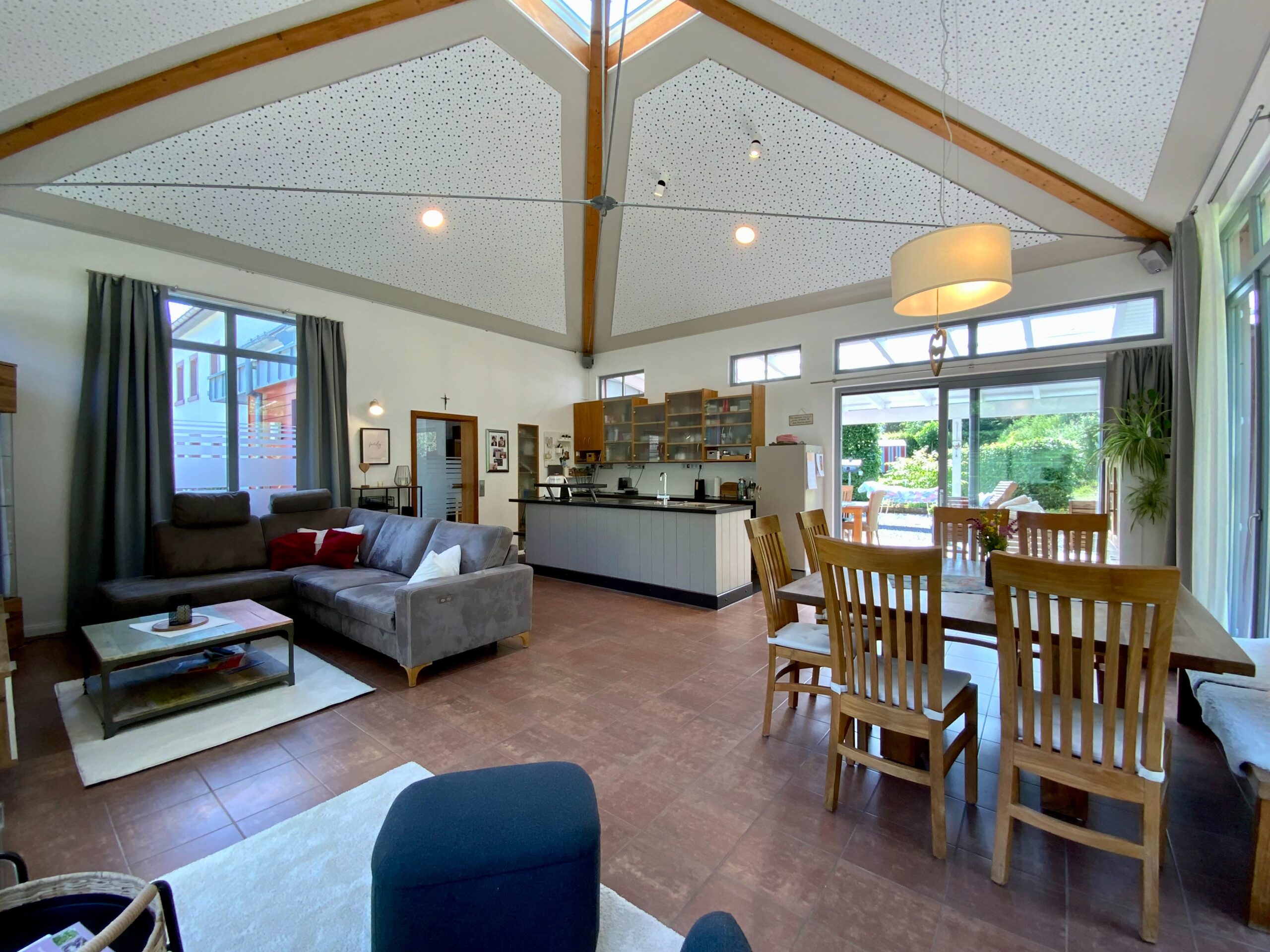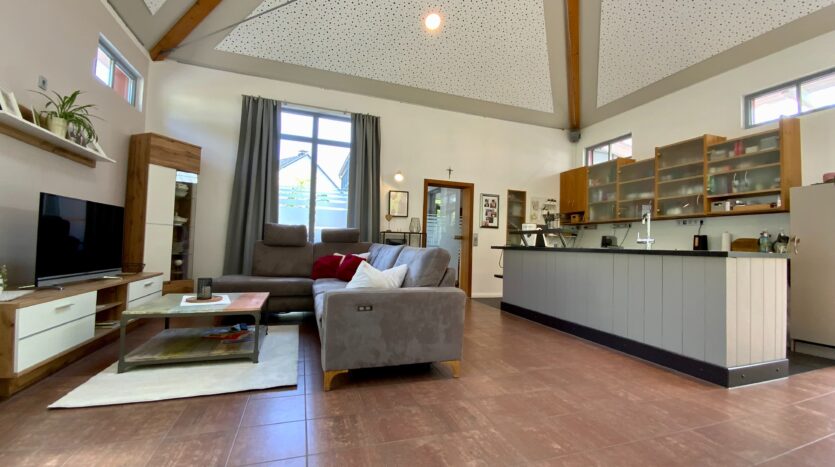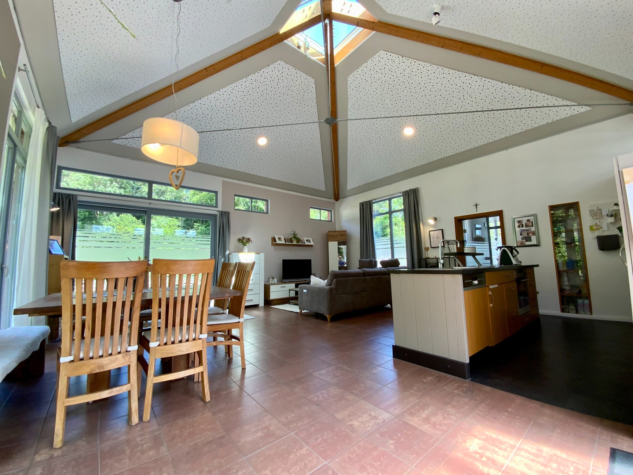Der Massivbauteil des Hauses ist mit hochwertigem Naturschiefer gedeckt, der Holzständer-Anbau verfügt über eine moderne Blecheindeckung. In der Raummitte befindet sich eine Glaskuppel, die sich bequem elektrisch öffnen lässt – ideal für natürliche Belüftung und Belichtung.