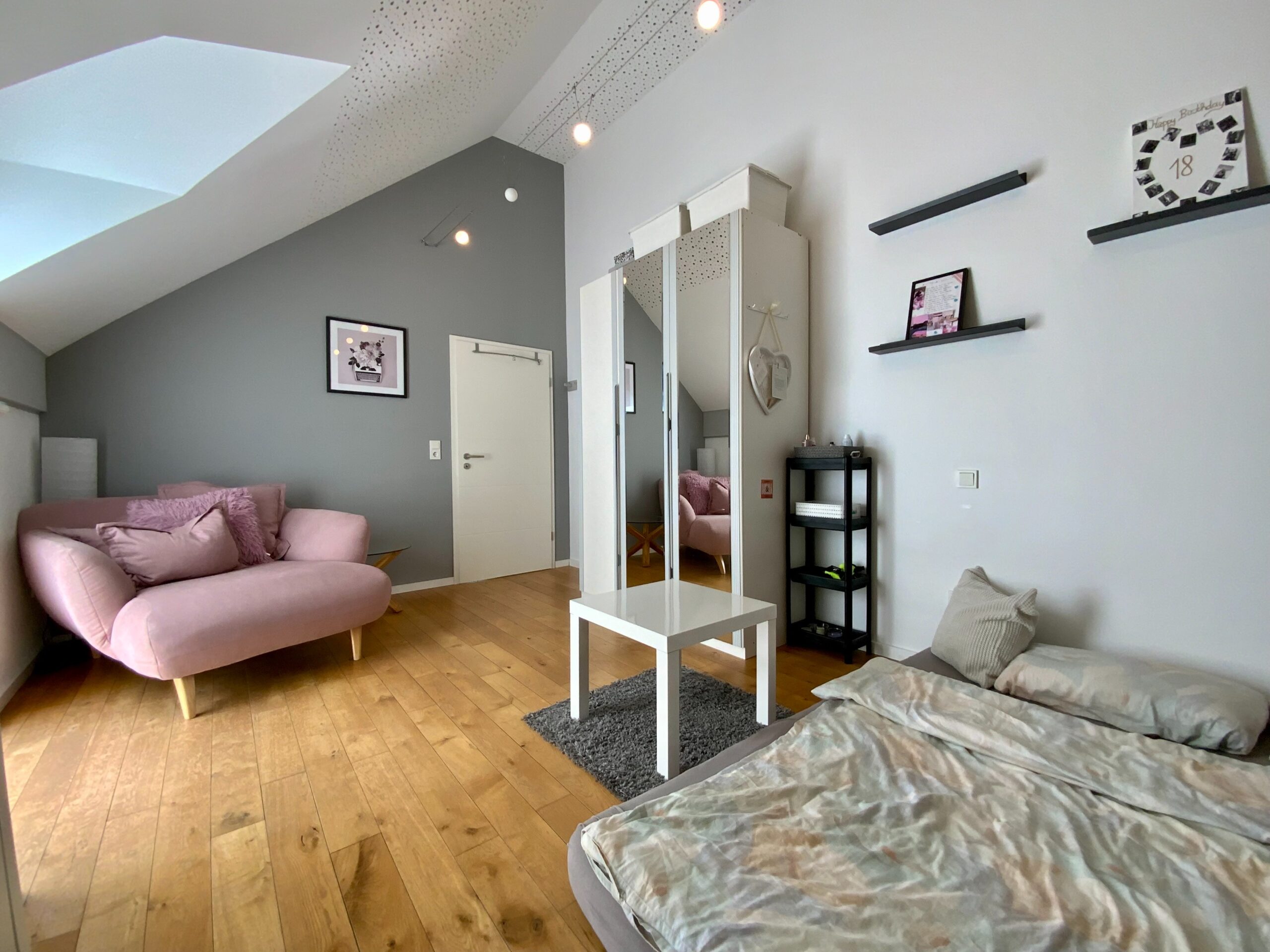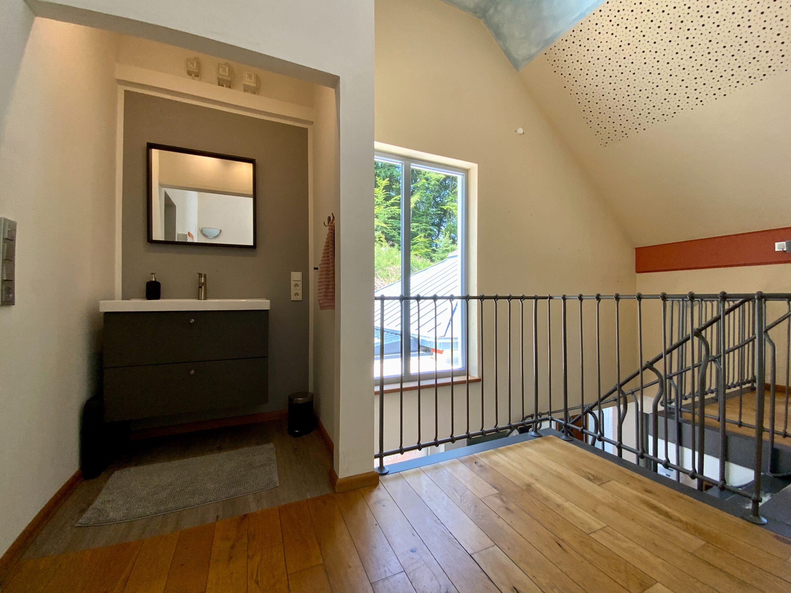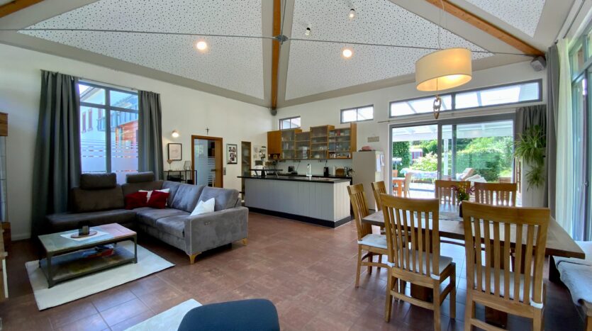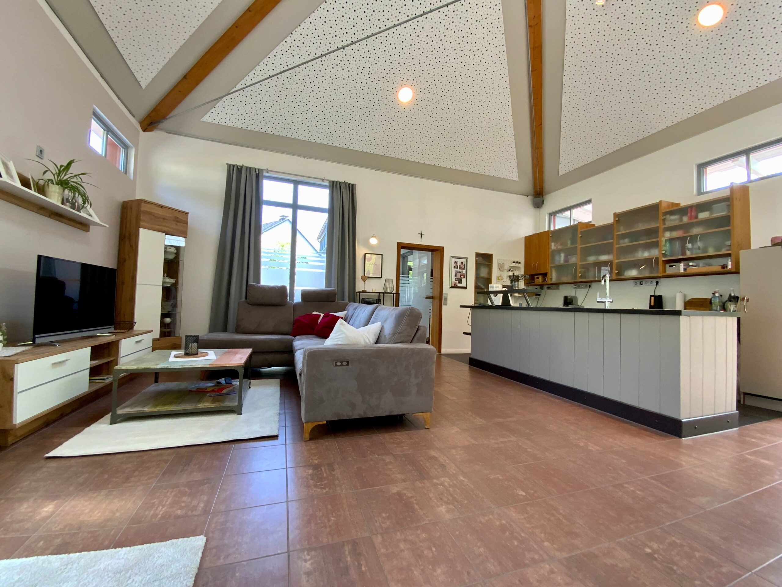 Der Massivbauteil des Hauses ist mit hochwertigem Naturschiefer gedeckt, der Holzständer-Anbau verfügt über eine moderne Blecheindeckung. In der Raummitte befindet sich eine Glaskuppel, die sich bequem elektrisch öffnen lässt – ideal für natürliche Belüftung und Belichtung.