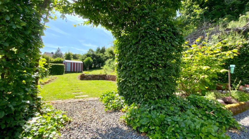 Die Grundstücksfläche von ca. 847 m² ist liebevoll gestaltet und umgeben von Buchenhecken, Sträuchern, Blumen und gepflegtem Baumbestand. Direkt am Haus befindet sich eine große überdachte Terrasse (ca. 8 m × 4 m, also ca. 32 m²) mit Zugang zum Garten. Das Grundstück bietet Privatsphäre und grenzt direkt an einen malerischen Waldweg.