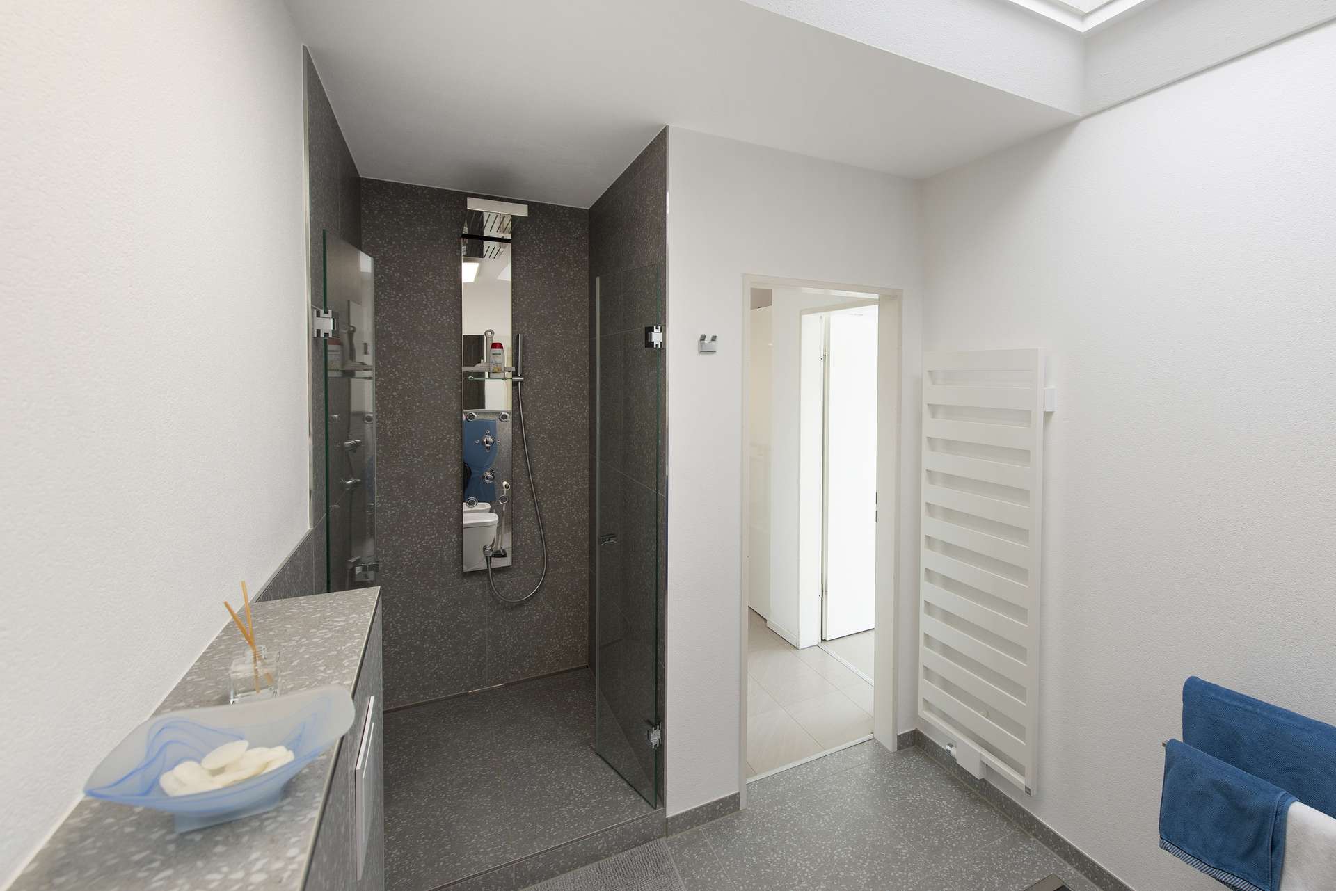 Im Obergeschoss erwarten Sie bis zu drei gut geschnittene Schlafzimmer, eines davon mit Balkon und traumhaftem Fernblick ins Grüne – ein Ort zum Durchatmen! Das stilvolle Familienbad wurde 2021 vollständig saniert und begeistert mit hochwertiger Ausstattung, bodentiefer XXL-Dusche und modernem Design.