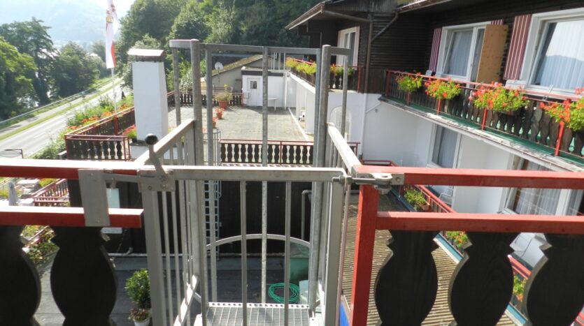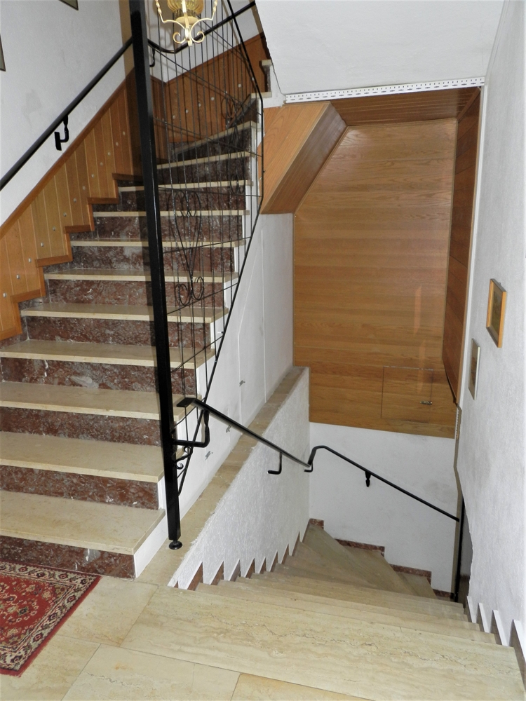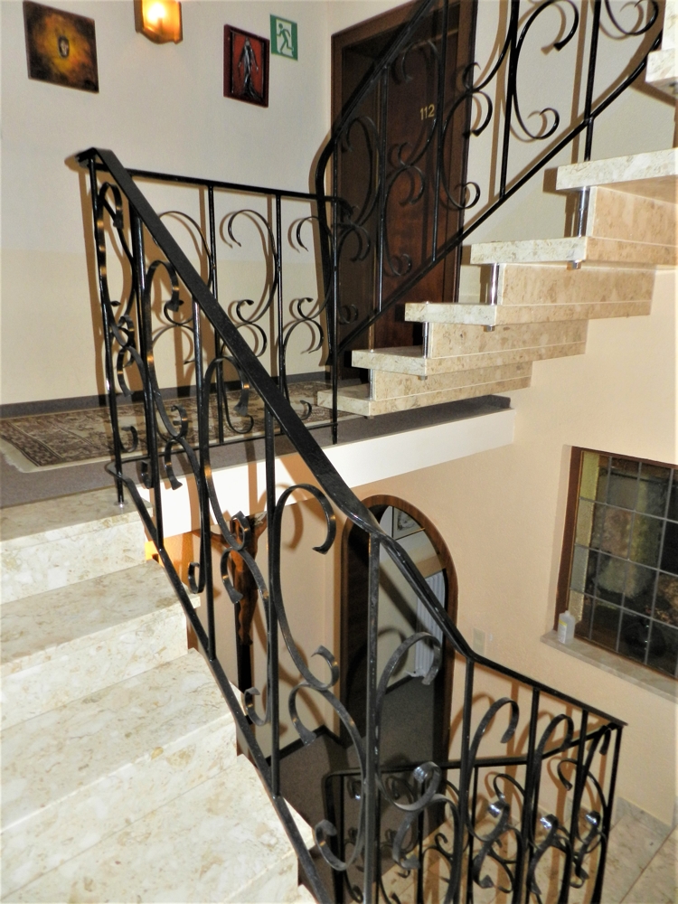 - 3 Treppenhäuser, kein Aufzug (auch baulich schwer zu integrieren, und wenn doch, dann nur für einen Teil der Zimmer ohne Stufen erreichbar), Treppenlifter zum 1. OG von der Ebene der Rezeption aus vorhanden