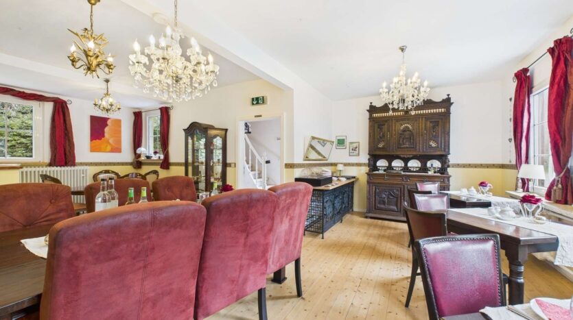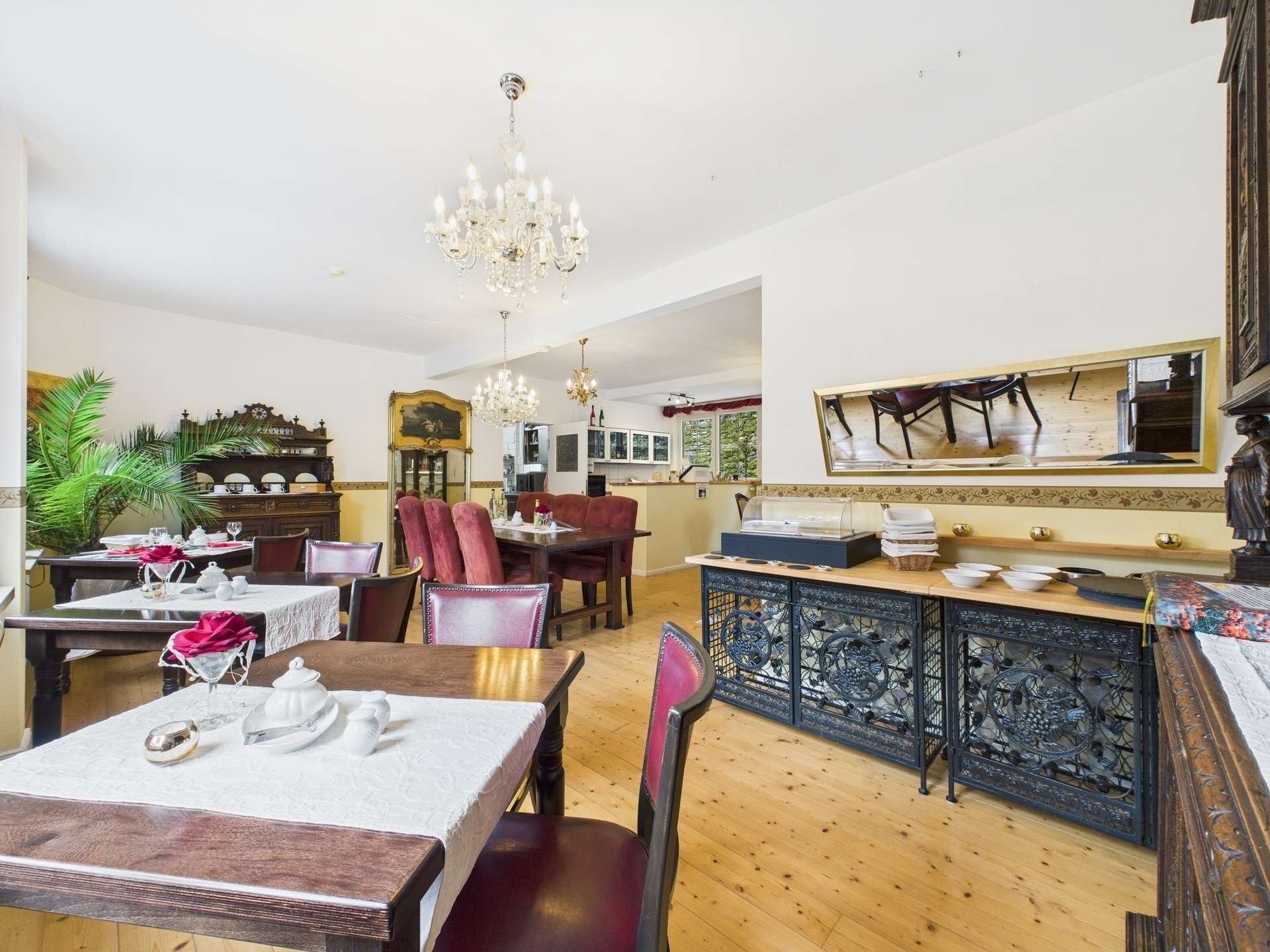 Der Frühstücksbereich mit angeschlossener Rezeption lädt im Erdgeschoss zu geselligen Morgenstunden ein, während die professionell ausgestattete Industrieküche beste Voraussetzungen für eine reibungslose Bewirtung schafft. Eine nahegelegene Felsquelle versorgt das Haus mit herrlich frischem Wasser und unterstreicht den naturnahen Charakter dieser einzigartigen Immobilie.