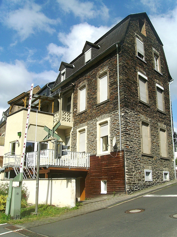 Traben-Trarbach/district Traben: Te renoveren hoekwoning met terras en parkeerplaats te koop nabij de Moezel.