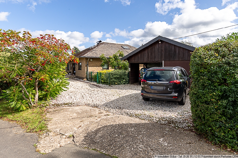 - massive Fertiggarage sowie Holz-Carport mit Satteldach und Holzlager neben dem Haus