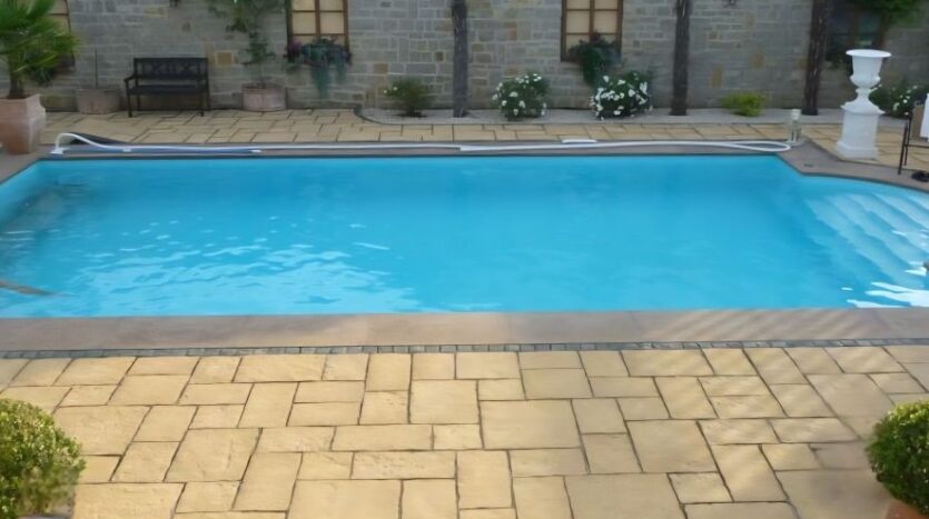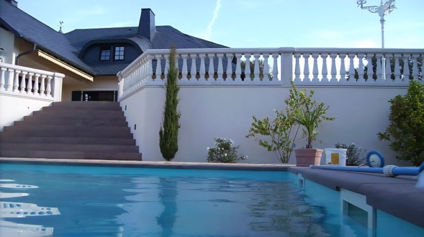 Im Innenhof befindet sich eine herrlich angelegte Außenterrasse mit Zierteich und nahtlosem Übergang auf die vorhandene Grünfläche. Von hier aus genießen Sie einen unbeschreiblich schönen Blick auf den ca. 9,20 x 4,50 Meter großen und beheizten Außenpool und auf das hübsche, massiv gebaute Saunahaus mit Dusche.
