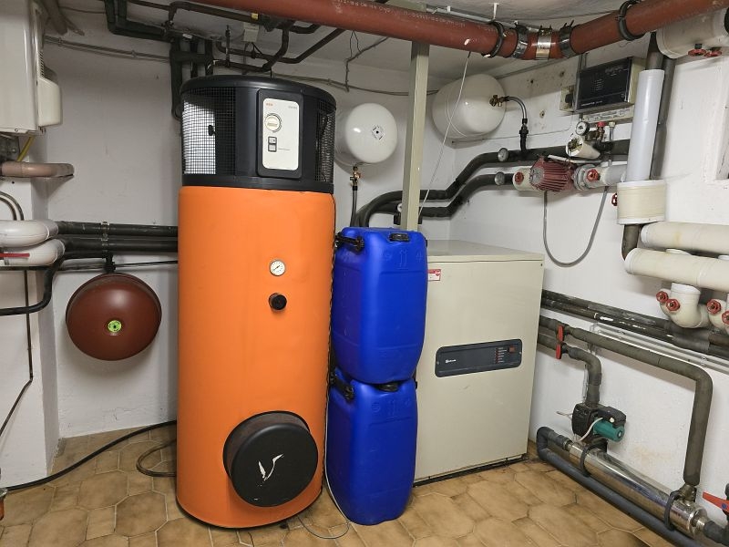 Die vorhandene Ölheizung kann je nach Jahreszeit zum schnelleren Aufheizen des Außenpools zugeschaltet werden.