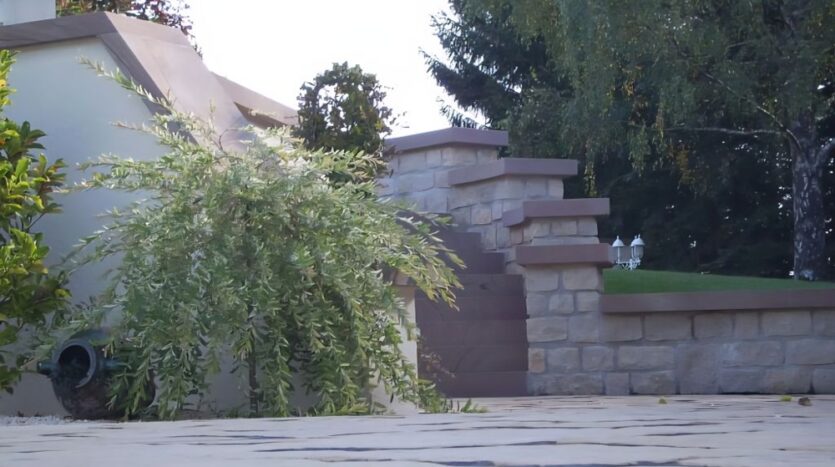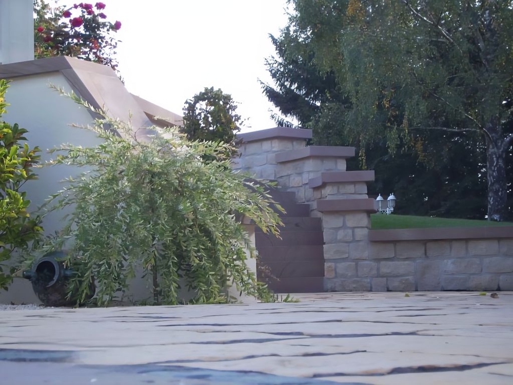 Eine leicht geschwungene Treppe aus maßgefertigten Sandsteinstufen verbindet die Außenterrasse mit dem Schwimmbad und dem Saunabereich.