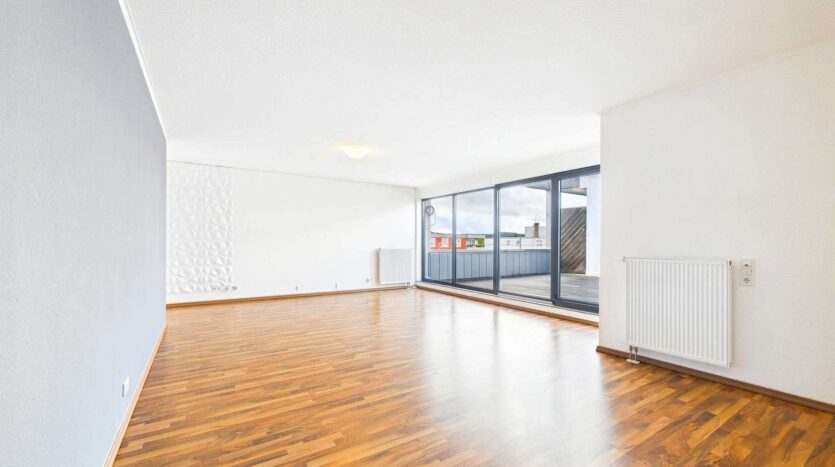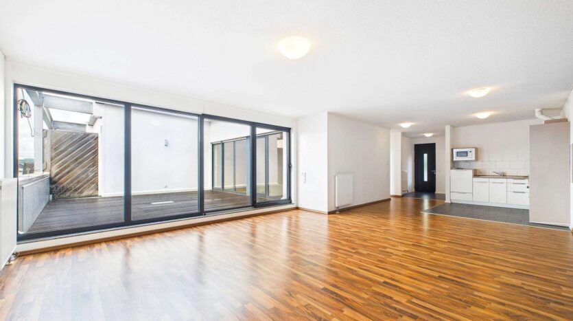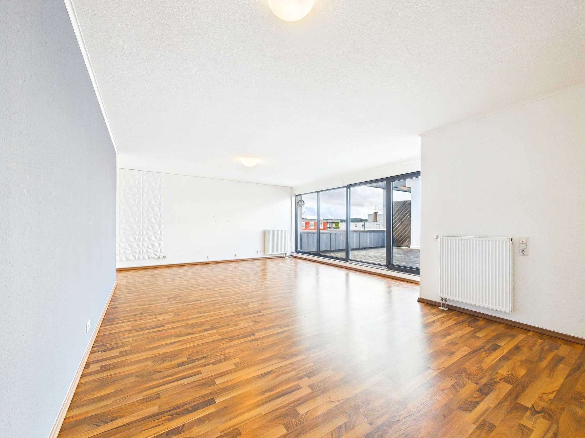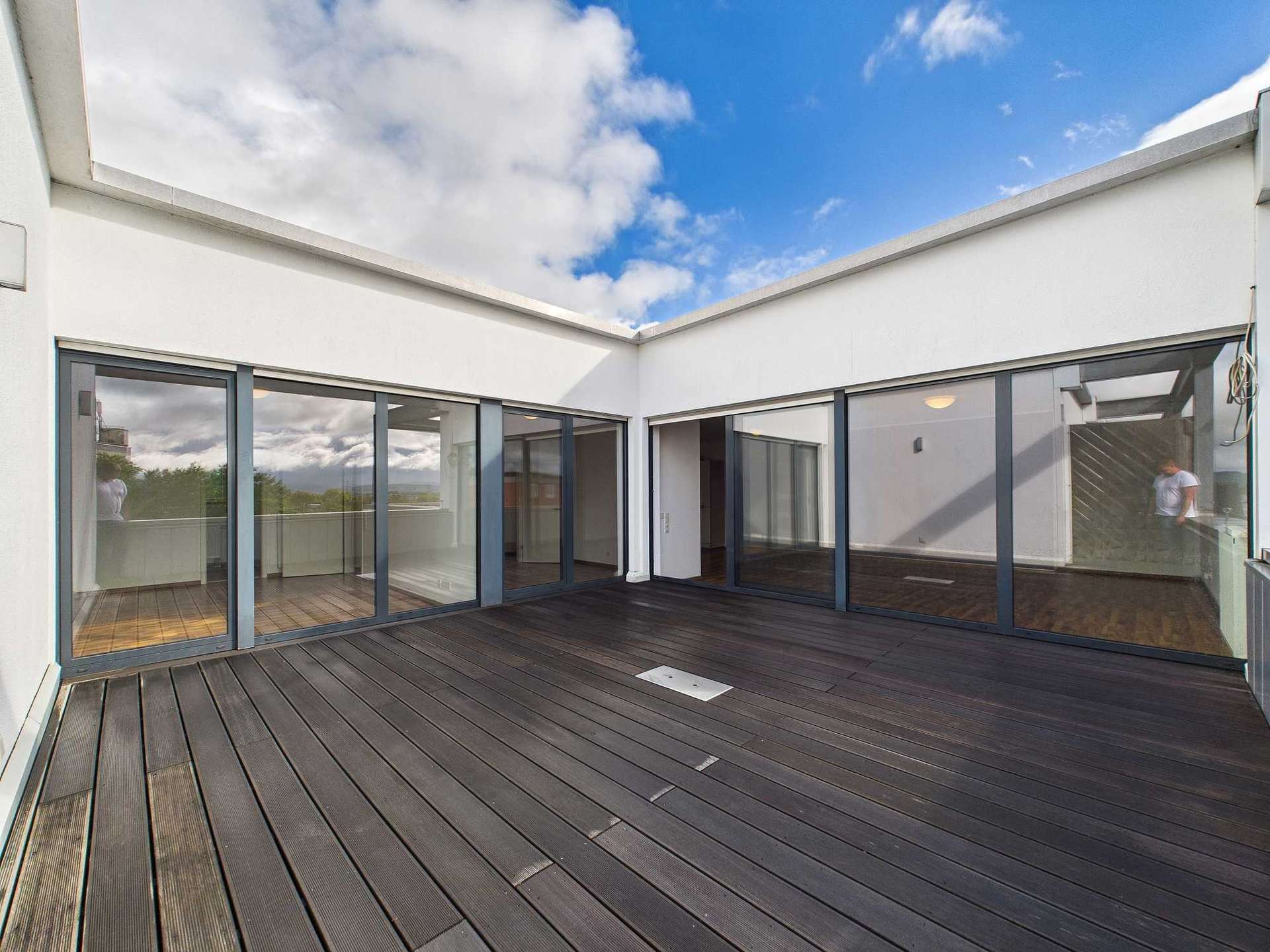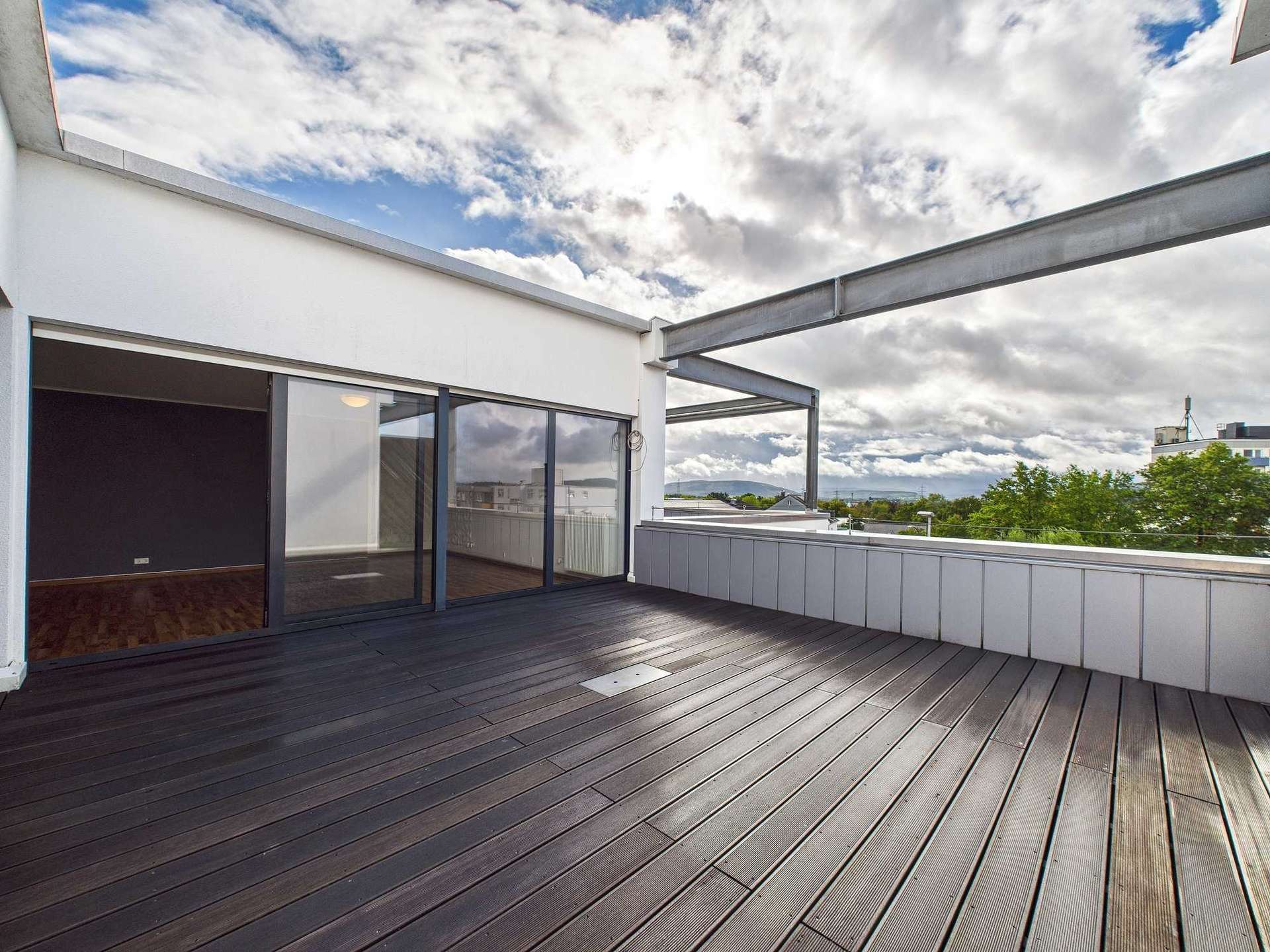Herzstück der Wohnung ist der großzügig geschnittene Wohn- und Essbereich mit direktem Zugang zur weitläufigen Dachterrasse. Diese bietet einen idealen Rückzugsort für sonnige Stunden, entspannte Abende oder geselliges Beisammensein im Freien. Große Fensterflächen sorgen im Innenbereich für ein angenehmes, lichtdurchflutetes Wohnambiente.