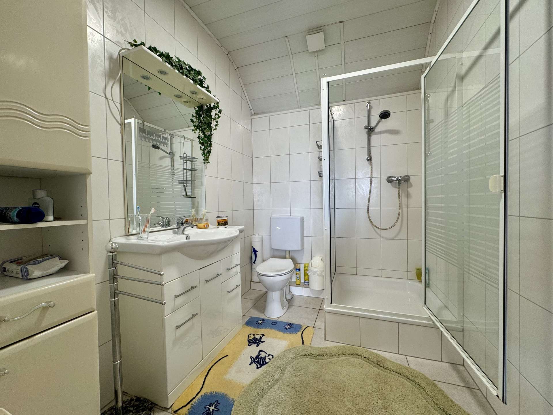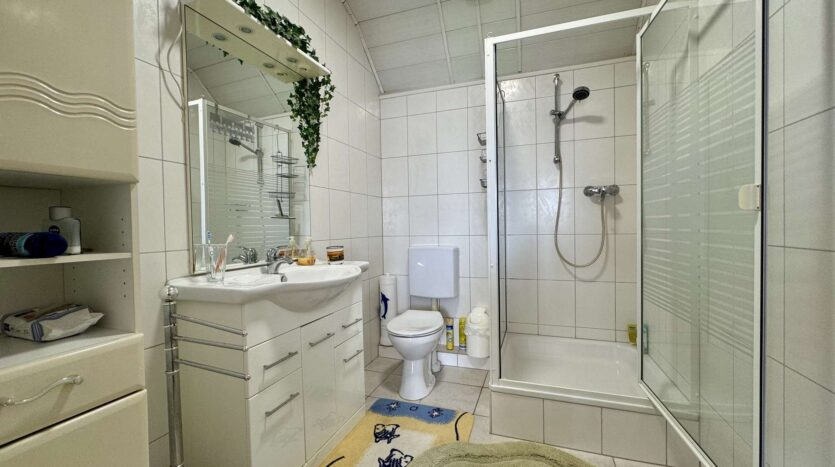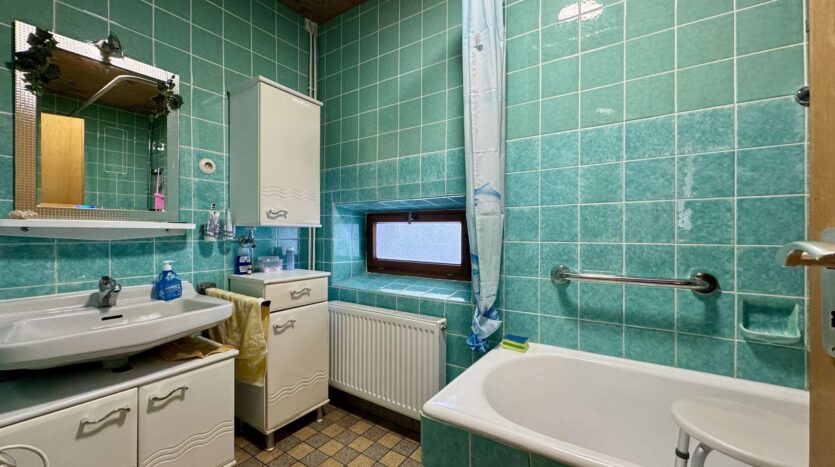 Das linke Wohnhaus beeindruckt mit einem einladenden Eingangsbereich, der links in ein geräumiges Wohnzimmer und gegenüber in eine große Küche mit Essbereich führt. Ebenfalls im Erdgeschoss befinden sich ein Schlafzimmer, ein Badezimmer mit Wanne, ein separates WC sowie ein Abstellraum mit Heizung. Ein Anbau ergänzt das Raumangebot um zwei weitere Zimmer, die derzeit als Stauraum genutzt werden.