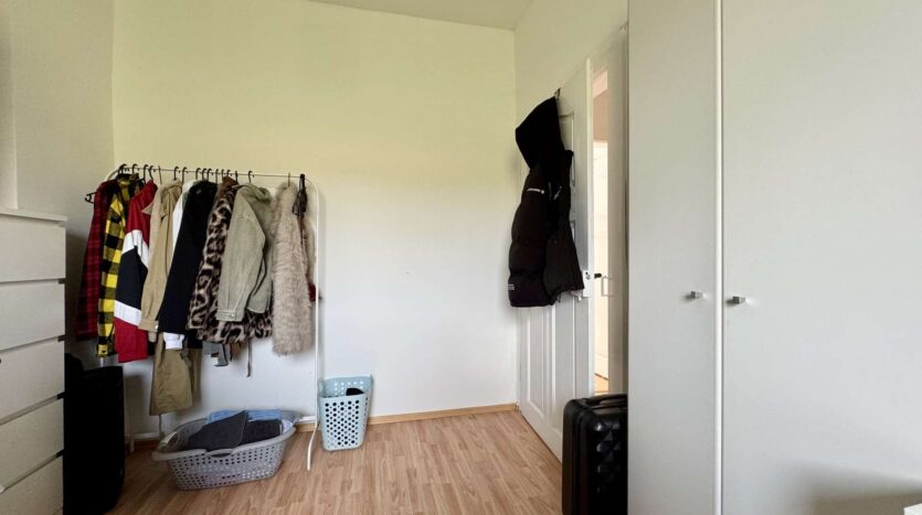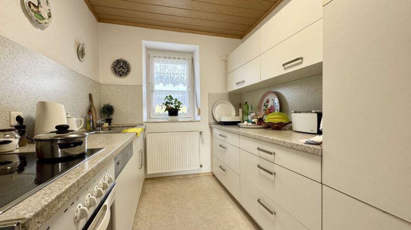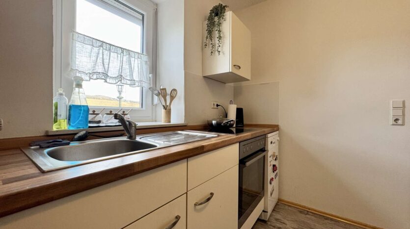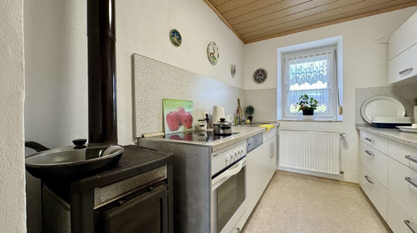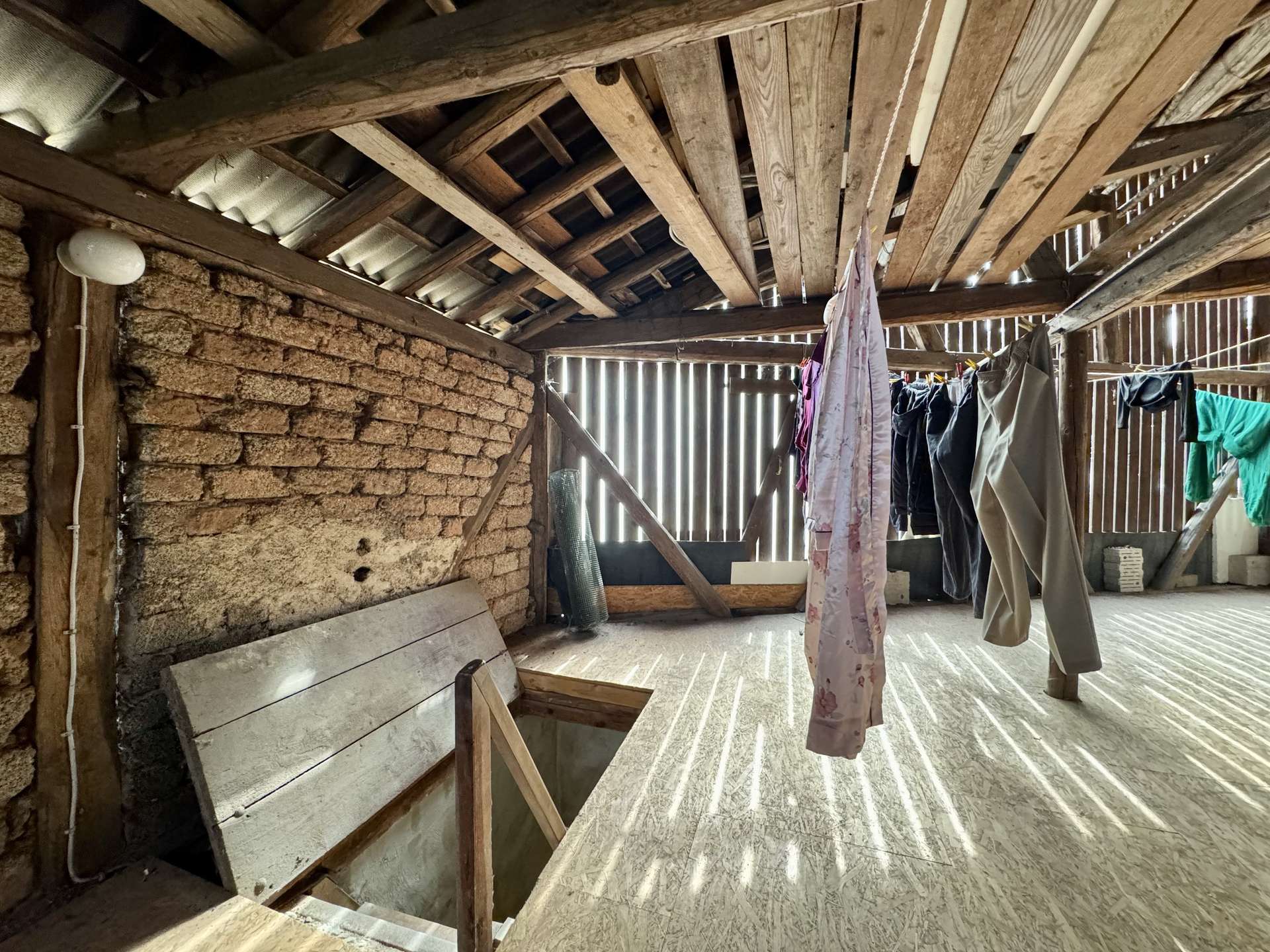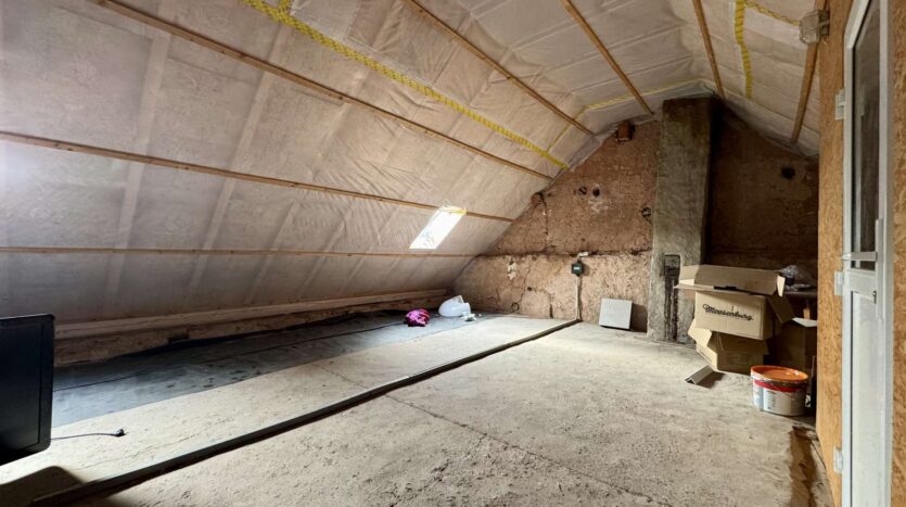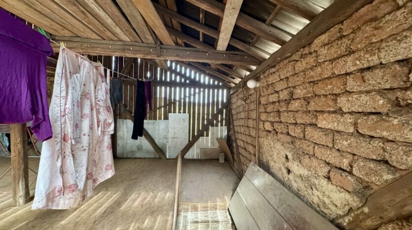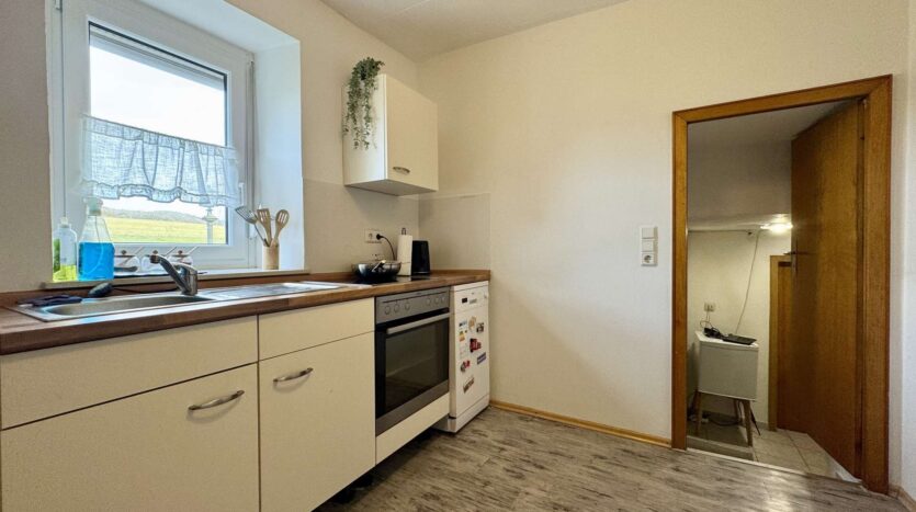 Das rechte Wohnhaus bietet eine Wohnfläche von ca. 70 m² und ist aktuell vermietet für 300 Euro KM. Vom Eingangsbereich führt ein Flur in das gemütliche Wohnzimmer und den großzügigen Küchenbereich. Zwei Stufen abwärts gelangt man in das Badezimmer sowie in einen praktischen Abstellraum mit Wasseranschluss für eine Waschmaschine. Eine steile Holztreppe führt zum Dachgeschoss der Scheune, das derzeit als Trockenraum für Wäsche genutzt wird. Im Obergeschoss befinden sich ein Schlafzimmer und ein mögliches Gästezimmer. Der Speicher bietet zusätzliches Ausbaupotenzial.