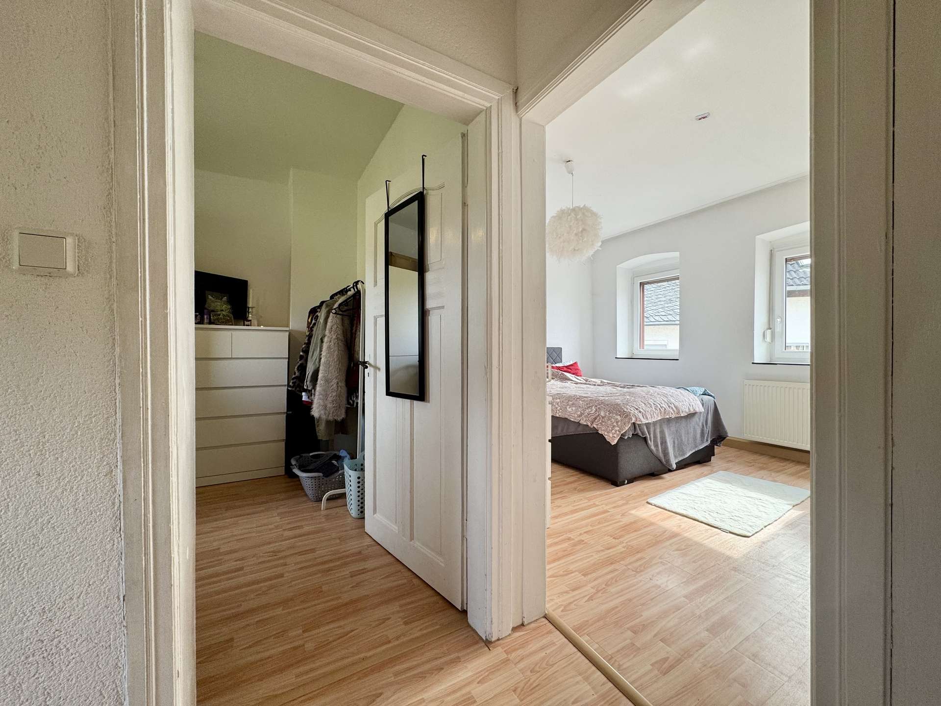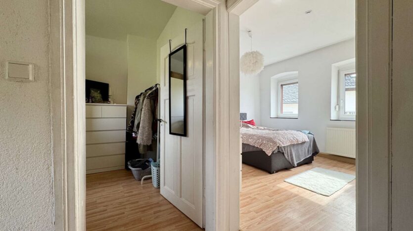 Im Obergeschoss des linken Hauses erwarten Sie ein Schlafzimmer mit angrenzendem Ankleidezimmer, ein weitläufiger Wohn- und Essbereich mit eigenem Badezimmer sowie ein weiteres Zimmer. Diese Etage lässt sich bei Bedarf als eigenständige Wohneinheit abtrennen.