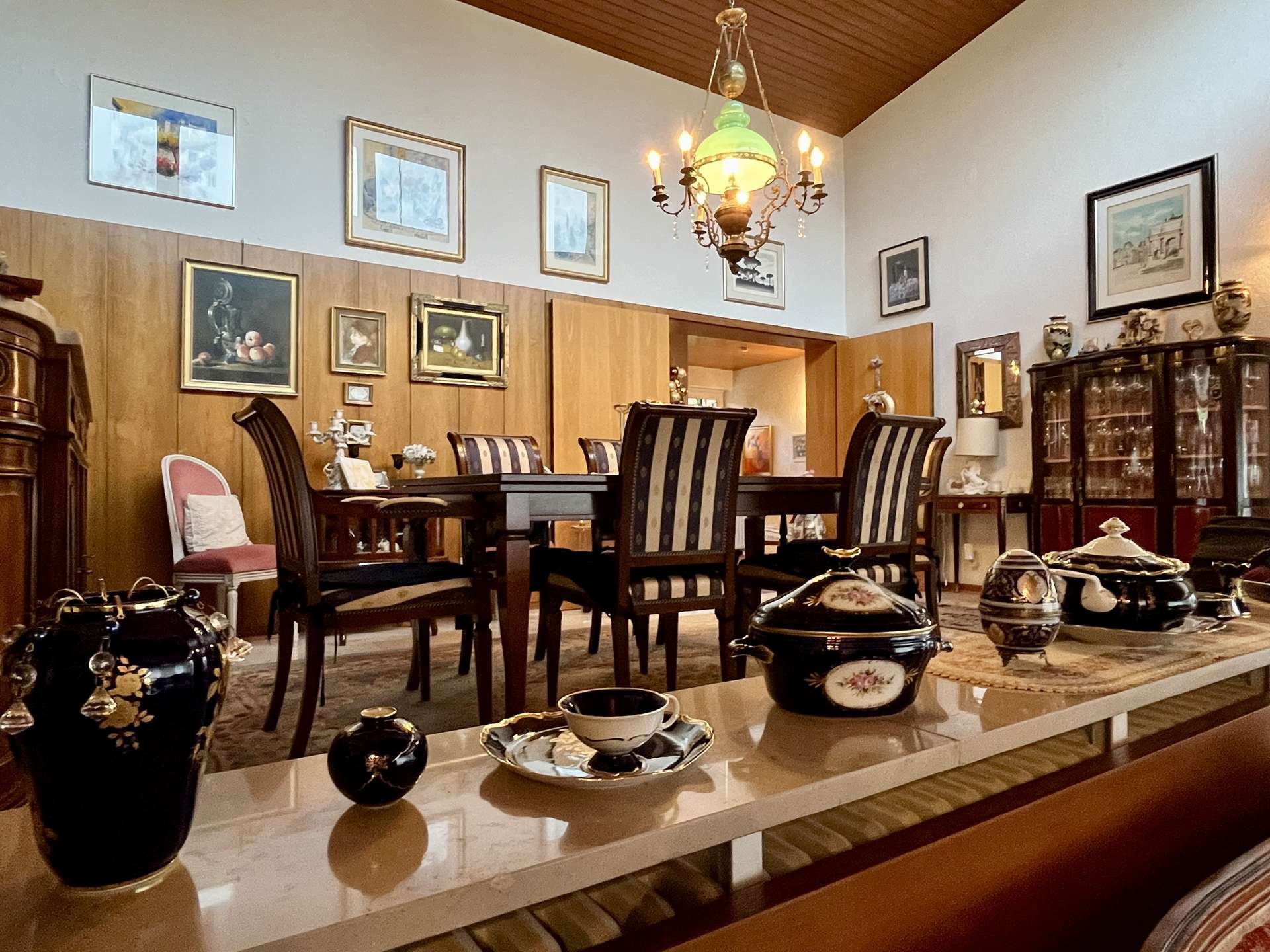 Die hochwertige Ausstattung des Hauses lässt keine Wünsche offen. Der Bodenbelag aus Marmor und Parkett verleiht dem Haus eine luxuriöse Atmosphäre. Eine Doppelgarage, ein Keller mit Sauna, Weißwein- und Rotweinkeller, viel Abstellfläche, Waschraum, Partyraum und Heizungskeller runden das ganze ab.